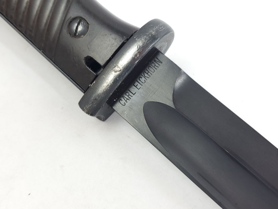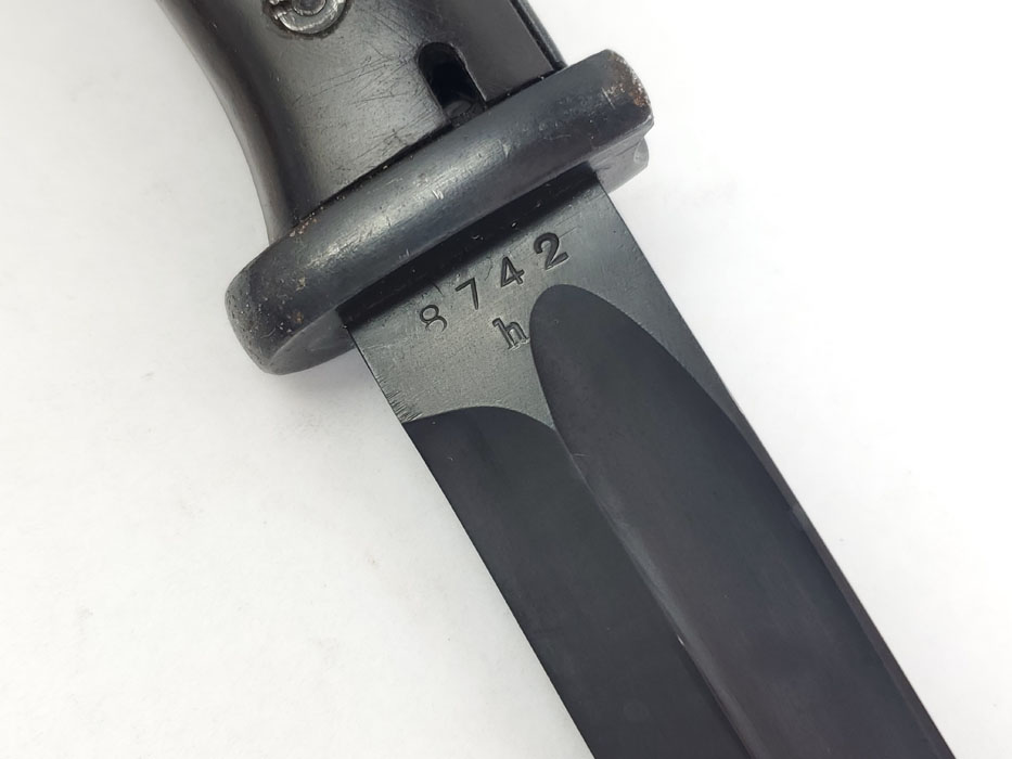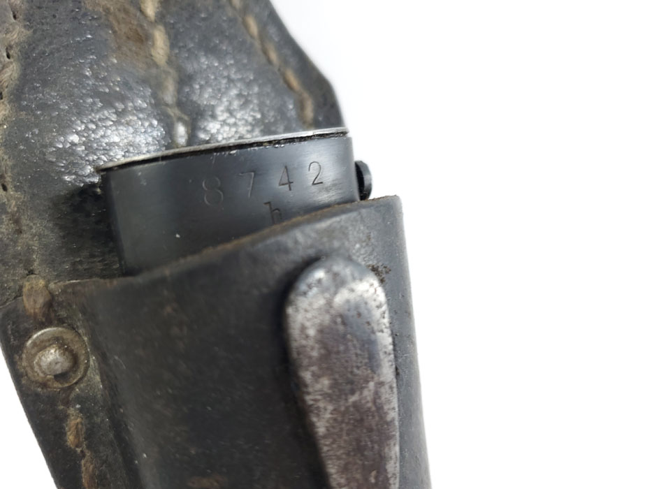 5/26/20 – This is a beautiful 1939 dated K98 bayonet with a matching numbered scabbard and black leather frog. The blade is near mint condition with minimal bluing loss and some light discoloration. Serial numbered 8742 h and maker stamped by Carl Eickhorn on the reverse. The handle is waffen stamped on the button and upper pommel of the handle. The black leather frog is in great condition with no maker stamps or markings. The scabbard has no dents or major issues, but there is light surface scratching and finish loss accompanied by light discoloration / patina. The scabbard is matching serial numbered as well.