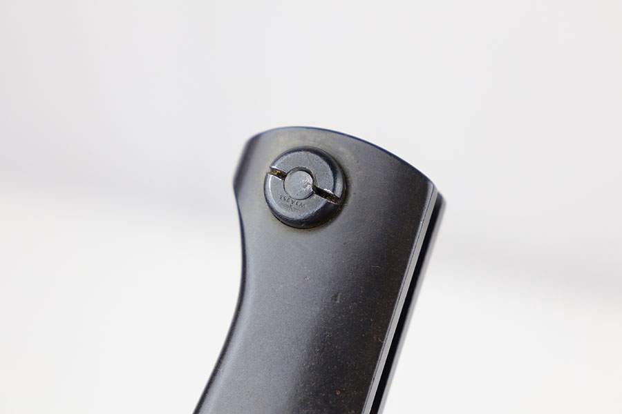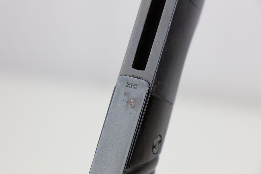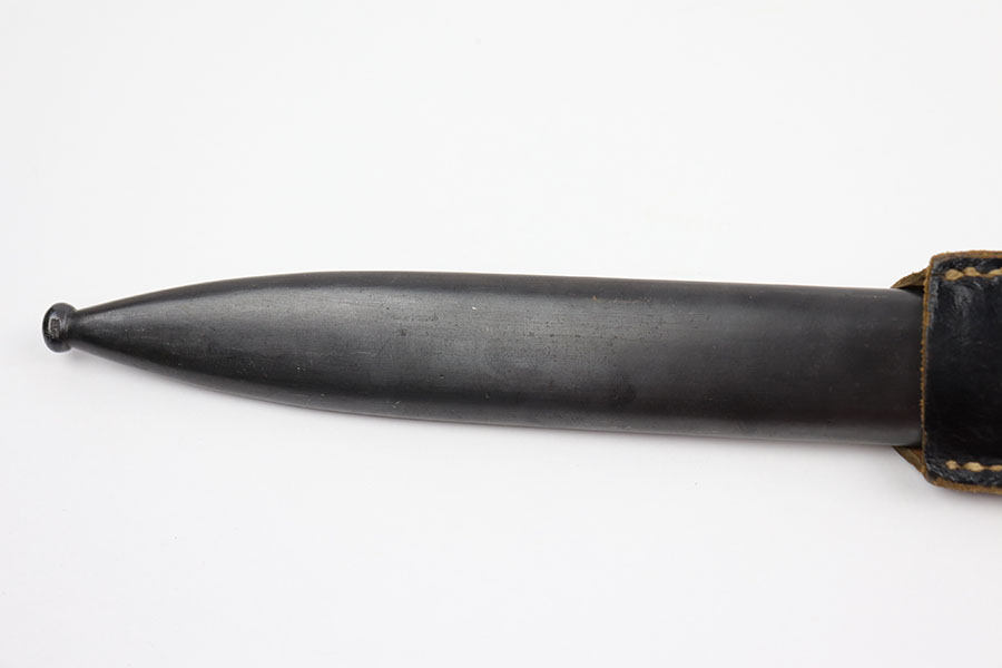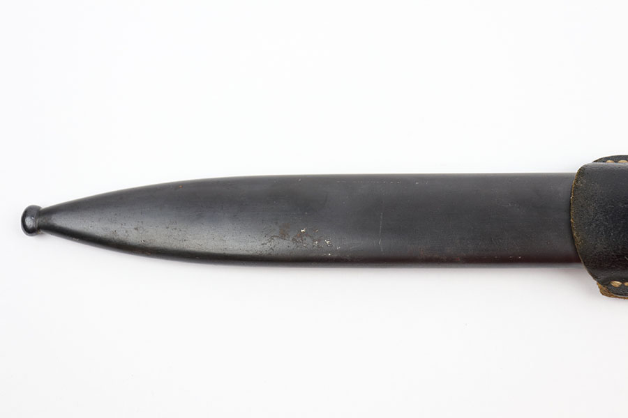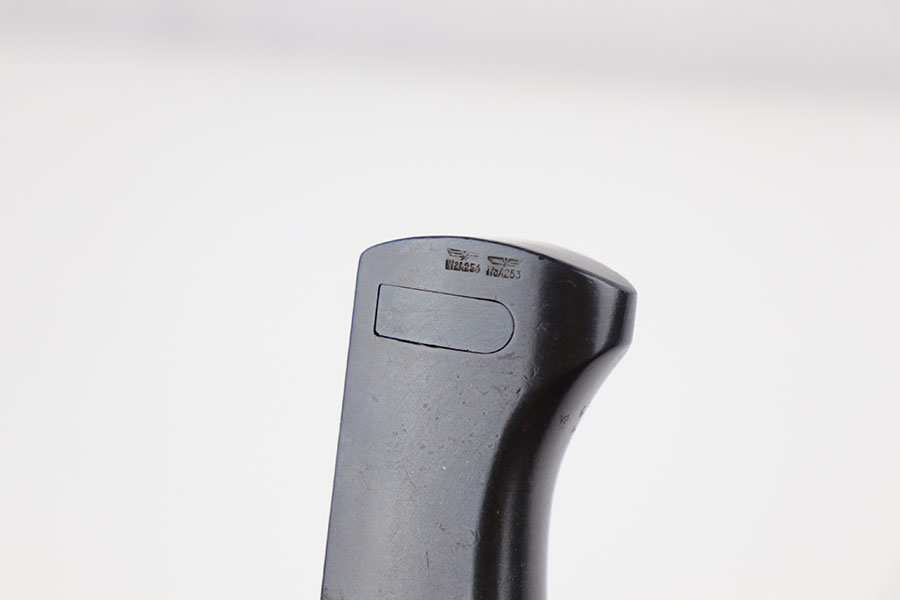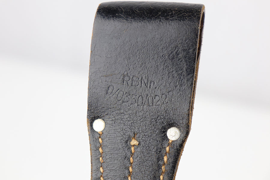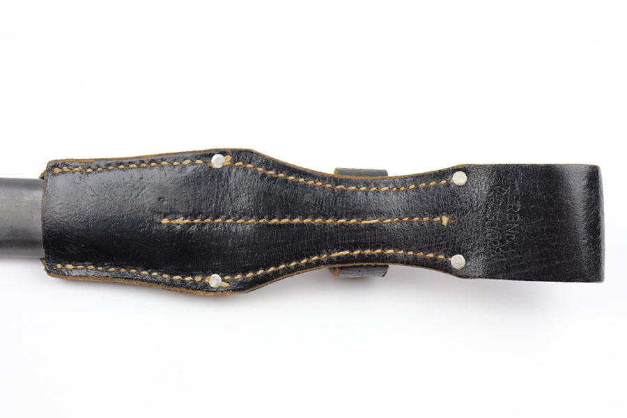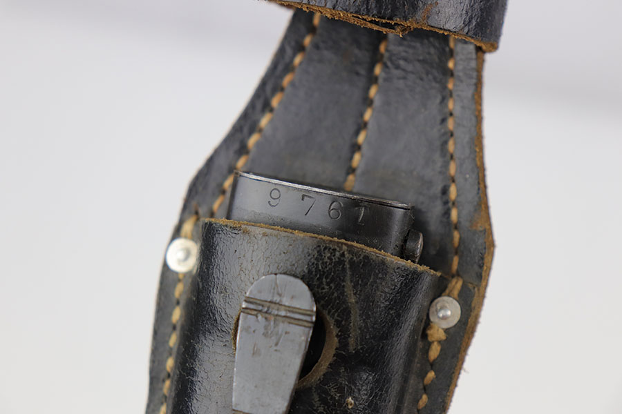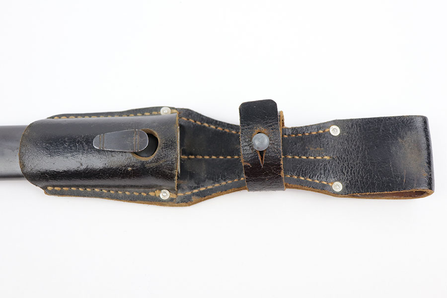 9/3/19 – This is a minty condition K98 bayonet made in 1939. The bayonet and scabbard are matching serial numbered 9761. The blade has almost all of the original finish still in tact. The scabbard is in similar condition, but does have a few small areas of rust / speckling along one of the edges/sides. Comes with an excellent leather frog that could possibly be police from the marking on the back, but we’re not 100% sure.