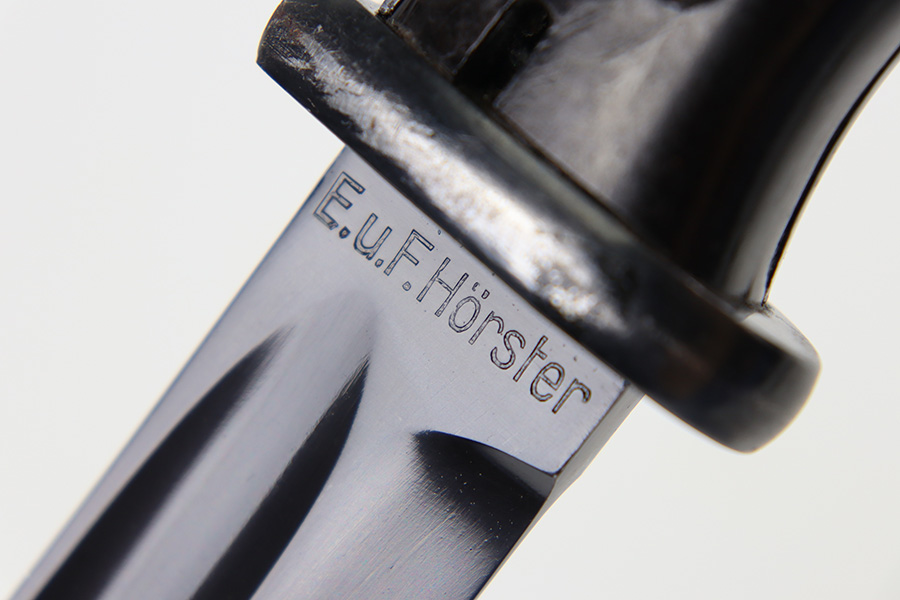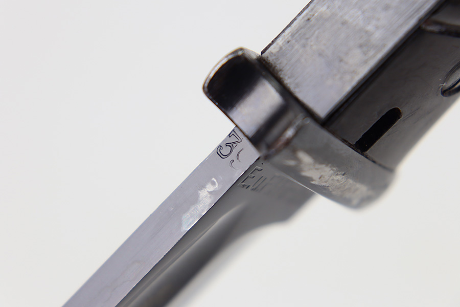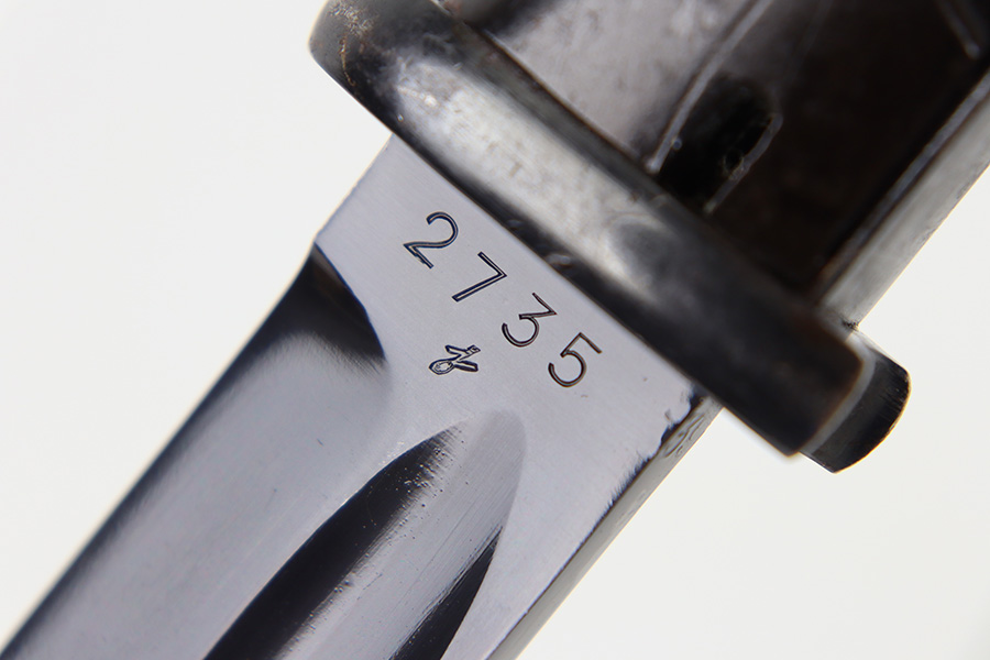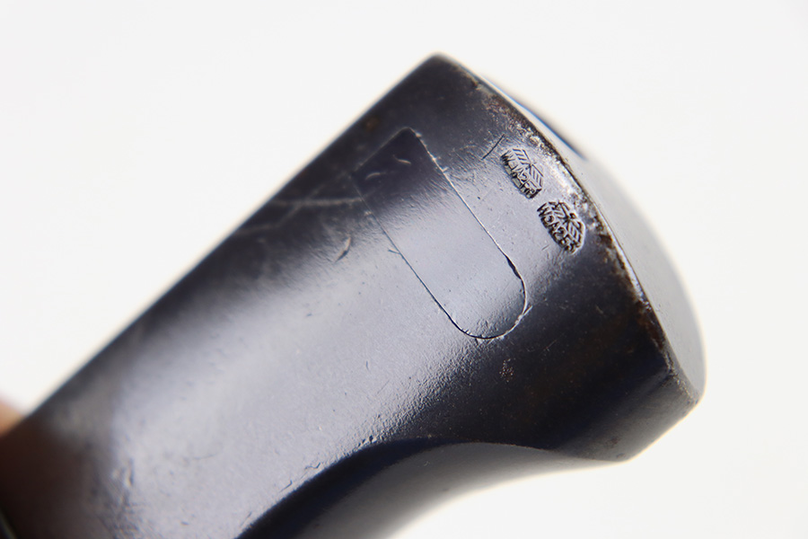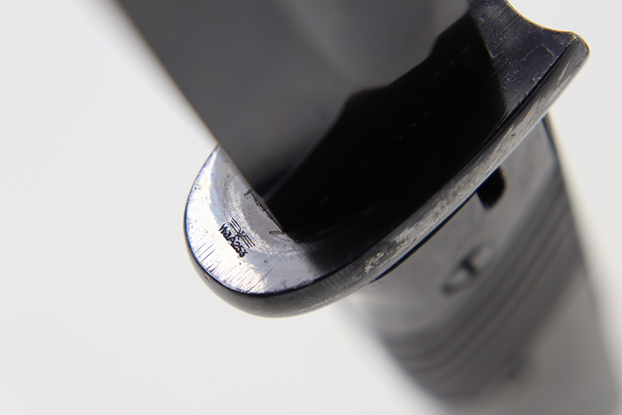 10/26/23 – This is an original 1939 dated K98 bayonet. The bayonet is in excellent condition, and comes with a rare, desirable canvas frog. These were often found with / issued to the DAK. Unfortunately, the scabbard that’s included is not an original K98 scabbard, but instead some kind of European manufacture of similar composition. The scabbard is in great condition with mild patina and a “S” stamped near the mouth. The blade fits nicely inside the scabbard. The blade has minimal surface wear and some minor imperfections along the edge from previous use. Nice markings on the ricasso: serial number on one side, and manufacturer on the other. The hand guard and pommel have light patina throughout. Excellent grips.