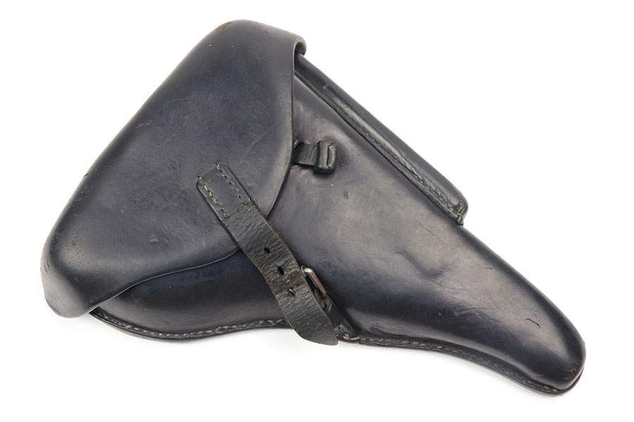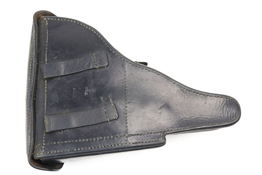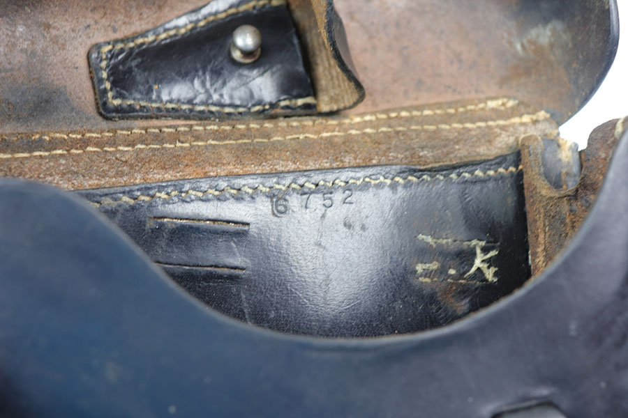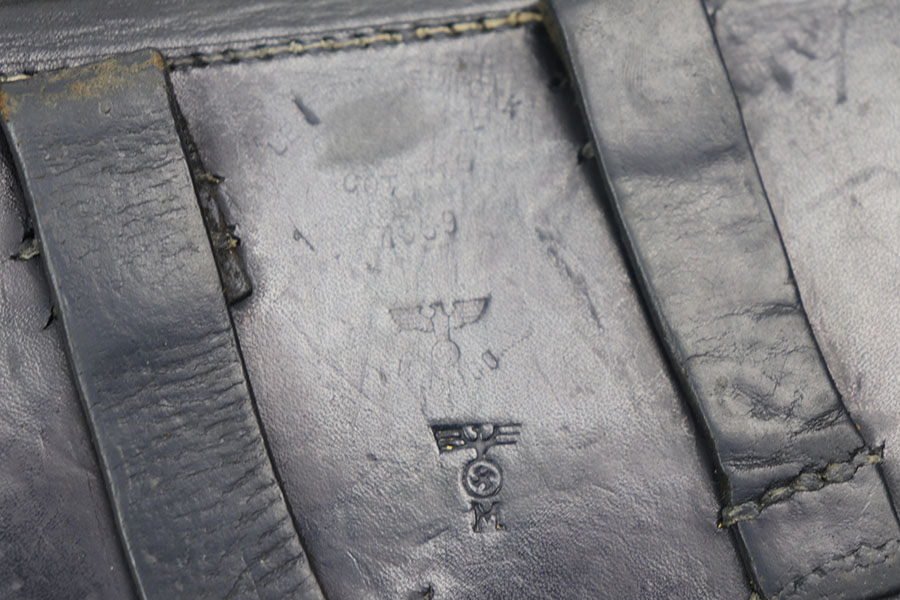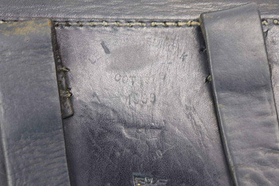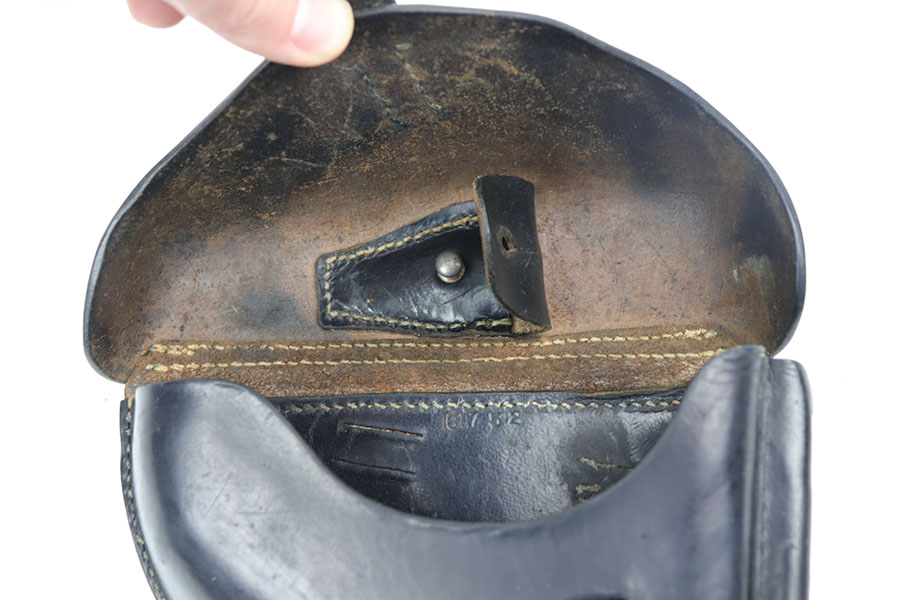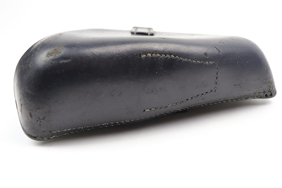 10/28/20 – This is an original 1939 dated Kriegsmarine Luger holster. The holster is maker stamped and dated on the back leather along with a waffen military proof and an eagle/M Kreigsmarine proof stamp. The maker stamp is very faint and hard to decipher, but the 1939 date can be seen – see photos. The waffen and kriegsmarine proofs are stronger stamps. The black leather is in great condition overall with normal signs of aging. The stitching is all original, but there are about 5 loose stitches where the lid attaches to the body of leather – a common flaw and doesn’t affect functionality or integrity of the holster.