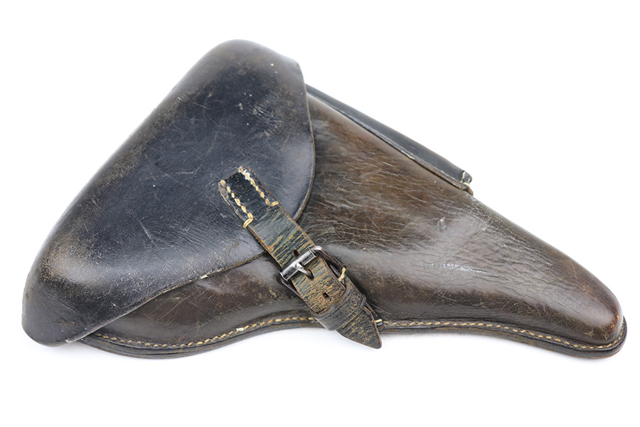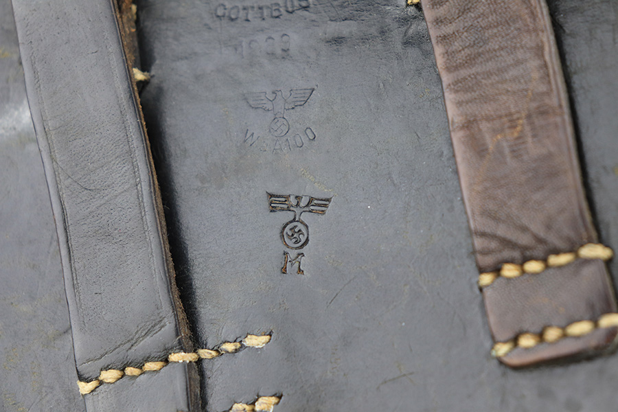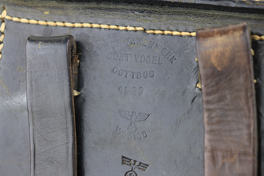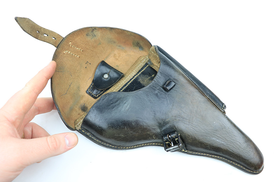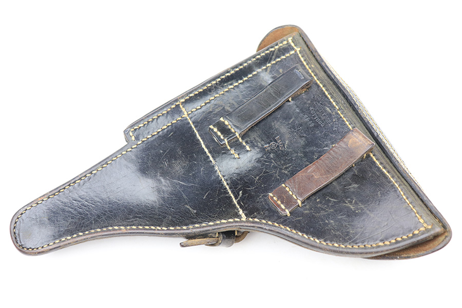 1/6/22 – This is an original 1939 dated Kriegsmarine Luger holster. These holsters have become increasingly scarce and collectible. The holster features a strong eagle/M Navy proof stamp on the back leather. There’s also a typical maker stamp, date stamp, and waffen proof stamp. The black leather is in great shape overall with some surface wear and aging throughout. Clean interior leather and no stitching issues.