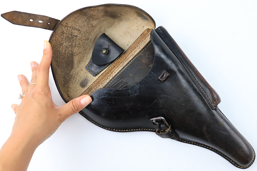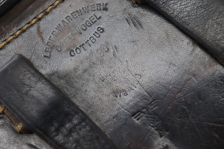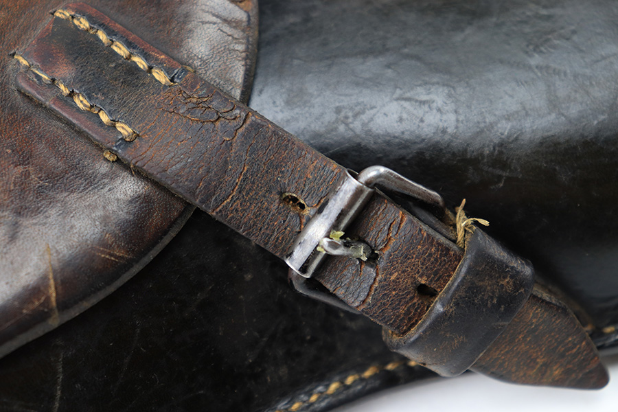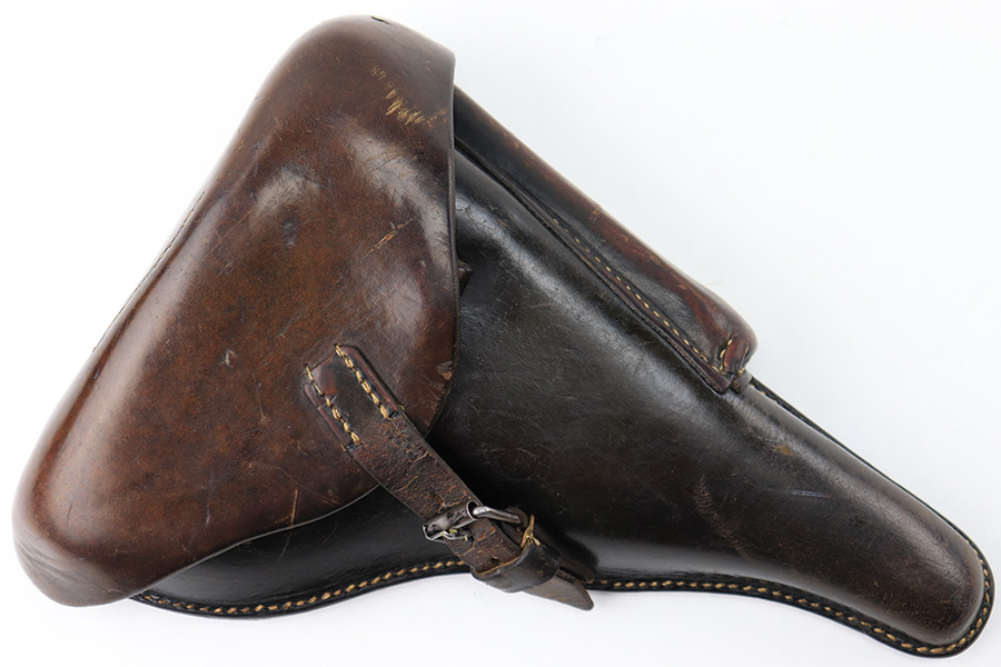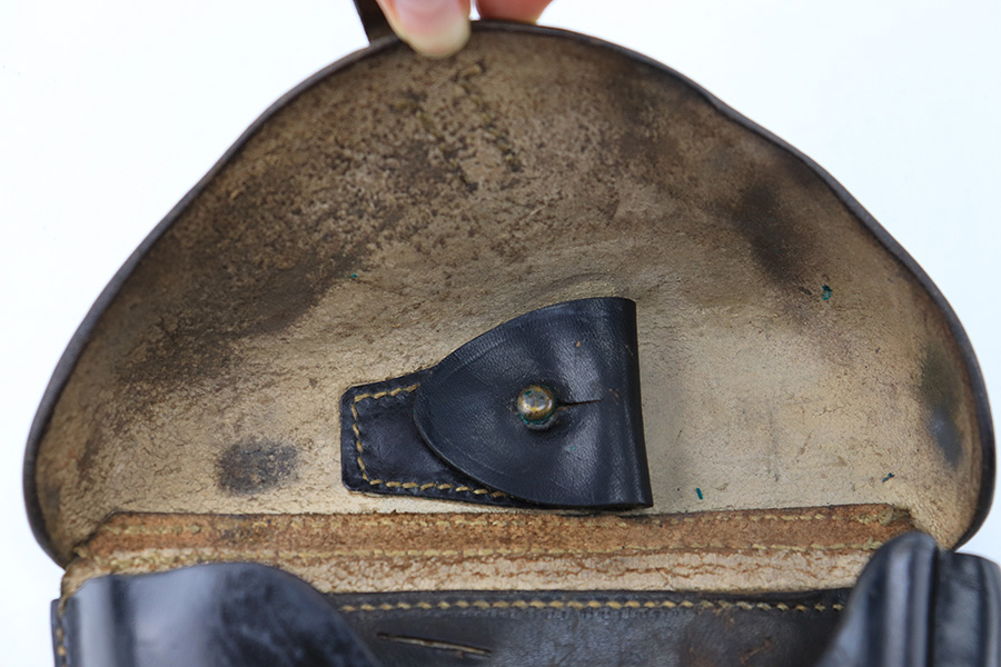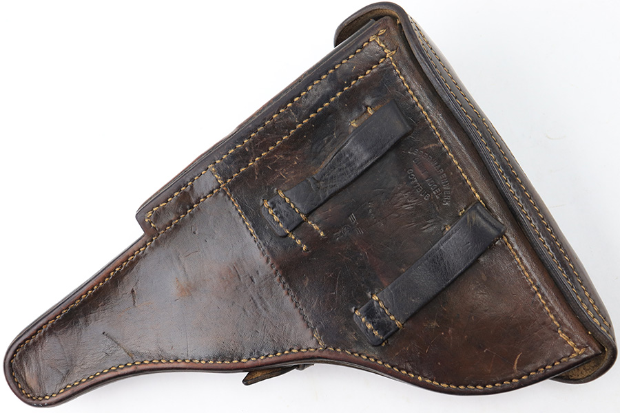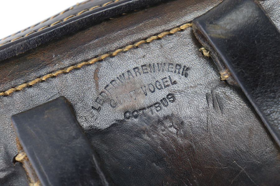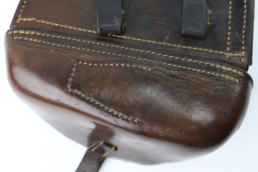 8/18/23 – This is a rare variation, WW2 German Navy Luger holster. The holster is stamped on the back leather with a maker, date, waffen military proof stamp, and a Kriegsmarine eagle/M proof. All markings are visible, although the waffen proof is slightly faded with age. The holster is in great overall condition with all original leather and stitching. Areas of the exterior leather have lost or thinning amounts of black dye. This is mostly on the lid and magazine pouch. There are also typical surface scuffs and imperfections throughout the exterior leather. The interior leather is clean. Normal pliability throughout. The stitching is in great overall condition with no major issues or notable flaws.