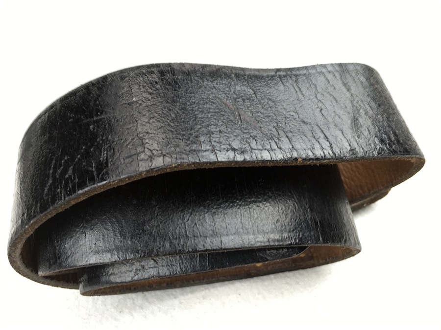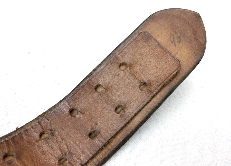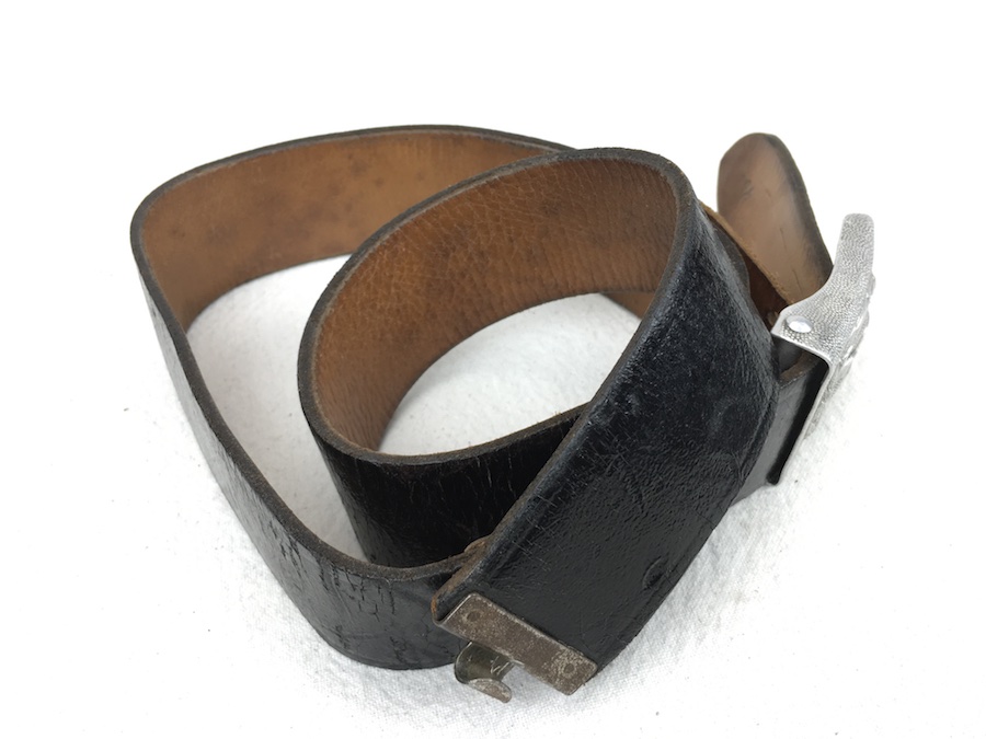 9/24/19 – This is an original Luftwaffe German Belt and Buckle from early WW2. This buckle is a early war variation with a luftwaffe eagle on the front of the buckle. The buckle and prongs are aluminum and is maker marked “FR” and the numerals “39”. Some smoothing of the eagle image from use. The belt is soft leather with black exterior and brown interior. The interior has an ink mark “96” and is 39″ in total length. The stitching is excellent and all original. Minor surface cracks and wear on the exterior of the belt.
