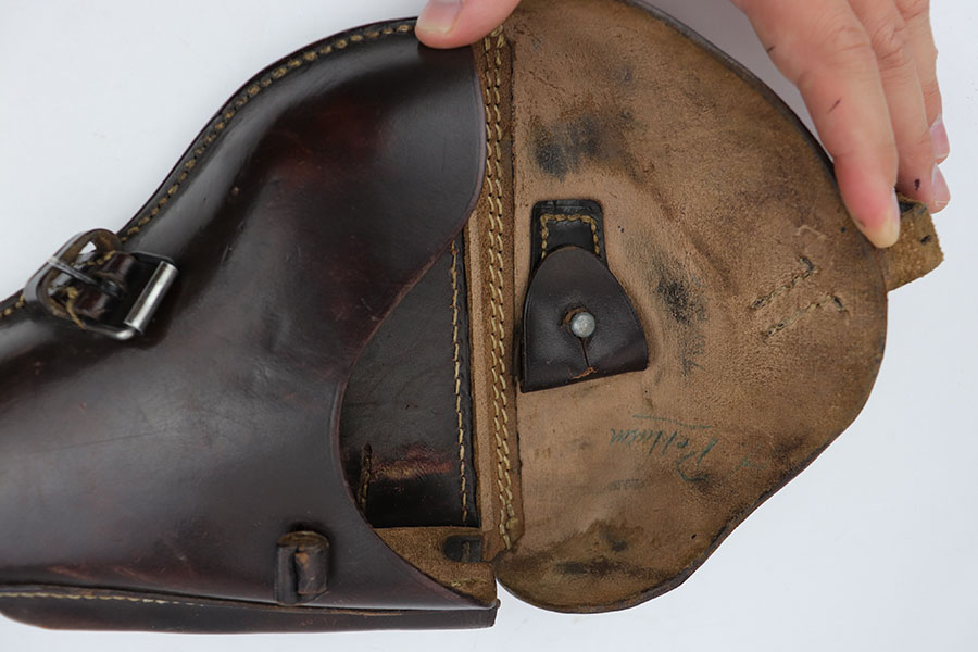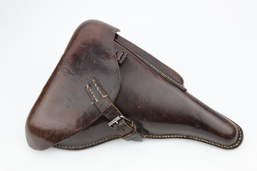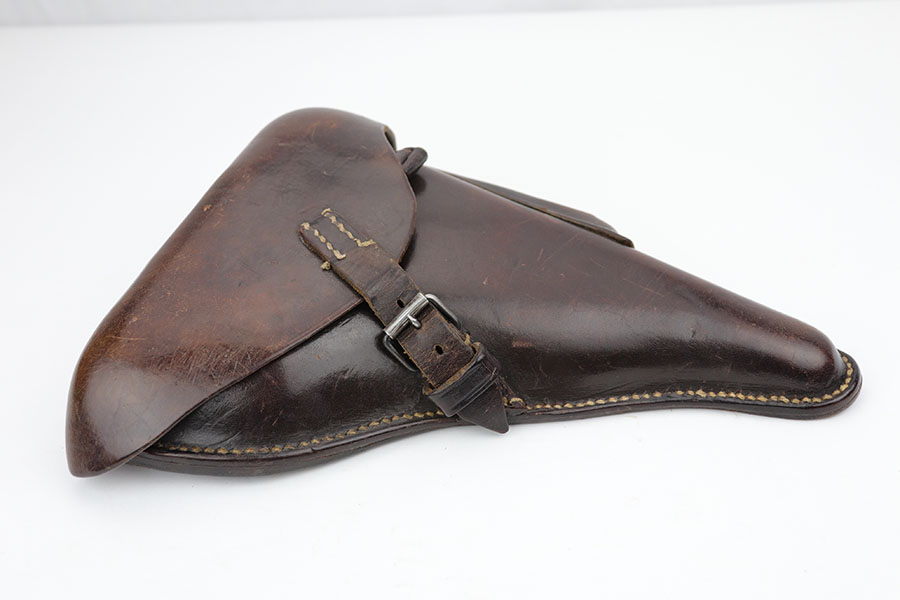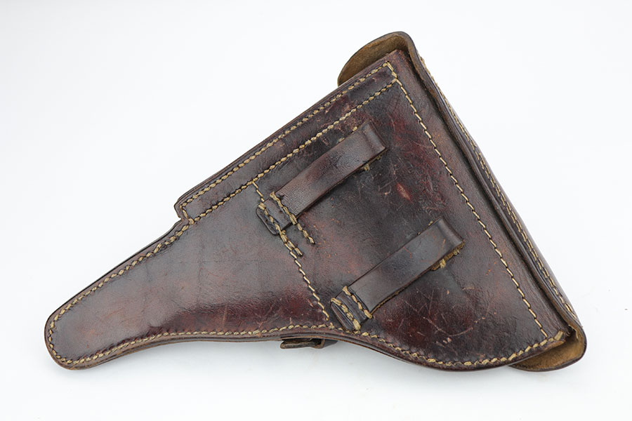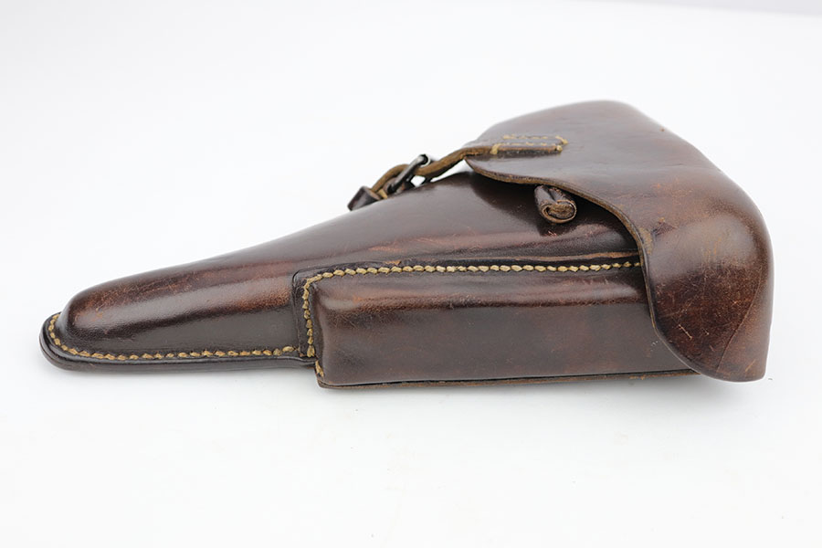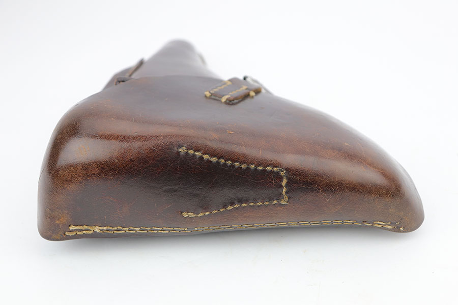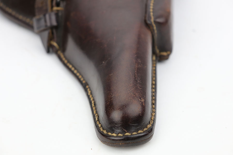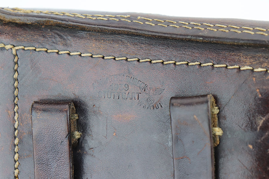 9/25/19 – This is an original 1939 dated Luger holster from WW2. The holster is maker stamped and dated on the back with a waffen eagle WaA101 military proof stamp. The maker stamp is a fairly light stamp but still somewhat visible. The reddish brown leather is in great condition and near excellent with light pliability and no major issues. Fairly clean interior leather as well. The stitching is all tight and in tact as well. A very nice collectible holster.