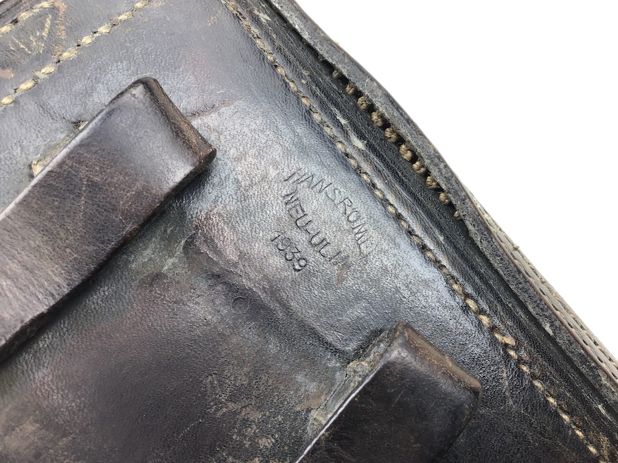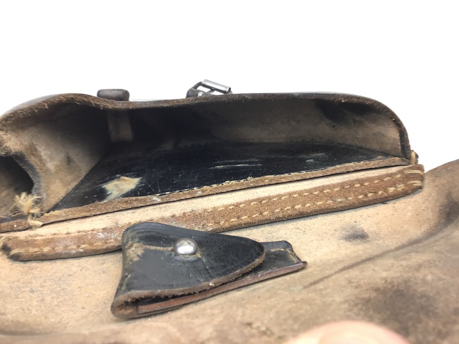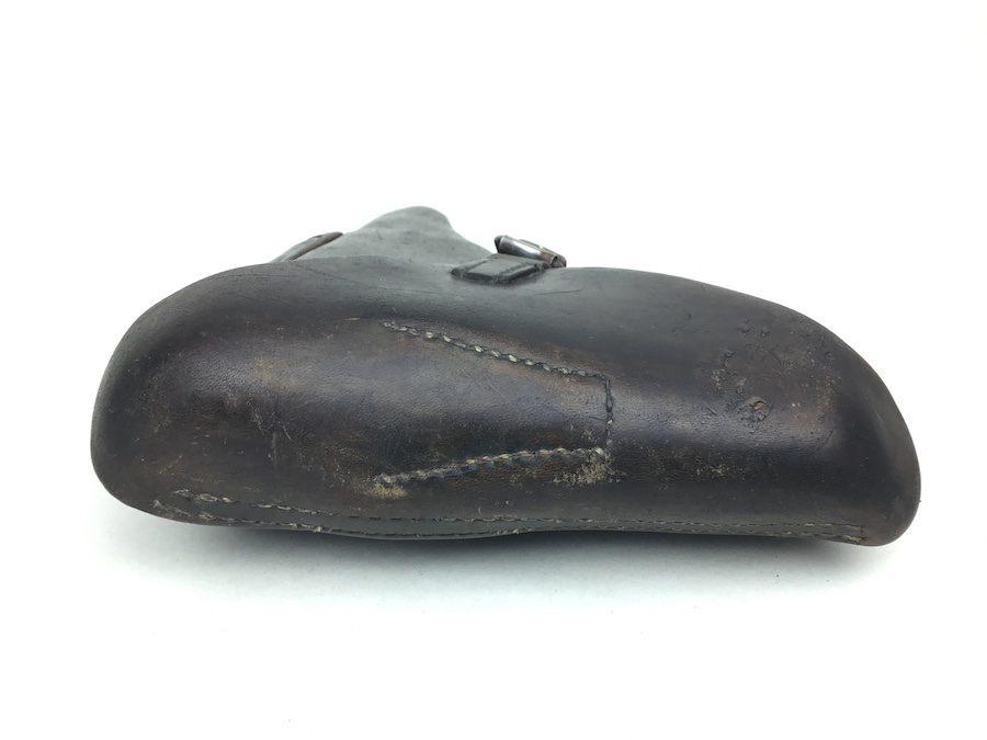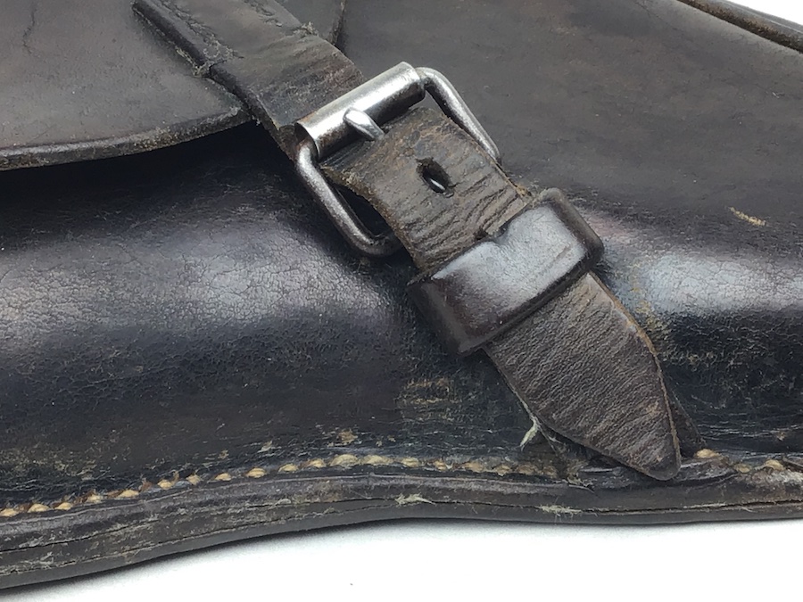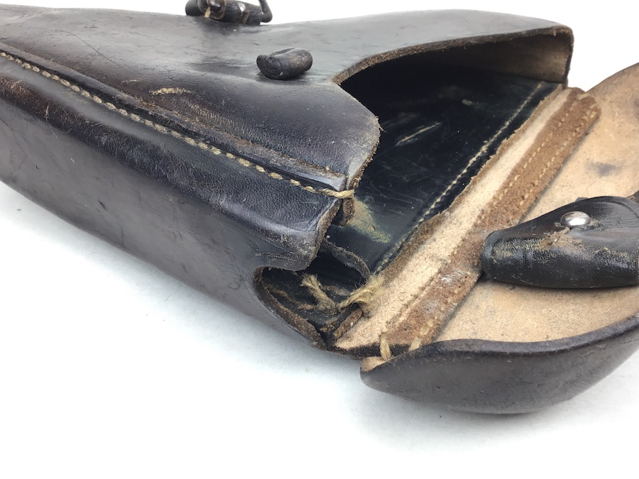 1/17/20 – This is an original 1939 dated Luger holster from early WW2. The back of the holster is maker stamped, “Hans Romel” along with 1939. The leather is still firm and has typical use wear and some surface imperfections. The closure flap hinge has a few loose threads, however, it is secure and all original stitching. The remainder of the stitching is all tight and original. Clean interior with secure lift strap. A very nice holster.