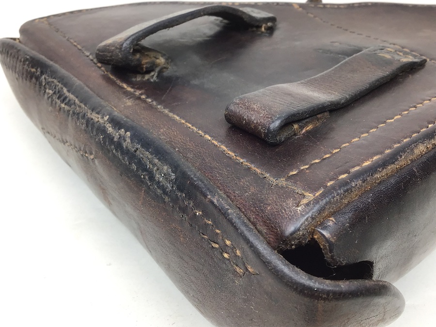 7/20/20 – This is an original 1939 dated Luger holster from WW2. The back of the holster is maker stamped, “G. J. Ensink” along with 1939 and Waffen proof WaA163. The leather is still firm and has minimal wear. Clean interior with secure lift strap. Some loose stitching on the closure flap and belt loops. Otherwise a fairly nice holster. Priced accordingly.