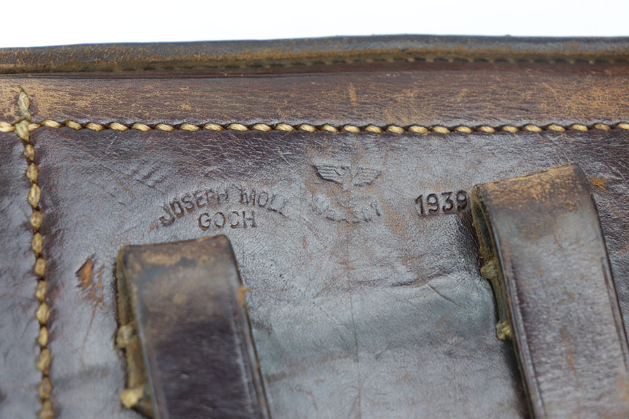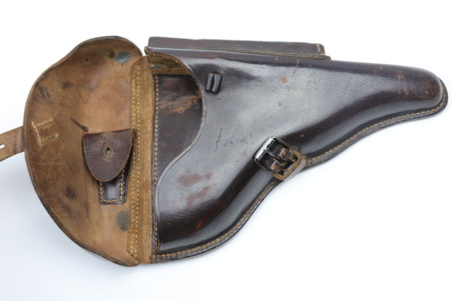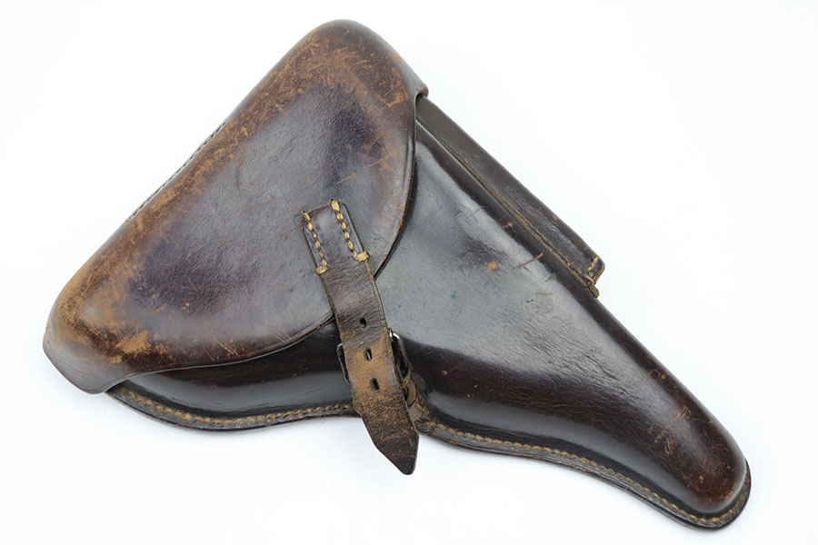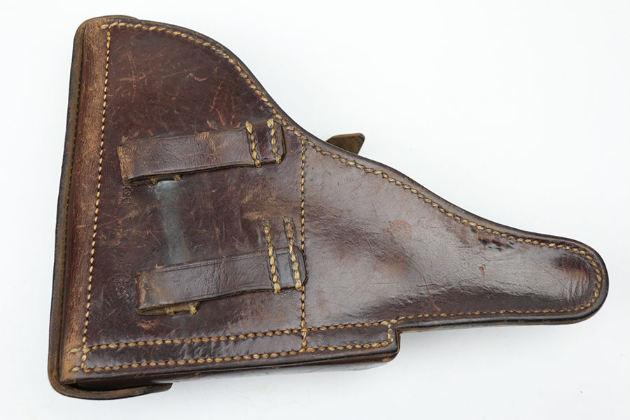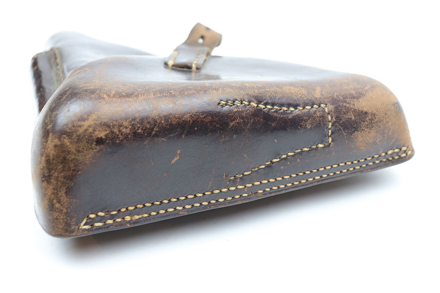 11/30/20 – This is a very nice, near excellent condition 1939 luger holster. The holster has strong dark brown leather and excellent stitching. No notable stitching issues. The leather is strong with some light surface scuffing and signs of use, but generally very clean leather. Clean interior as well. The back leather is maker stamped, waffen proofed, and dated.