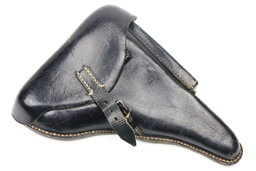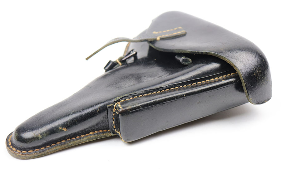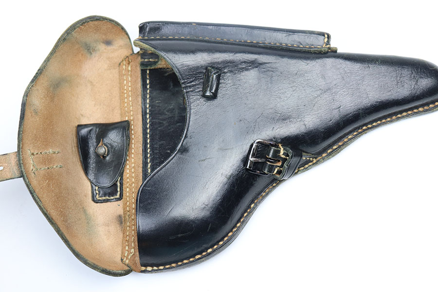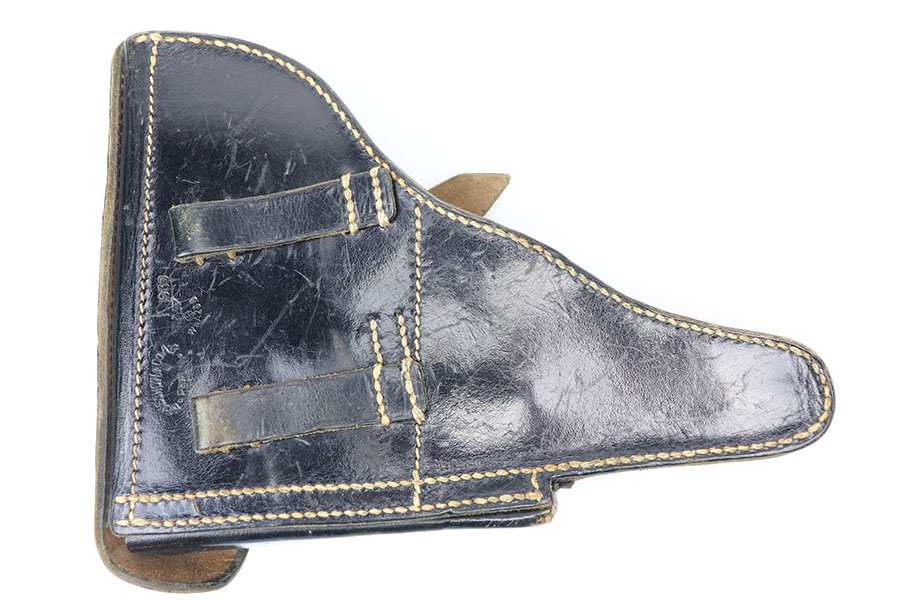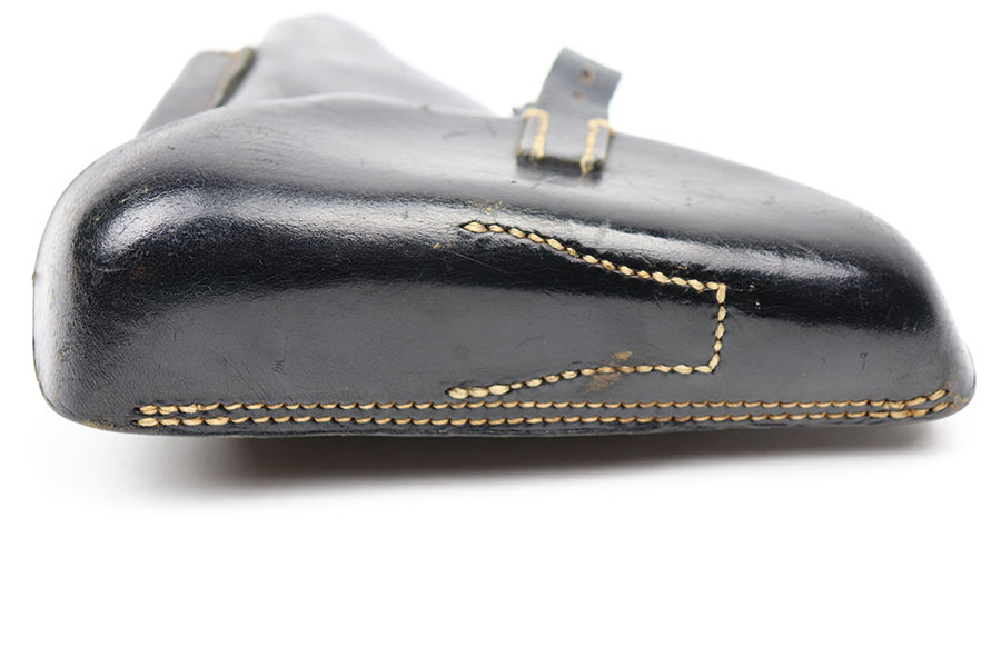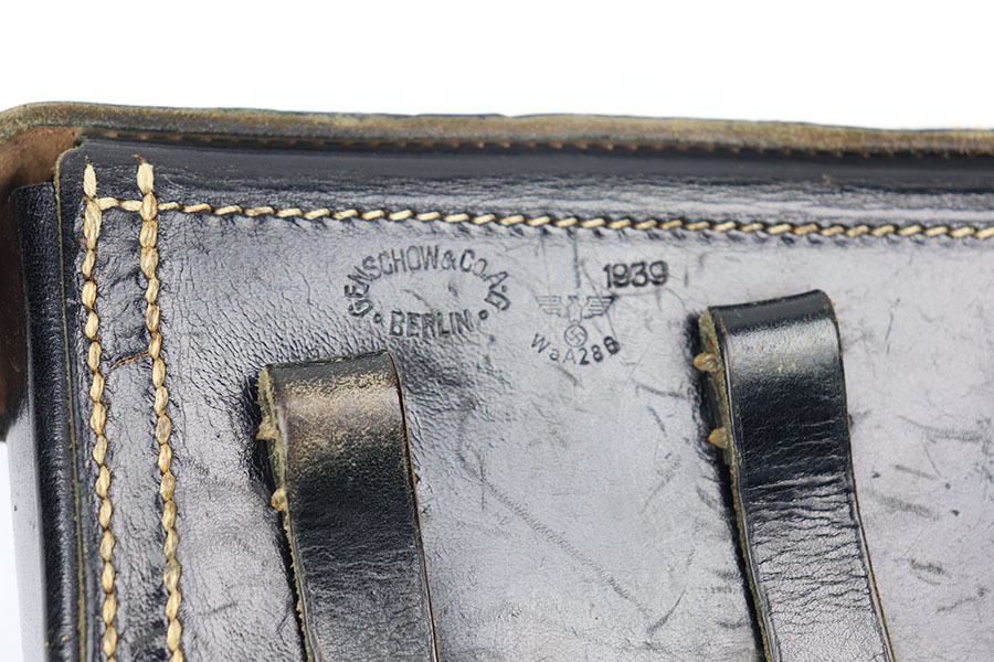 4/8/21 – This is an original 1939 Luger holster in great overall condition. Very nice black leather is pliable and shows signs of use but no major damage. All original stitching is strong and in tact. The interior leather is fairly clean. The back leather is stamped with crisp maker marking, date, and waffen proofs.