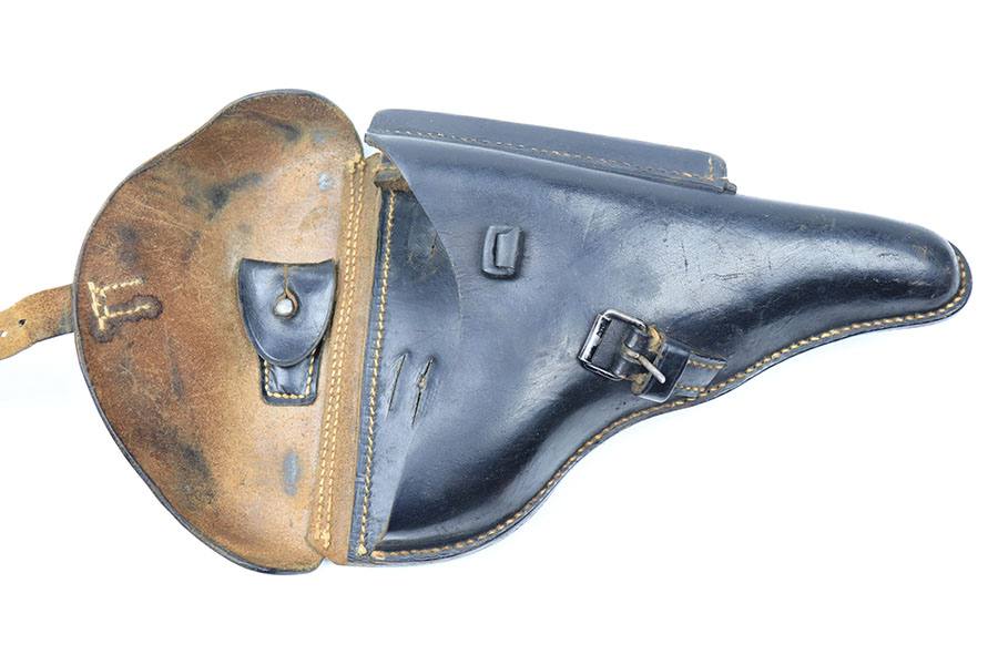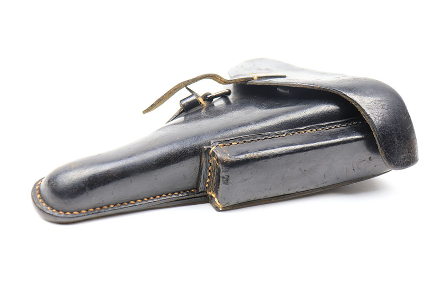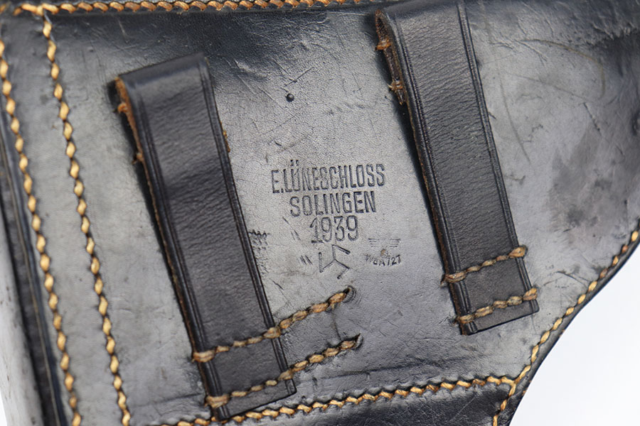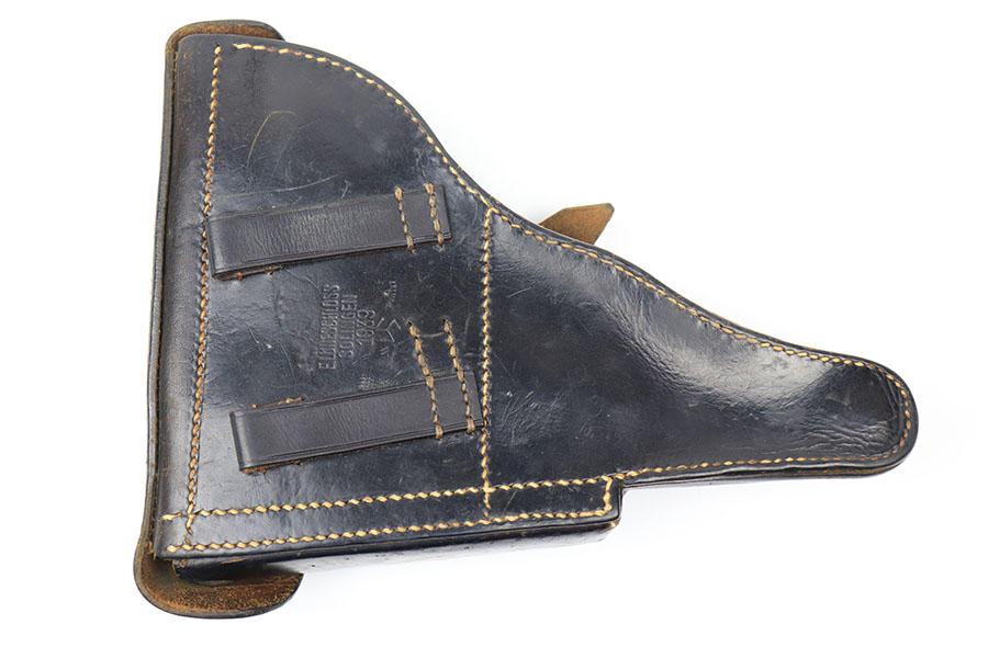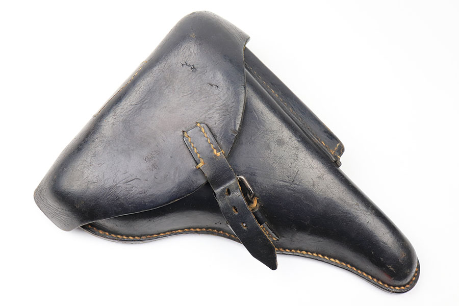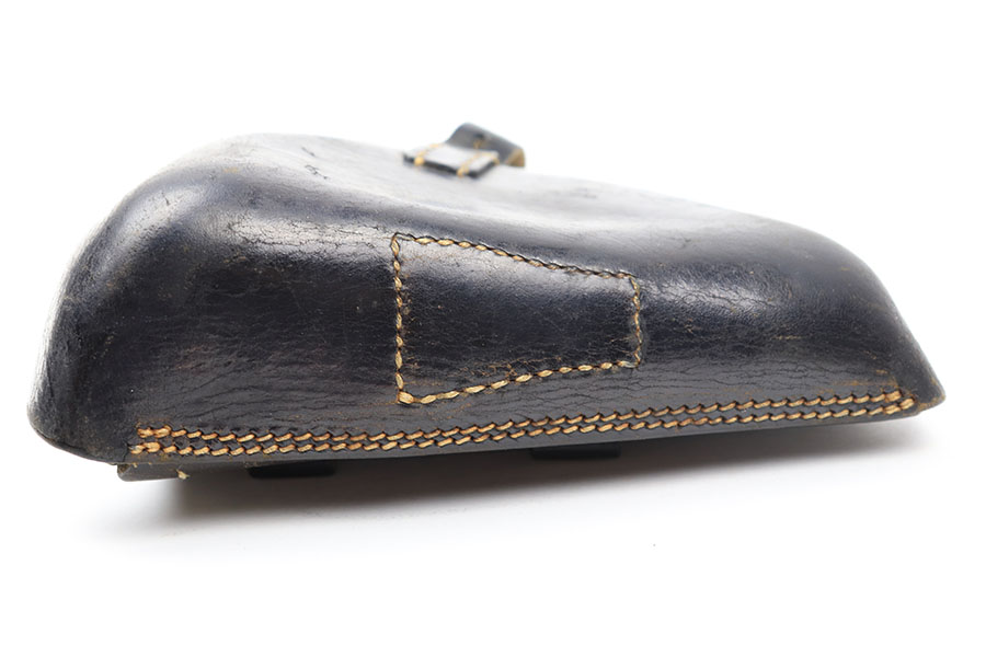 6/1/21 – This is a very nice 1939 dated Luger holster from WW2. The back of the holster has a crisp maker marking and date stamp, along with a small waffen eagle proof stamp. The black leather is clean with normal pliability and some mild signs of use but no excessive wear . All original stitching is intact.