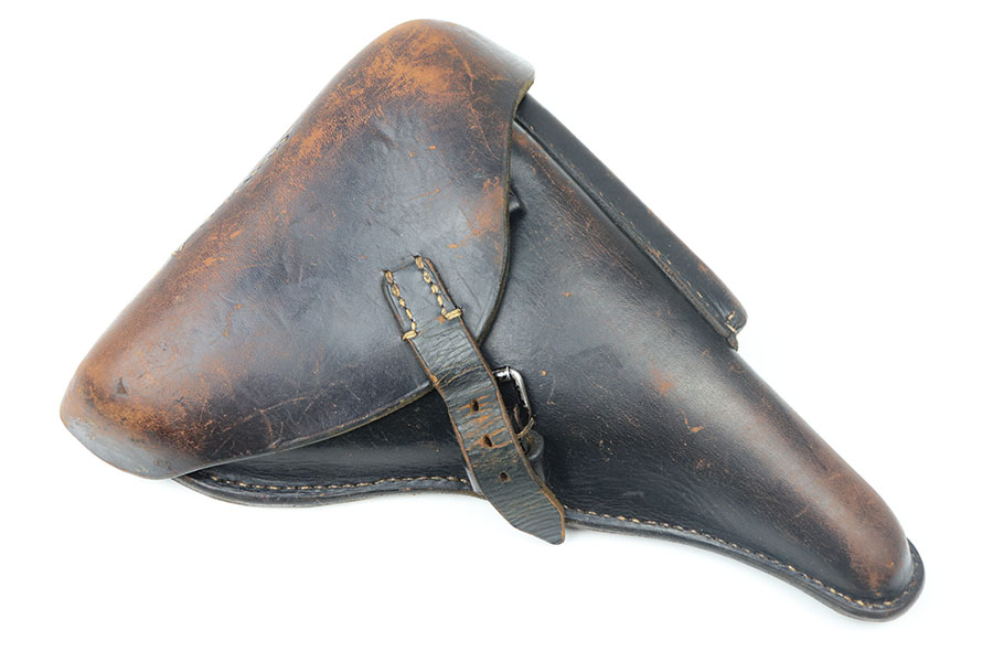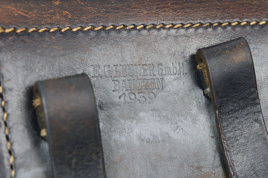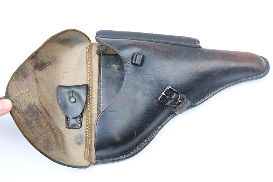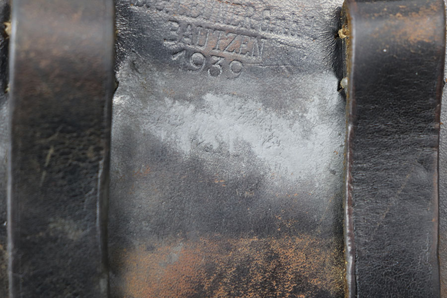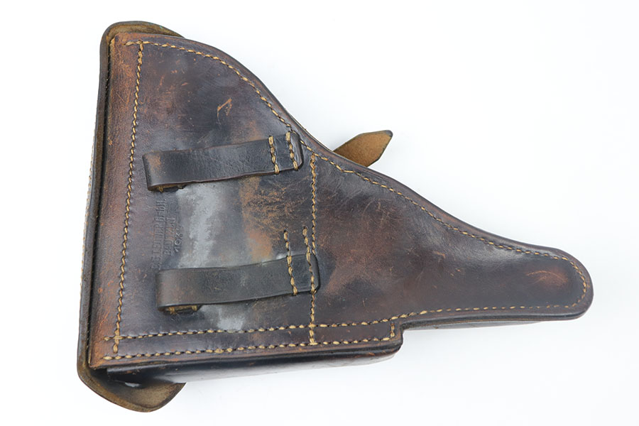 6/17/21 – This is an original 1939 Luger holster. All original leather and stitching. The back leather is dated, maker stamped, and waffen proof stamped. The waffen is faint yet still visible. The leather has normal pliability and some mild surface fading on the lid and toe of the leather. The stitching is all intact without any notable issues.