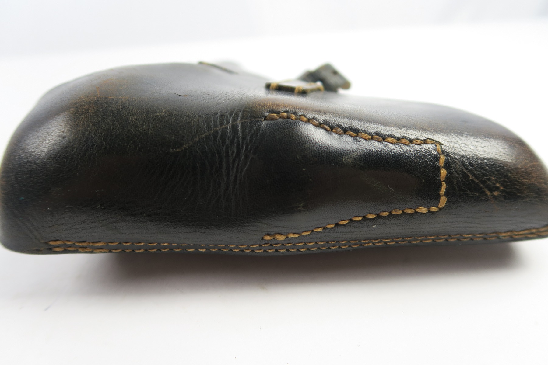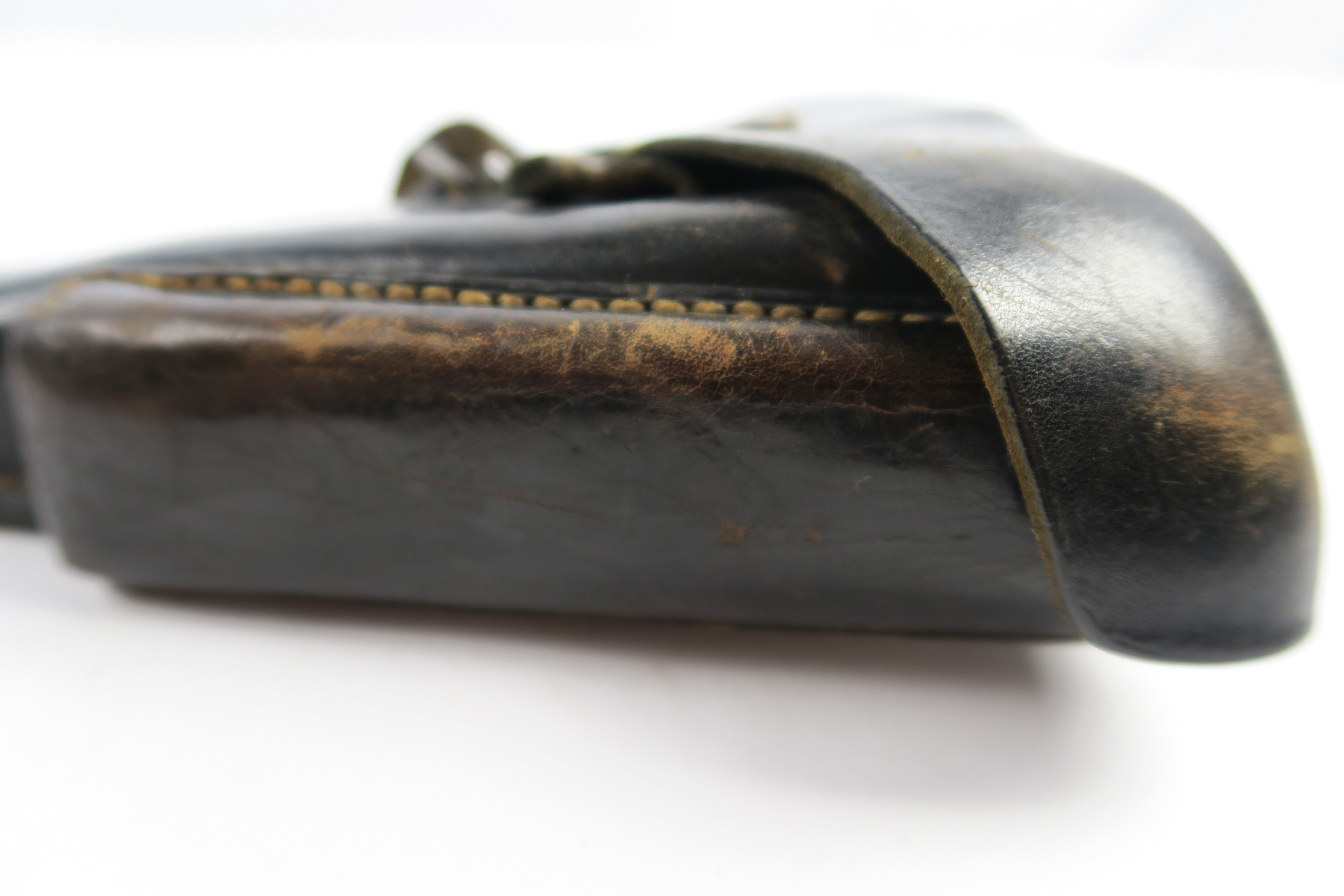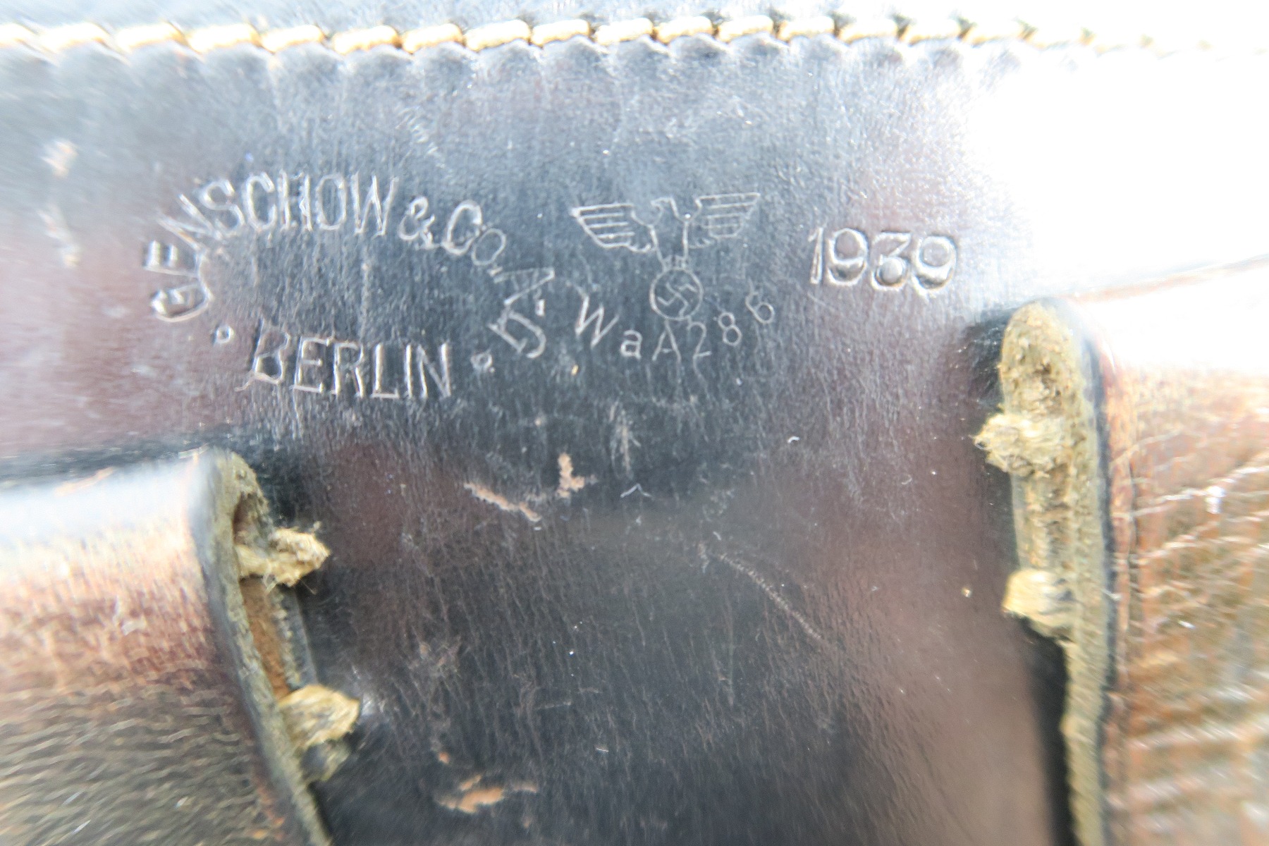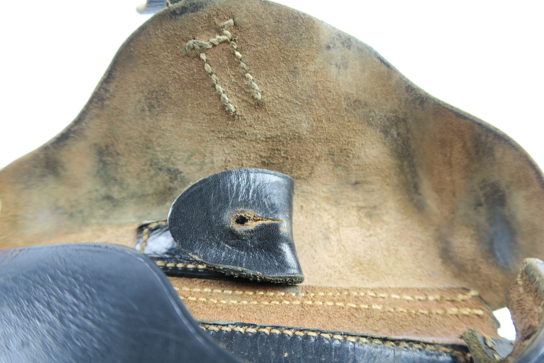 4/27/18 – This is an original 1939 dated Luger holster from WW2. The back of the holster is maker stamped with a waffen WaA286 military proof and 1939 date stamp. The leather is lightly worn and shows signs of having held a Luger for a while. The leather is soft and pliable and the closure strap has some surface wrinkling and light cracking. The main leather is lightly wrinkled with normal wear. The stitching is all tight and original. The back toe of leather has a name and number “11023” lightly scratched on. This seems like a German’s writing / name. A very nice holster with a little character from WW2. Guaranteed original.