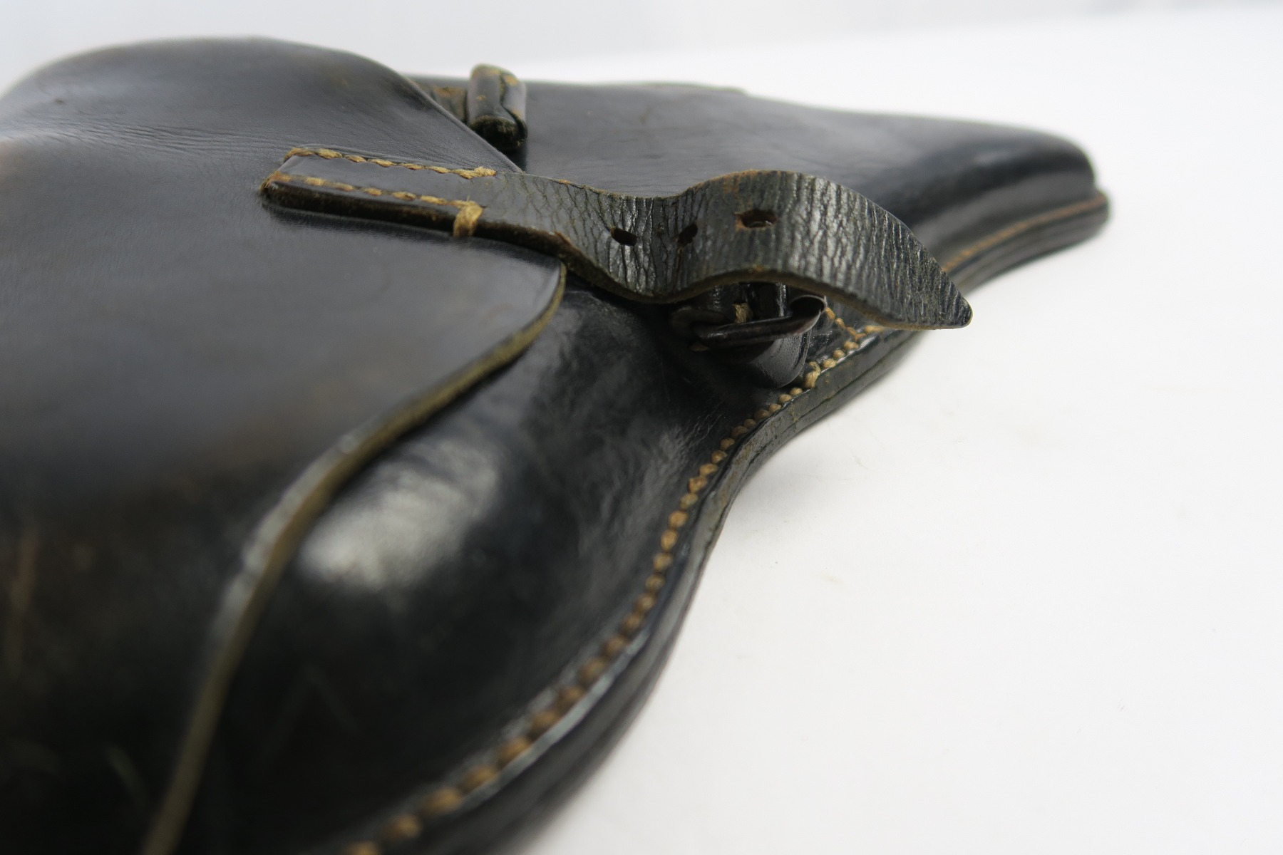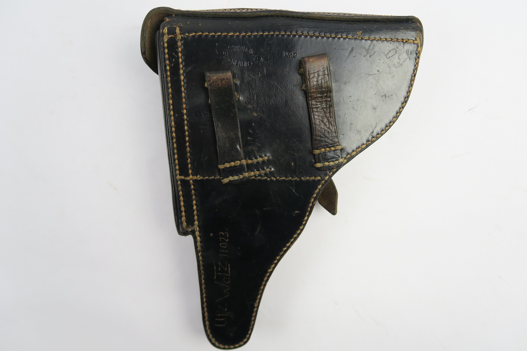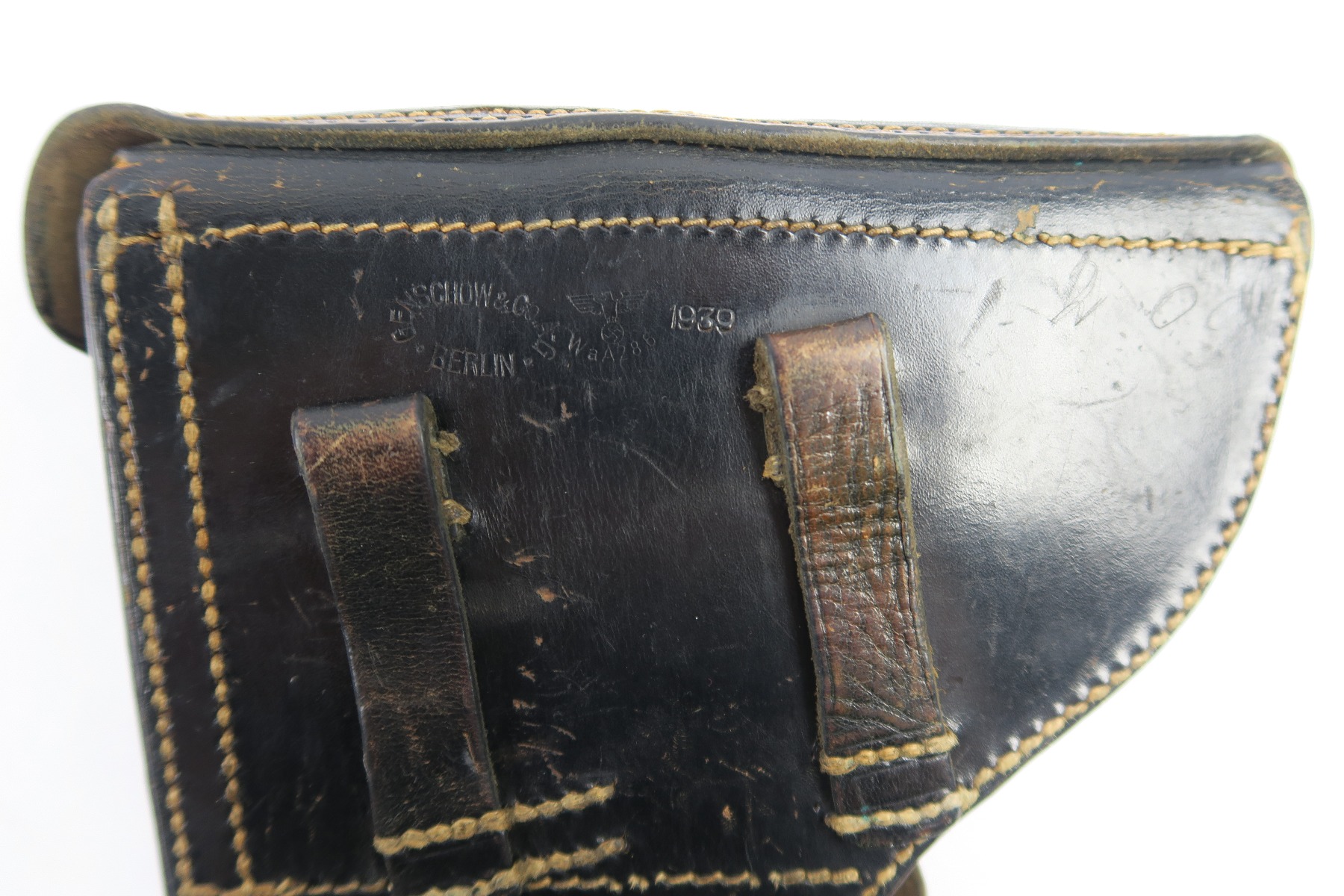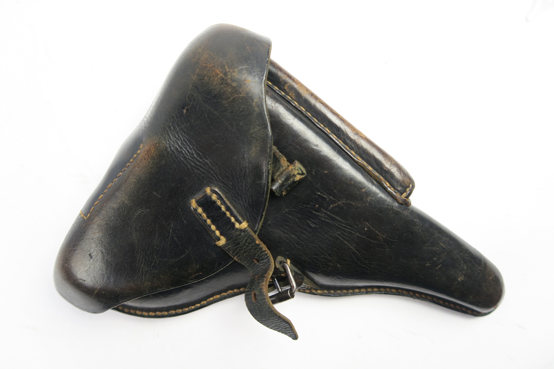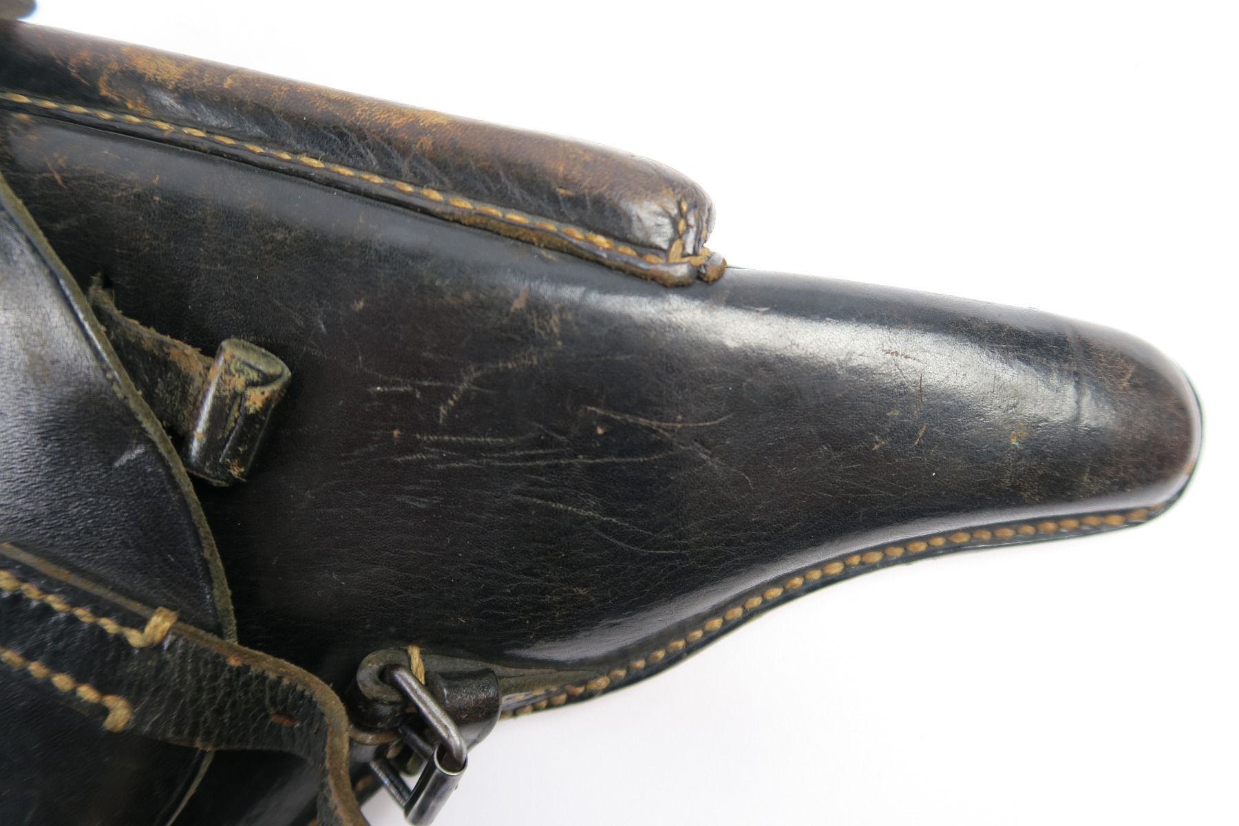4/27/18 – This is an original 1939 dated Luger holster from WW2. The back of the holster is maker stamped with a waffen WaA286 military proof and 1939 date stamp. The leather is lightly worn and shows signs of having held a Luger for a while. The leather is soft and pliable and the closure strap has some surface wrinkling and light cracking. The main leather is lightly wrinkled with normal wear. The stitching is all tight and original. The back toe of leather has a name and number “11023” lightly scratched on. This seems like a German’s writing / name. A very nice holster with a little character from WW2. Guaranteed original.