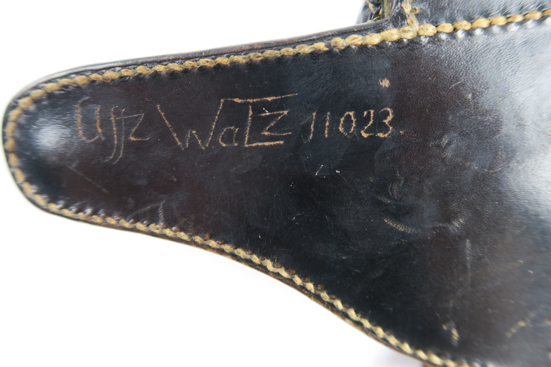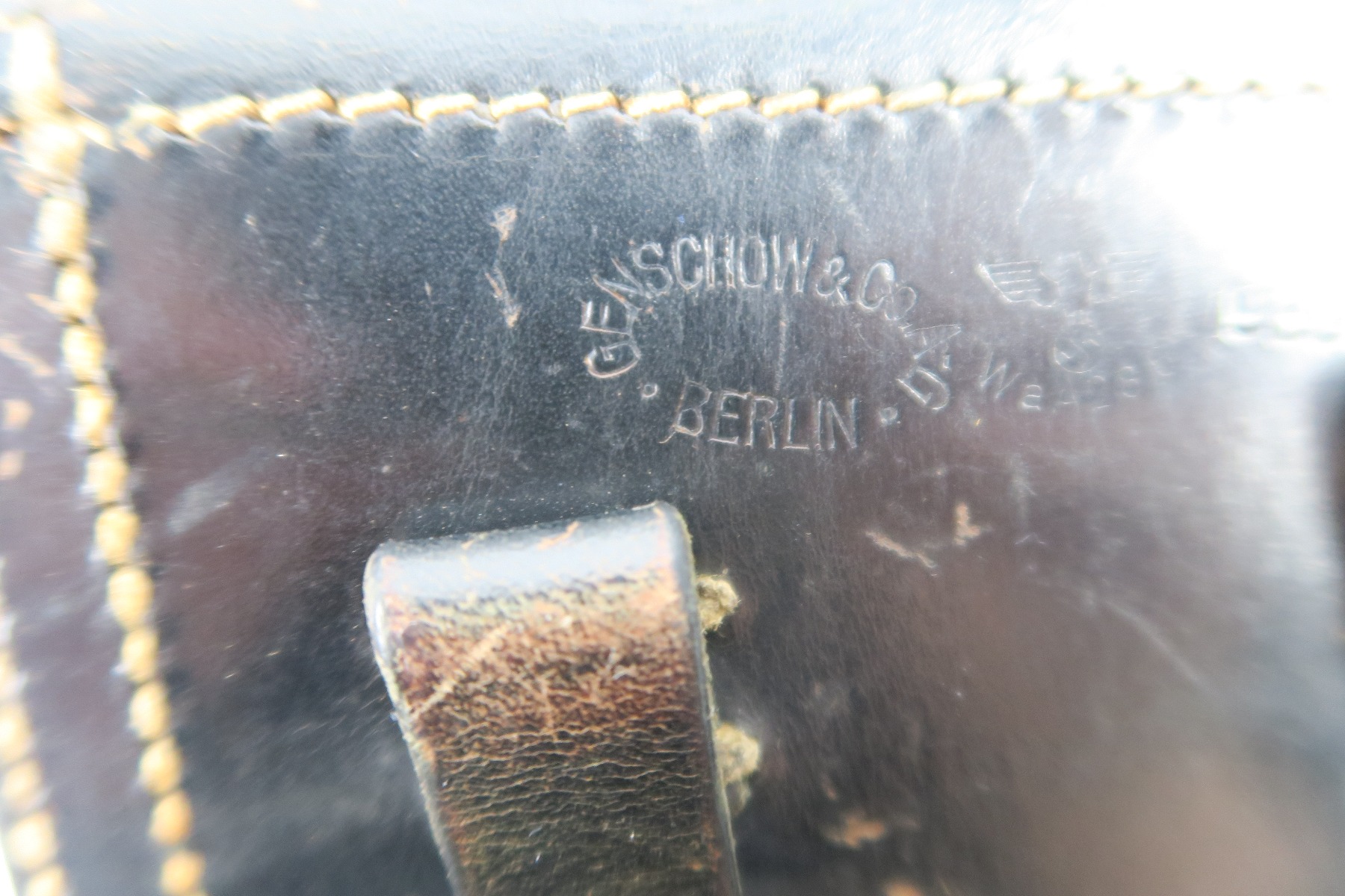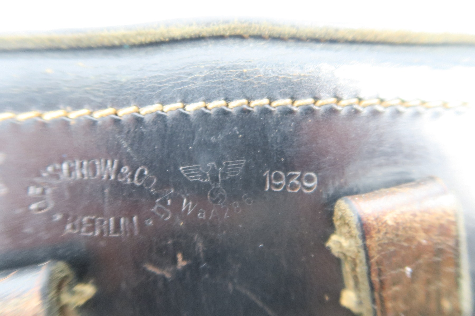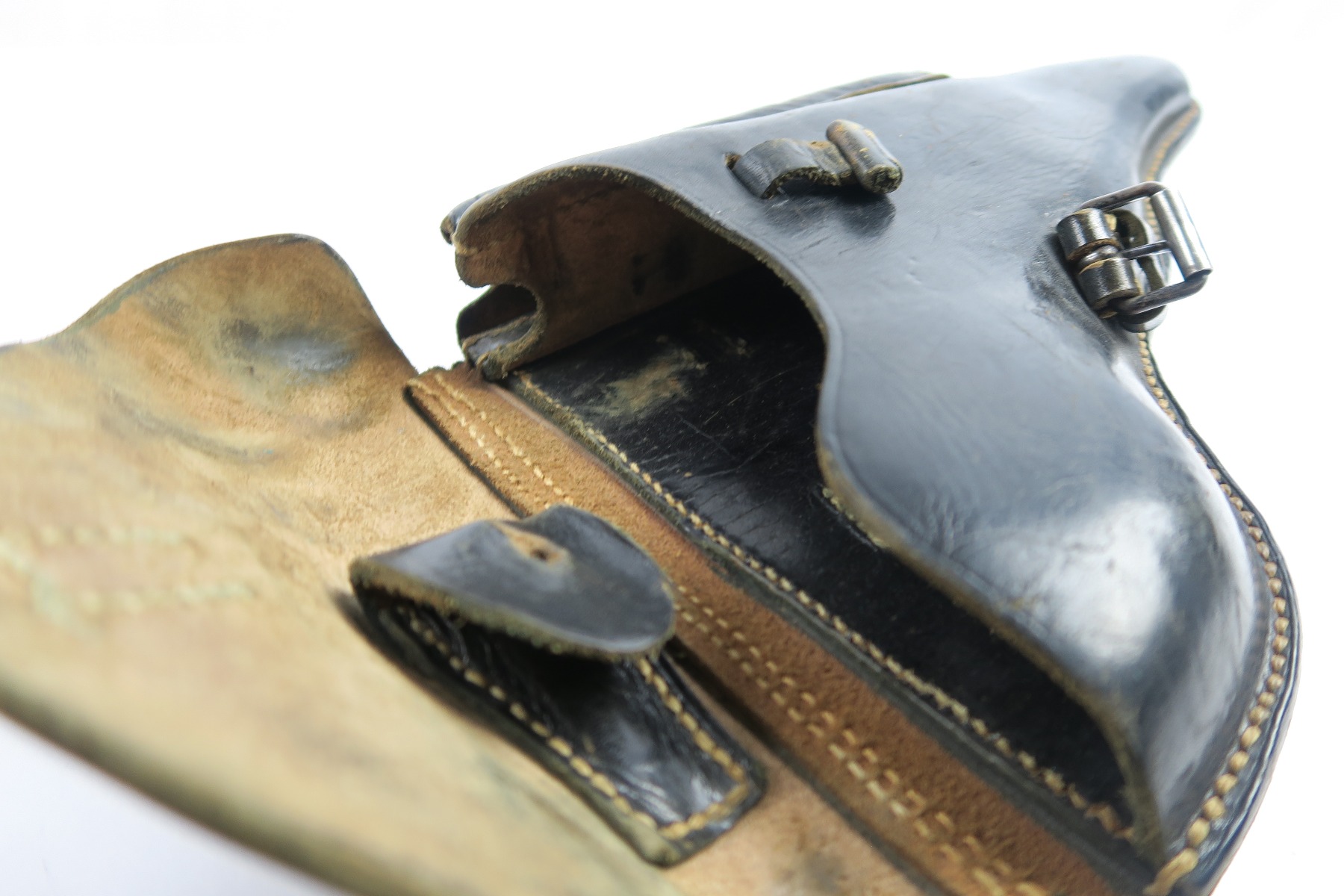 4/27/18 – This is an original 1939 dated Luger holster from WW2. The back of the holster is maker stamped with a waffen WaA286 military proof and 1939 date stamp. The leather is lightly worn and shows signs of having held a Luger for a while. The leather is soft and pliable and the closure strap has some surface wrinkling and light cracking. The main leather is lightly wrinkled with normal wear. The stitching is all tight and original. The back toe of leather has a name and number “11023” lightly scratched on. This seems like a German’s writing / name. A very nice holster with a little character from WW2. Guaranteed original.