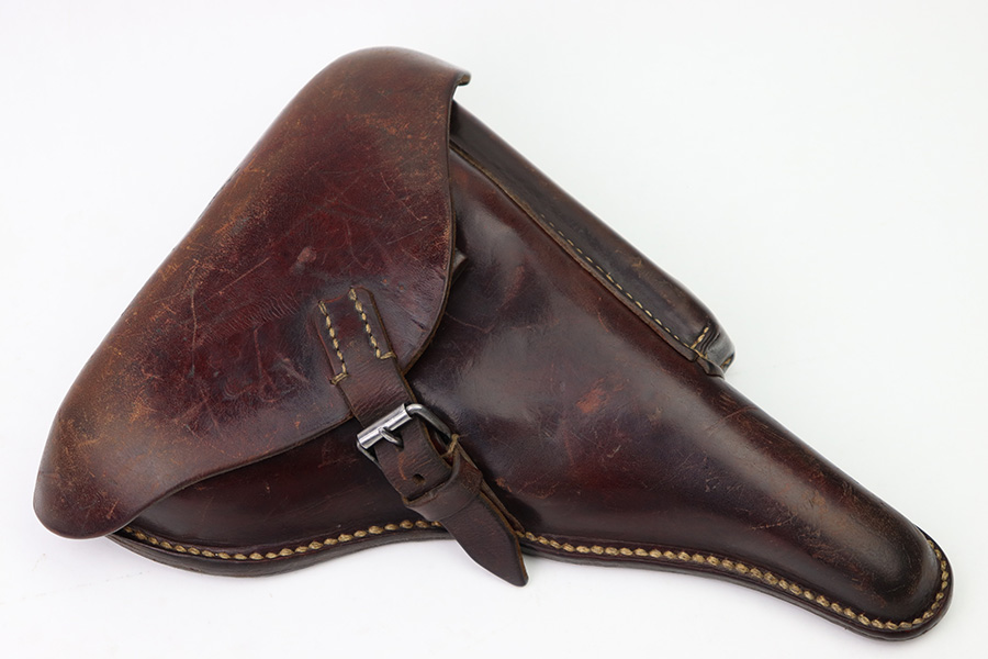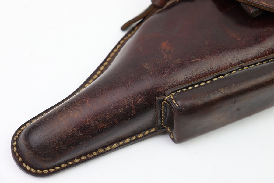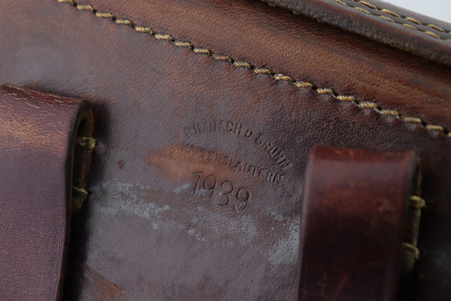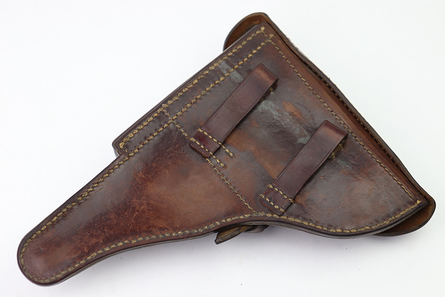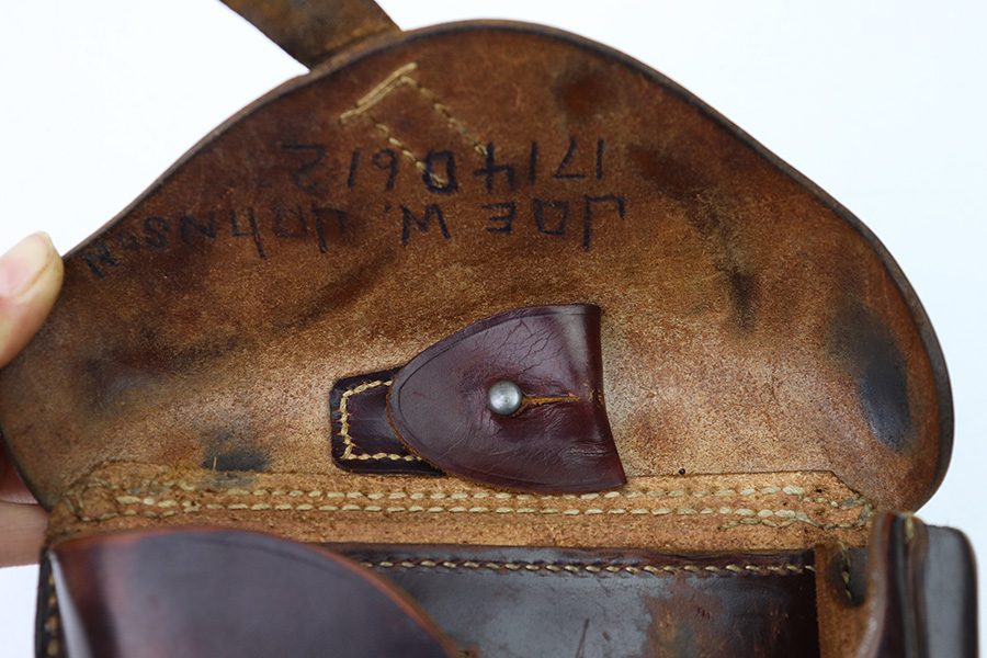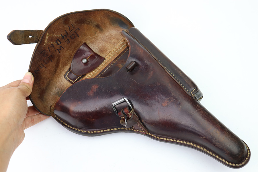 8/3/22 – This is an original 1939 dated Luger holster from WW2. The holster has very nice reddish-brown colored leather and all original stitching. The back leather is maker stamped, dated, and waffen proof stamped (although the waffen proof is very faint from some surface belt wear). The interior leather has a name and serial number written inside. The exterior leather has normal surface wear and pliability with no major issues.