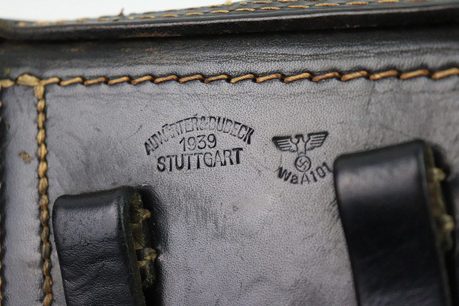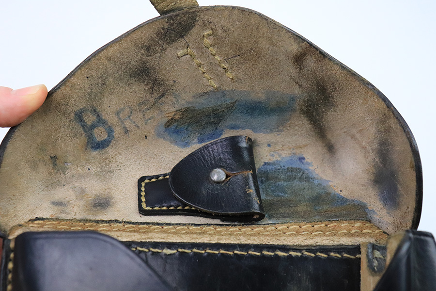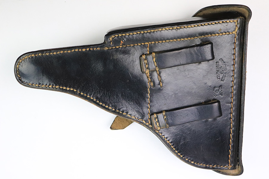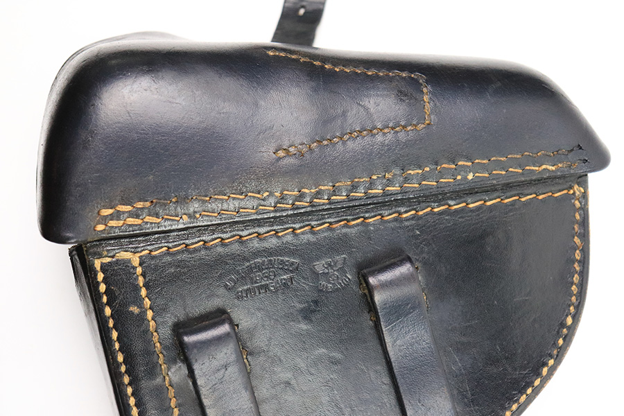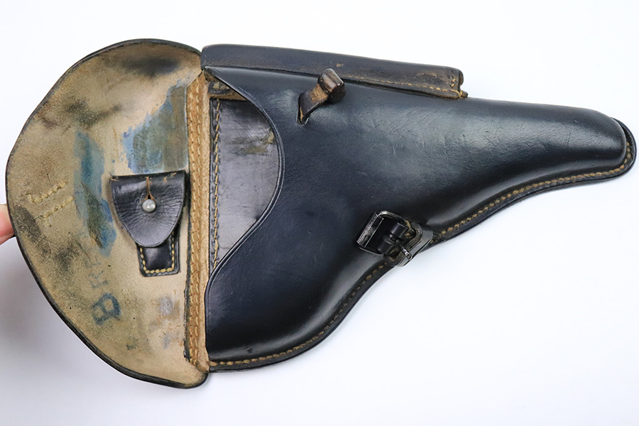 11/25/22 – This is an original 1939 dated Luger holster in great overall condition. The leather is soft and pliable but holds shape nicely and isn’t flimsy. The exterior leather is clean with some mild scuffs and signs of previous use but no major wear or damage. Excellent stitching throughout. Stamped on the back leather with a maker, date, and waffen proof. Interior leather shows some ink and writing from previous owners.