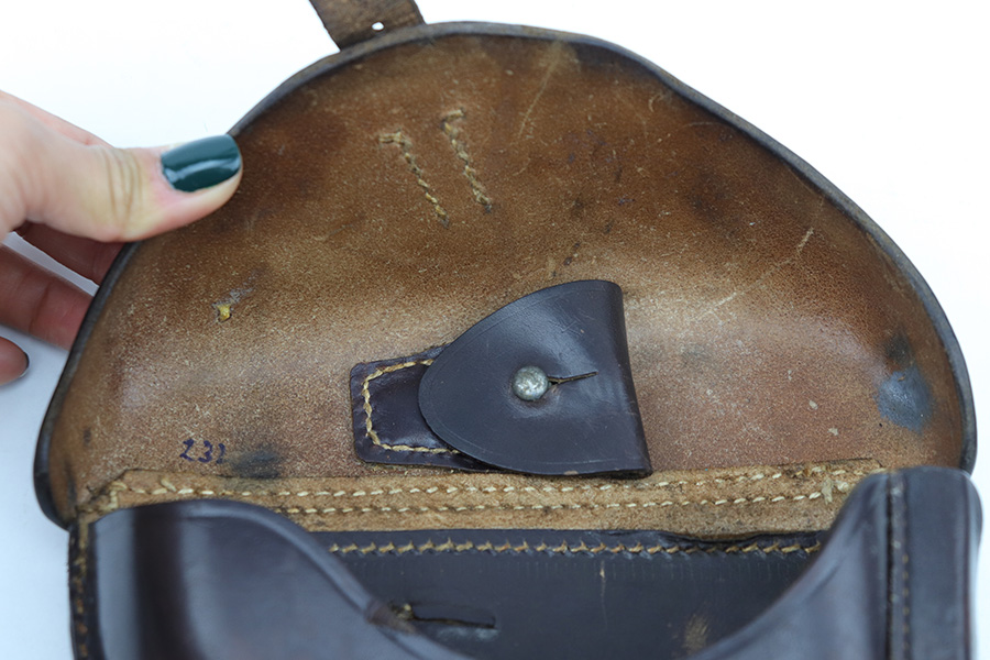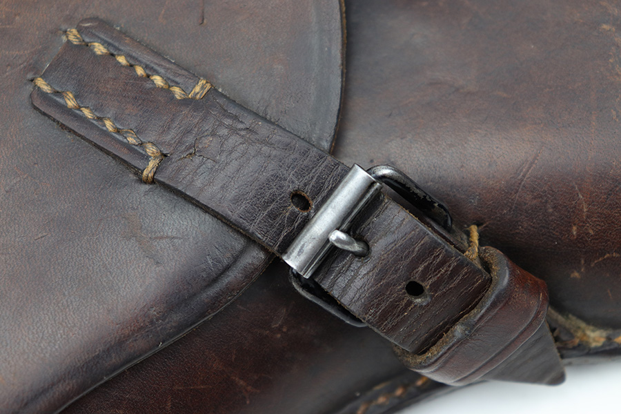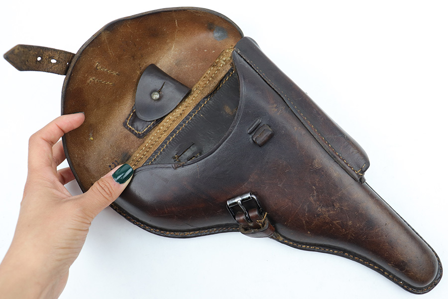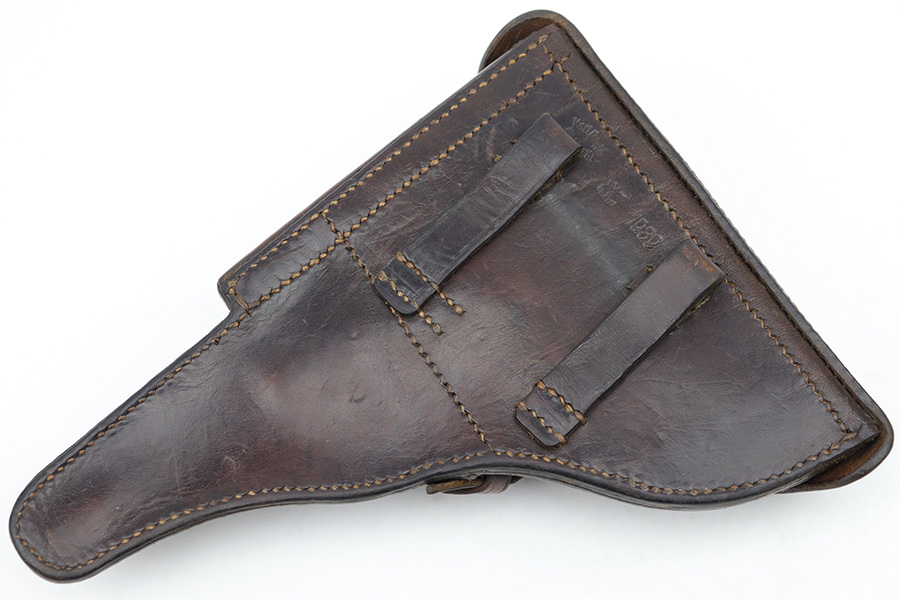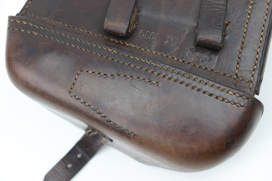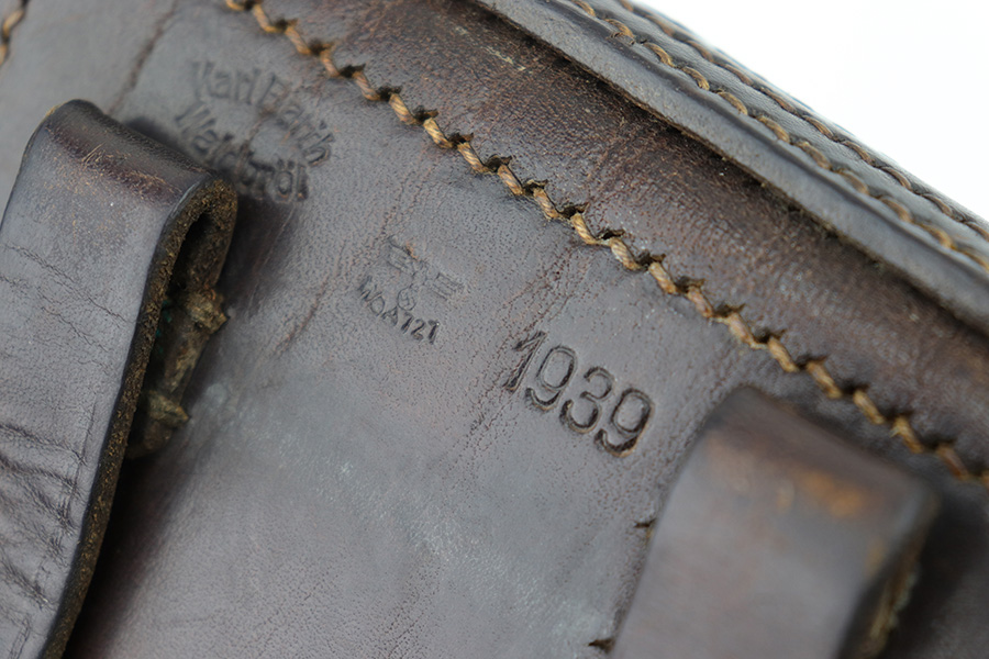 3/29/23 – This is an original 1939 dated Luger holster from WW2. The holster is in near-excellent condition with very nice brown leather and all original stitching intact. The back leather is maker stamped, dated, and waffen proof stamped. The leather has mild pliability and some light surface discoloration but no major issues. Clean interior leather. A great wartime example.