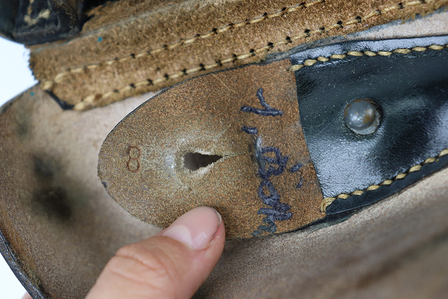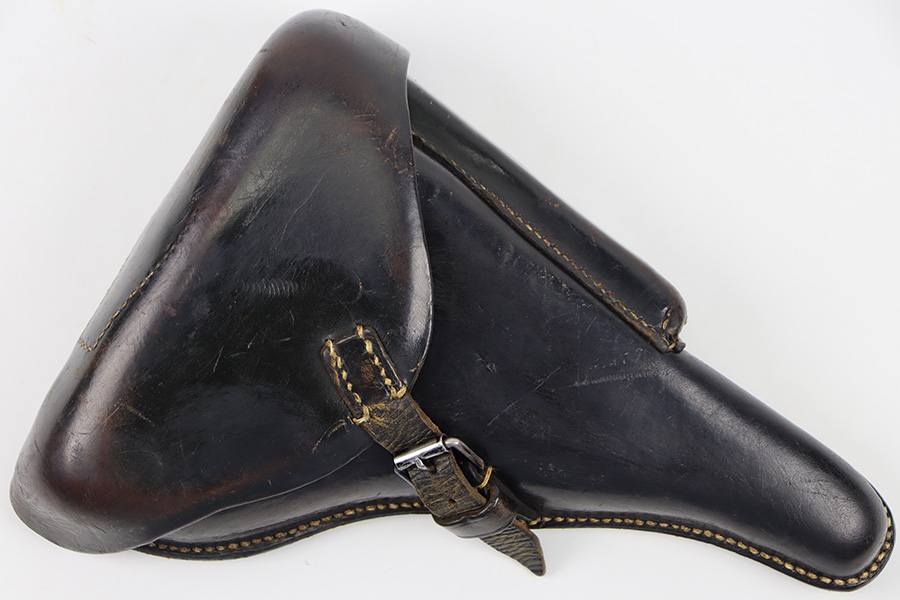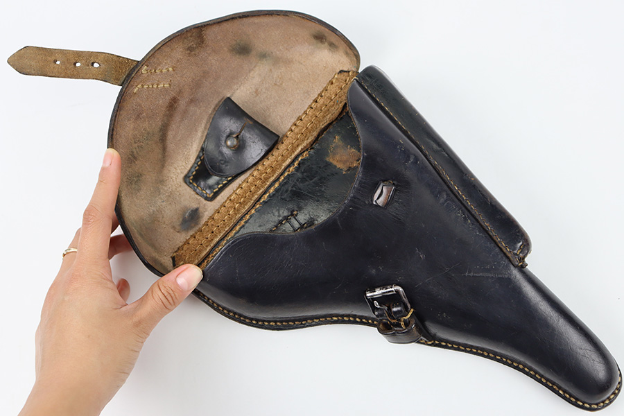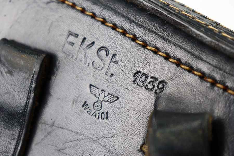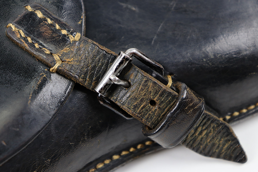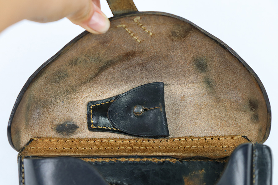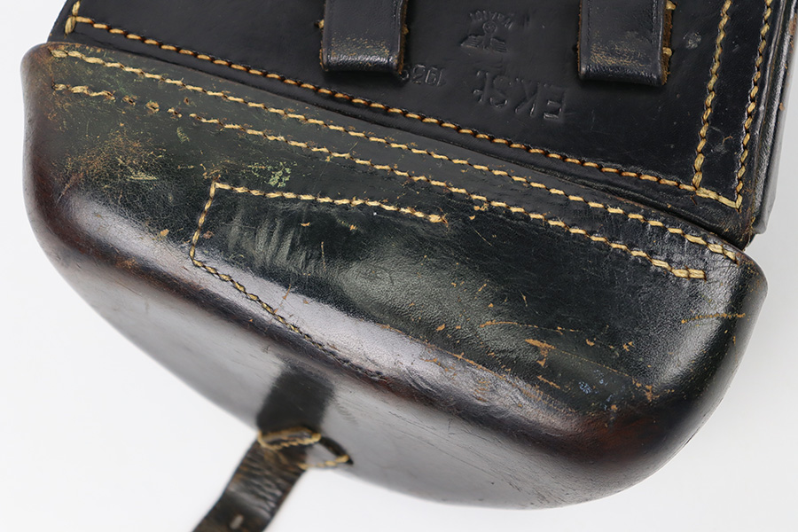10/24/23 – This is an original 1939 dated Luger holster with a somewhat uncommon maker stamp. The back leather is maker stamped, dated, and waffen military proof stamped. The leather is in great overall condition, all original with normal pliability. Some light fading of the black ink on the top lid, and some mild surface wrinkling and scuffs throughout. All original stitching intact with a few loose stitches on the lid, but this is very minor. Clean interior leather.