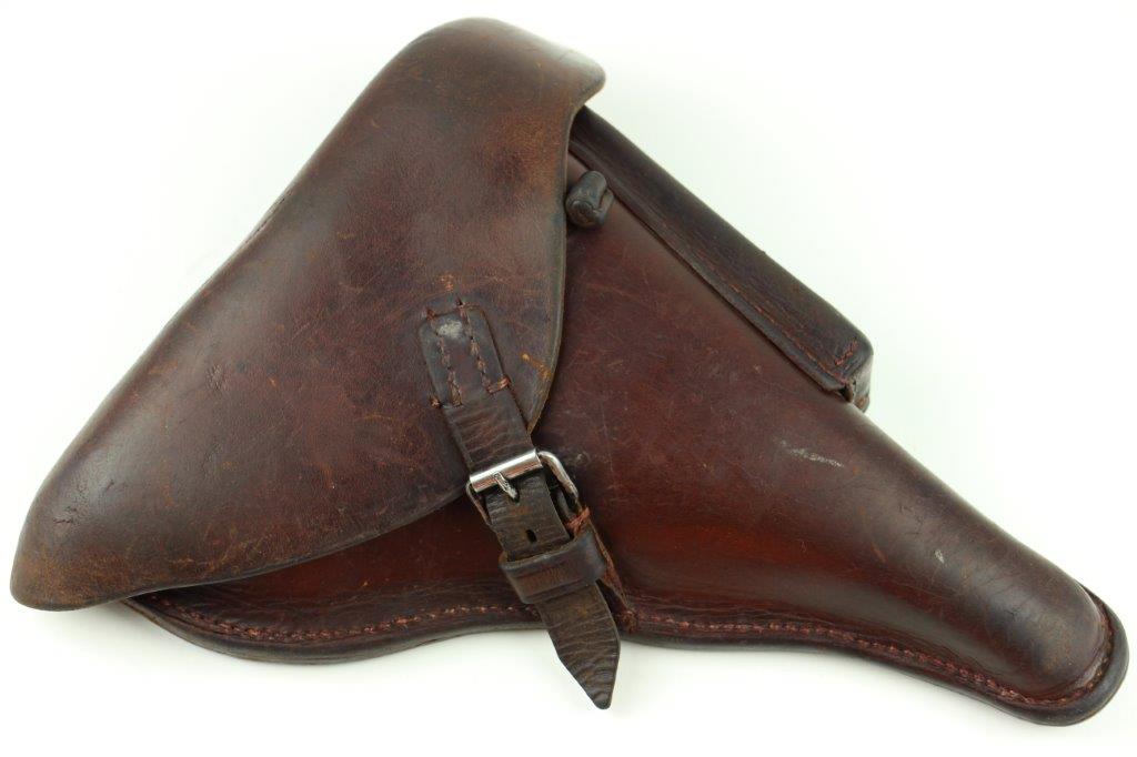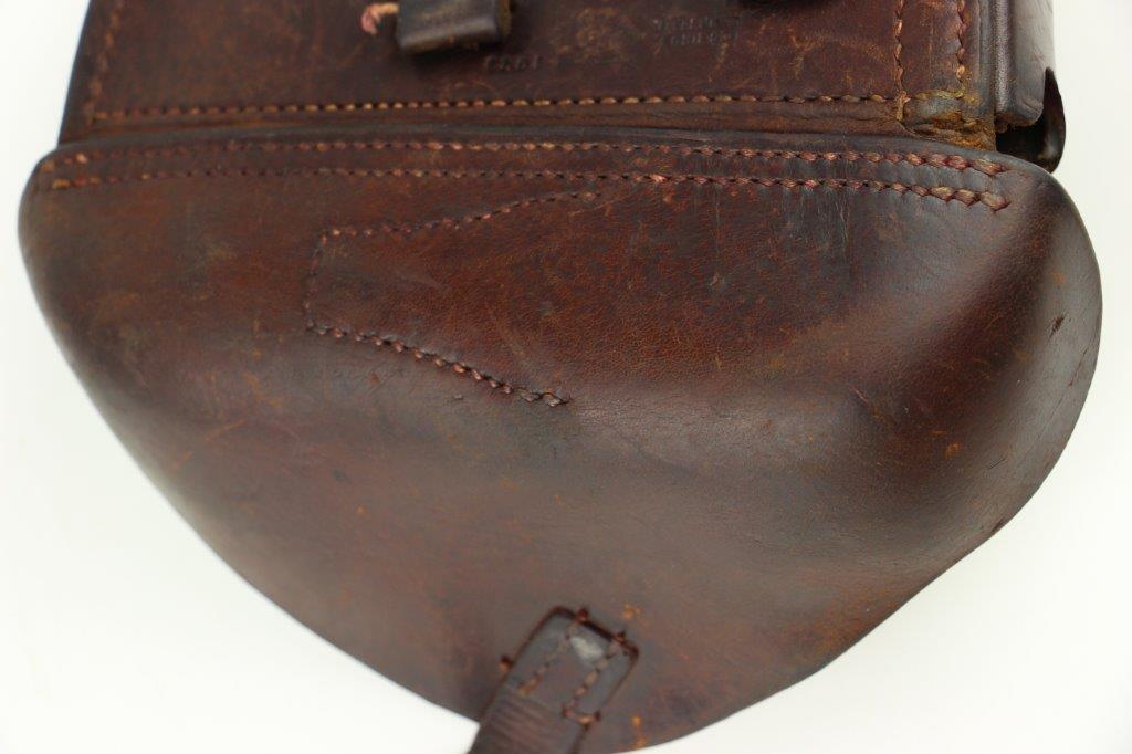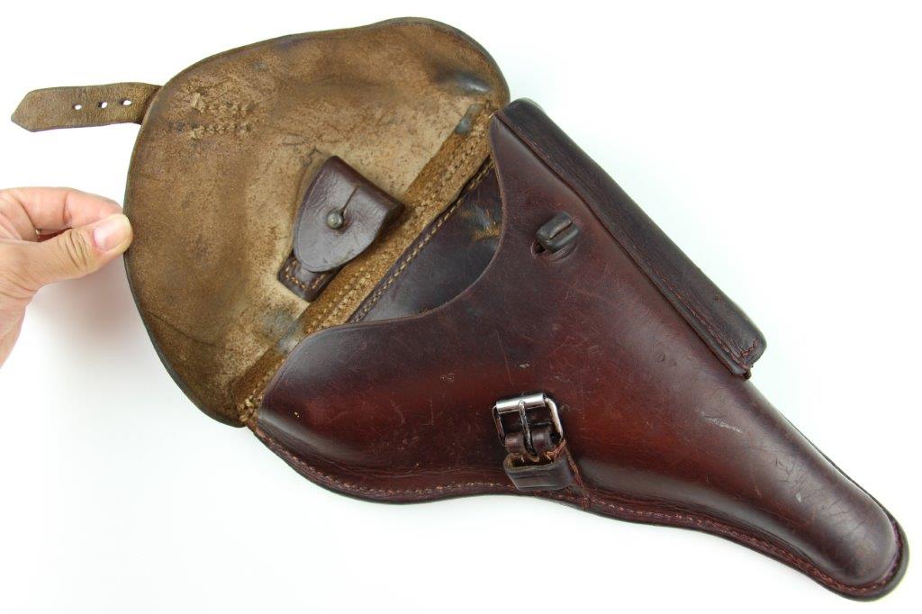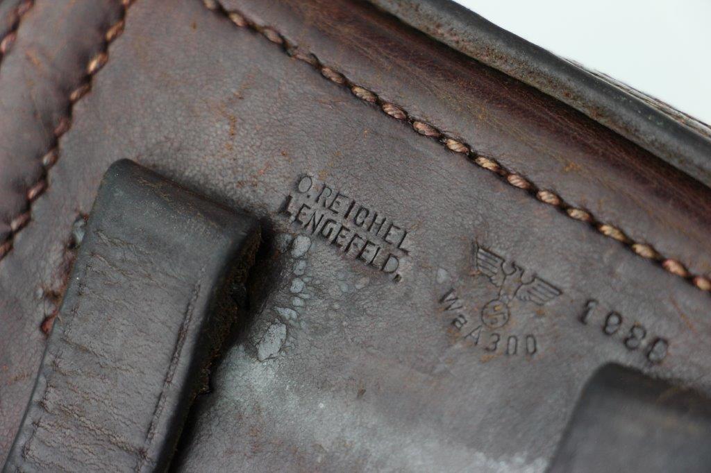8/1/24 – This is a 1939 dated Luger holster from WW2. The holster is in very good overall condition with reddish-brown colored leather and iconic German reddish-colored stitching. The leather shows mild surface scuffing and handling wear and is soft and pliable. The stitching is great, except for some loose stitches on the upper right belt loop. This is shown in photos; the belt loop still has enough stitching intact to keep the belt loop in place. Fairly clean interior leather with normal use wear. The back leather is maker stamped by an uncommon maker, “O. Reichel”. There’s also a waffen military proof stamp and 1939 date stamp (small font, but close inspection shows the last digit as a “9”). Overall a nice wartime production example with honest use wear.