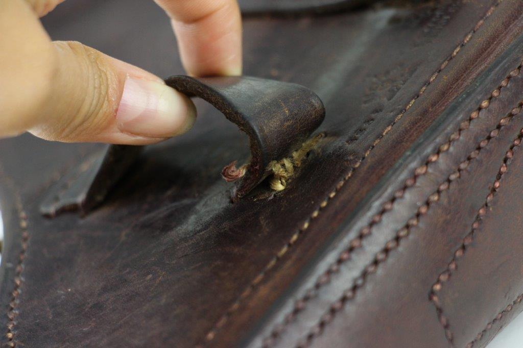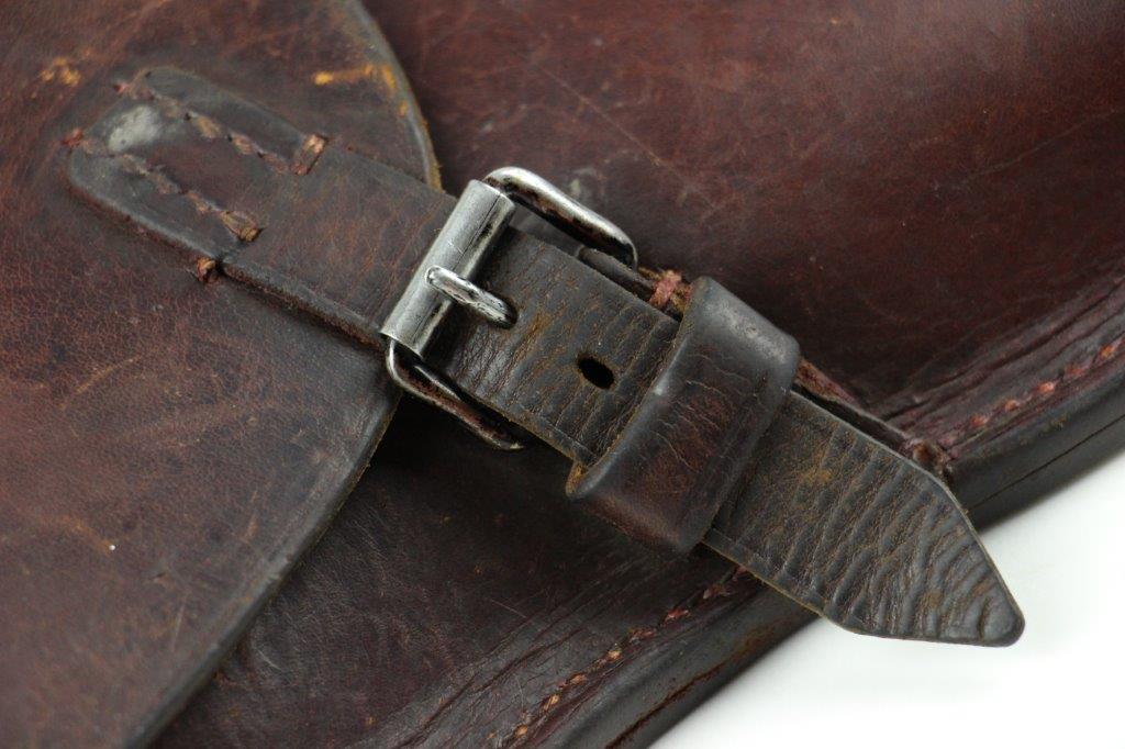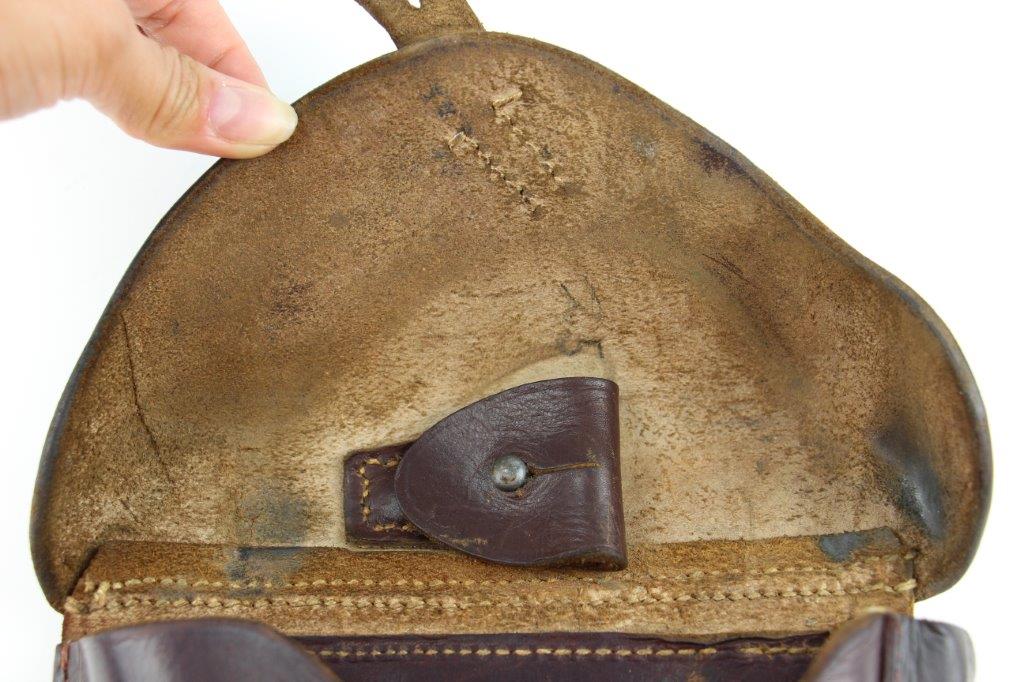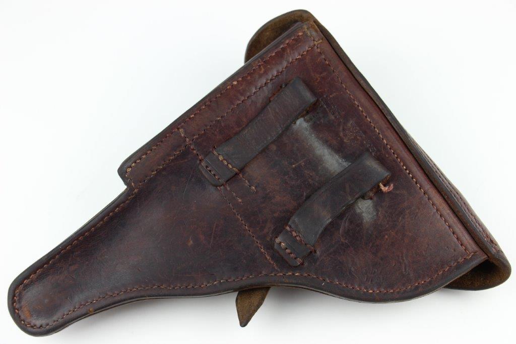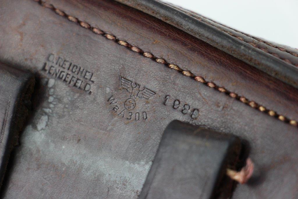 8/1/24 – This is a 1939 dated Luger holster from WW2. The holster is in very good overall condition with reddish-brown colored leather and iconic German reddish-colored stitching. The leather shows mild surface scuffing and handling wear and is soft and pliable. The stitching is great, except for some loose stitches on the upper right belt loop. This is shown in photos; the belt loop still has enough stitching intact to keep the belt loop in place. Fairly clean interior leather with normal use wear. The back leather is maker stamped by an uncommon maker, “O. Reichel”. There’s also a waffen military proof stamp and 1939 date stamp (small font, but close inspection shows the last digit as a “9”). Overall a nice wartime production example with honest use wear.