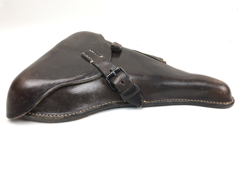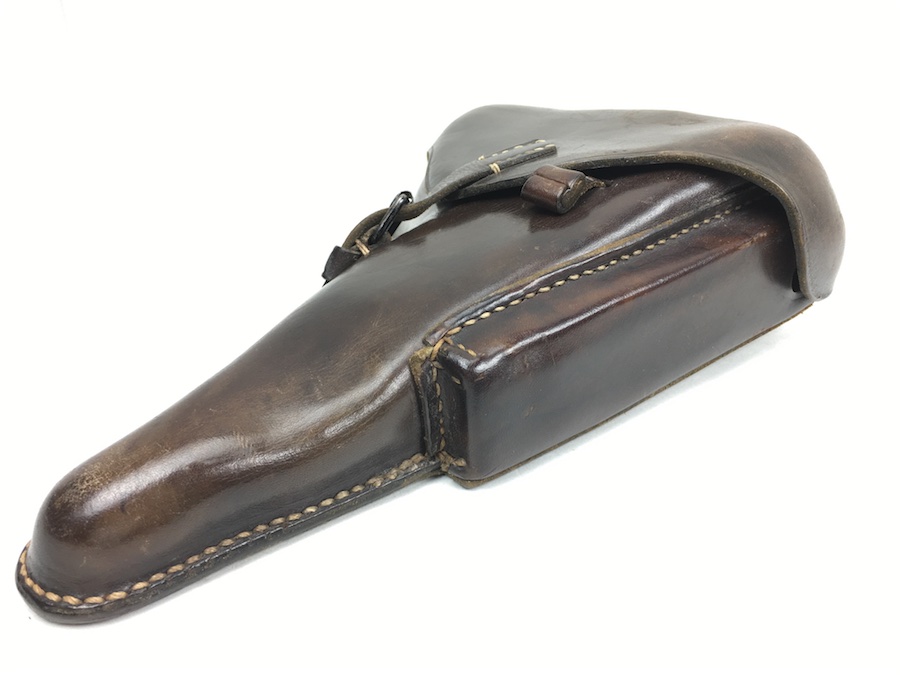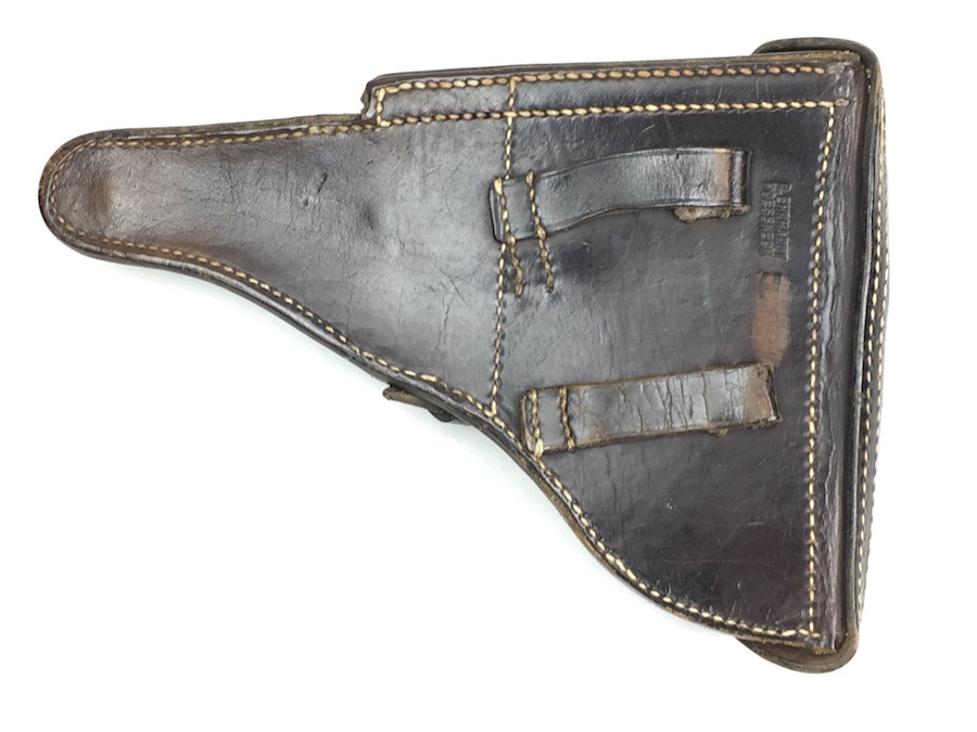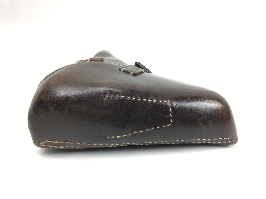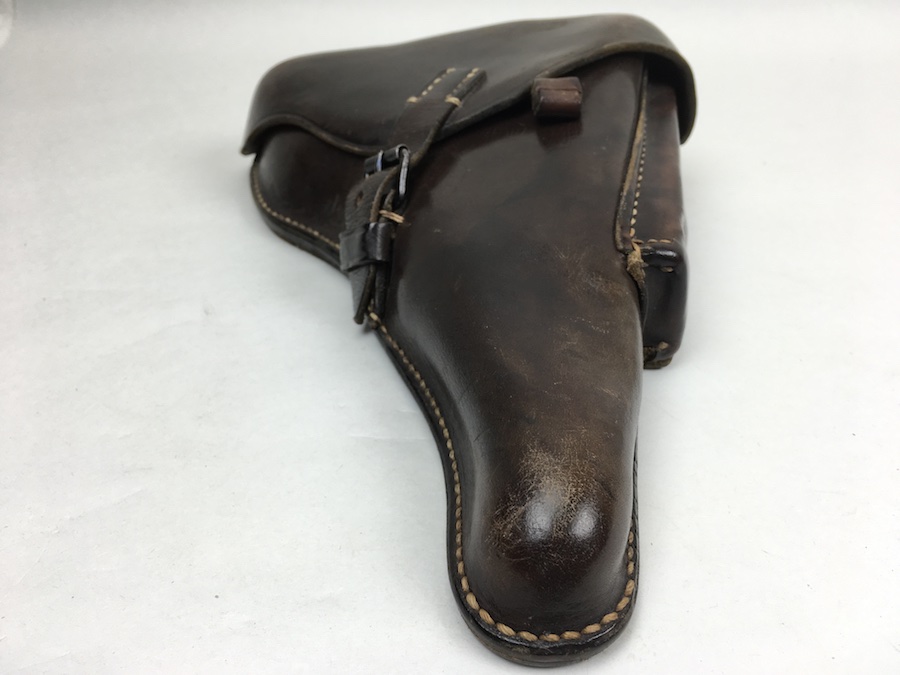 7/8/19 – This is an original, and excellent condition 1939 dated Luger holster from WW2. The back of the holster is maker stamped with a waffen WaA29 military proof and 1939 date stamp. The proof stamp and the date have been marred, but they are still visible. The leather shows minimal wear and hardly any signs of use. The leather is still firm and pliable. The belt loops are lightly wrinkled with normal wear. The stitching is all tight, original and secure. Clean interior with secure lift strap. Guaranteed original.