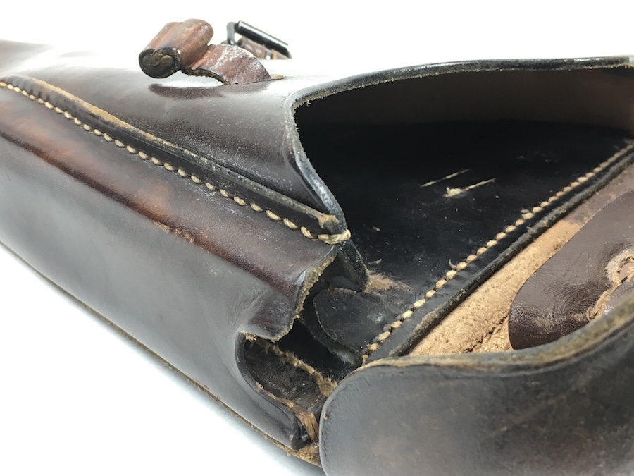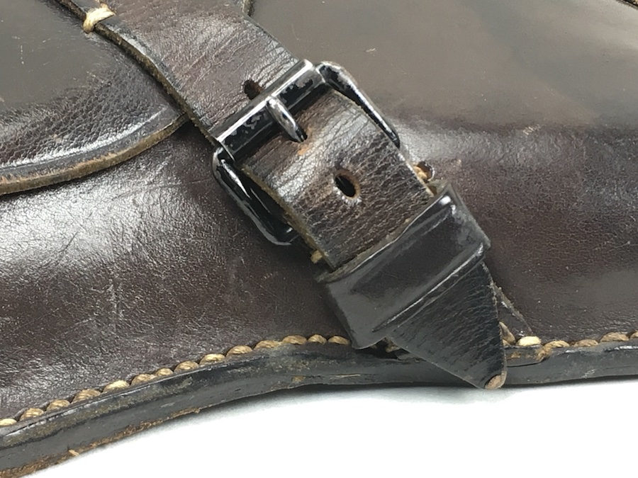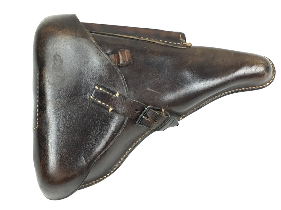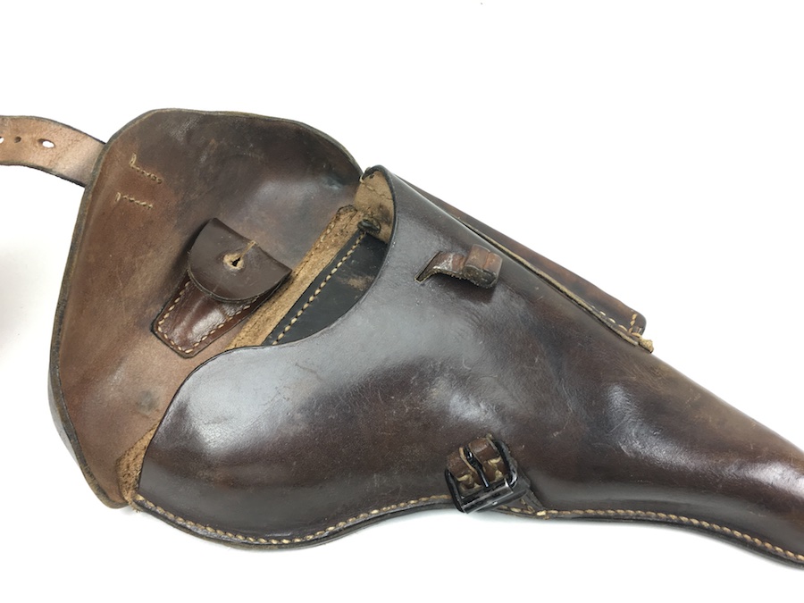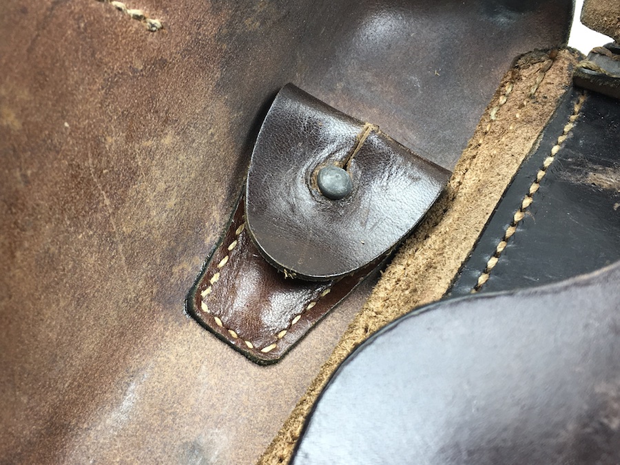 7/8/19 – This is an original, and excellent condition 1939 dated Luger holster from WW2. The back of the holster is maker stamped with a waffen WaA29 military proof and 1939 date stamp. The proof stamp and the date have been marred, but they are still visible. The leather shows minimal wear and hardly any signs of use. The leather is still firm and pliable. The belt loops are lightly wrinkled with normal wear. The stitching is all tight, original and secure. Clean interior with secure lift strap. Guaranteed original.