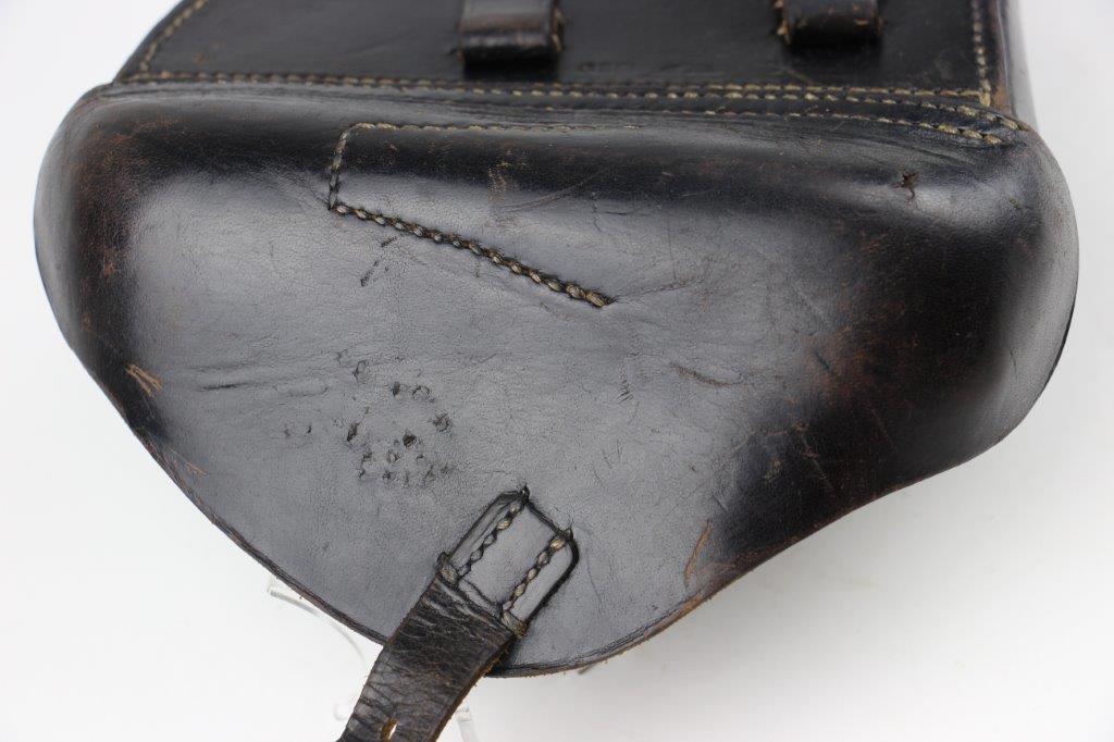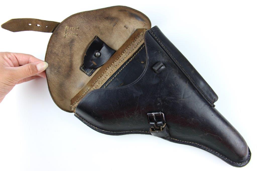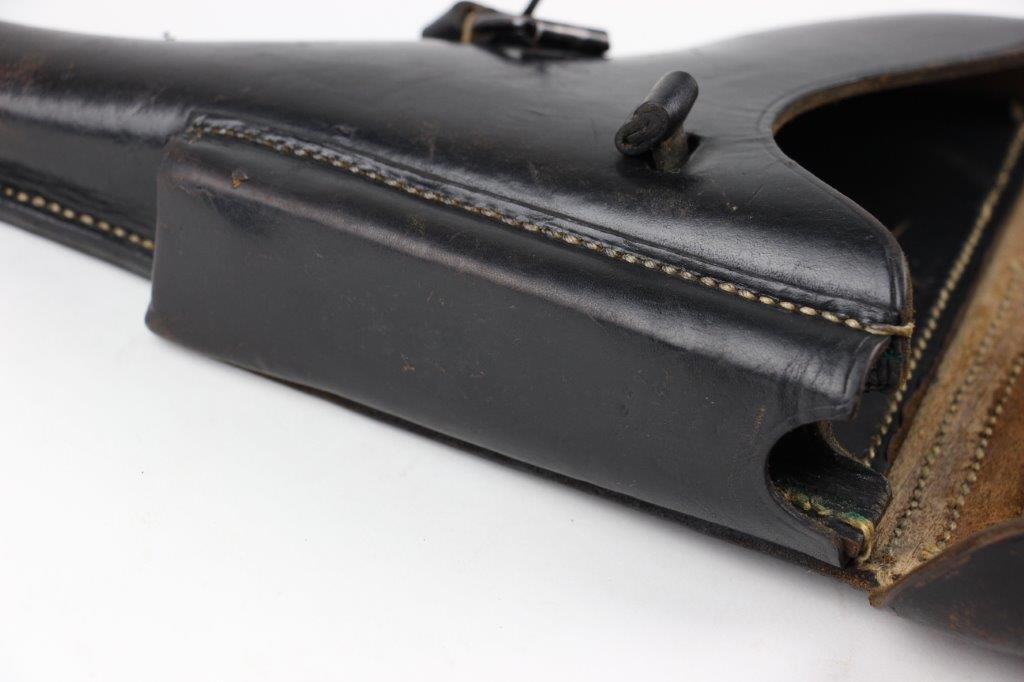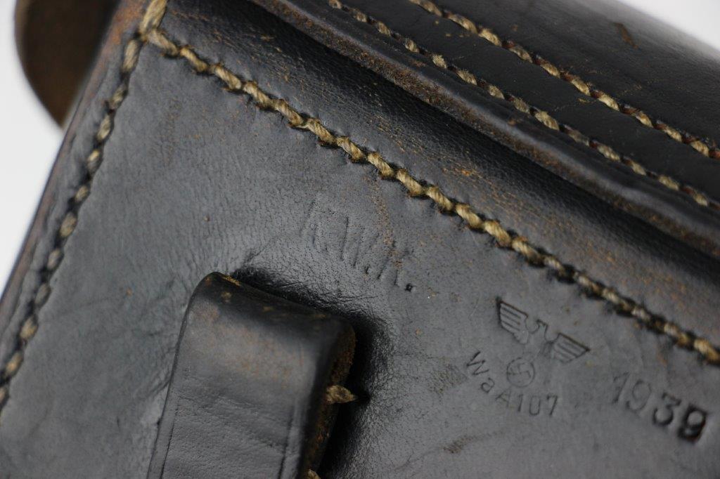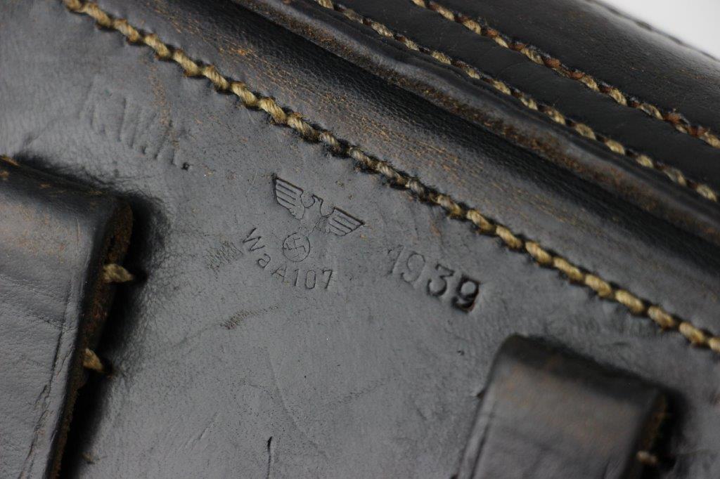 8/12/24 – This is a great condition 1939 dated Luger holster with a fairly uncommon maker code, “K.W.K.”. Research finds there’s not a definitive answer as to who manufactured these holsters, but general consensus is these were by Auwärter und Bubeck due to the waffen code, WaA107 that’s found paired with these KWK marked holsters. The holster features black leather that has normal pliability and light use wear. There’s a few small pin-prick or chew / scuffs on the front leather near the closure strap, but this doesn’t go deep into the leather. Very clean interior leather and all original stitching throughout that’s excellent condition. The back leather is maker code stamped K.W.K., waffen eagle WaA107 military proof stamped, and 1939 date stamped. Light use wear and a great example overall.