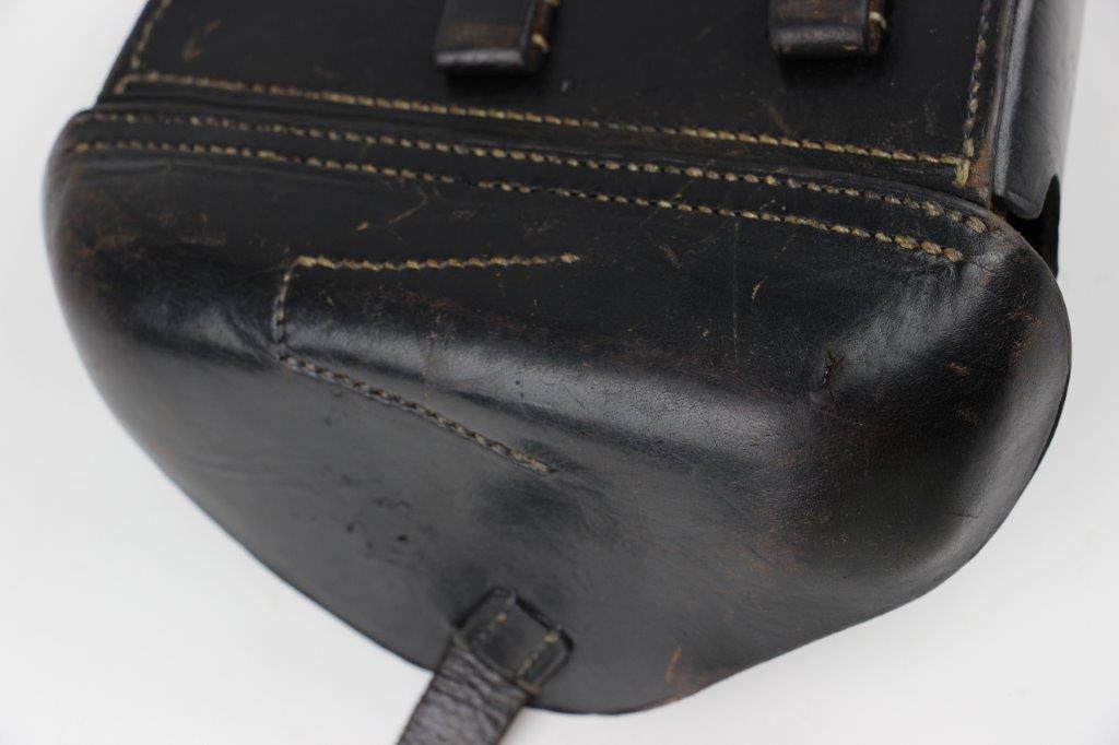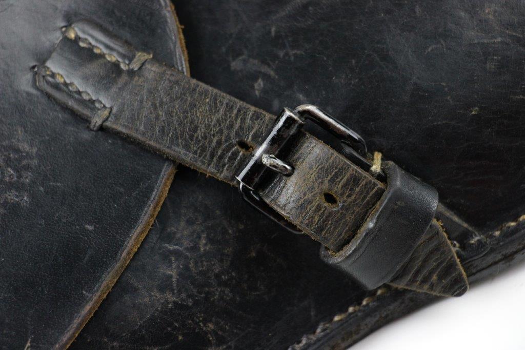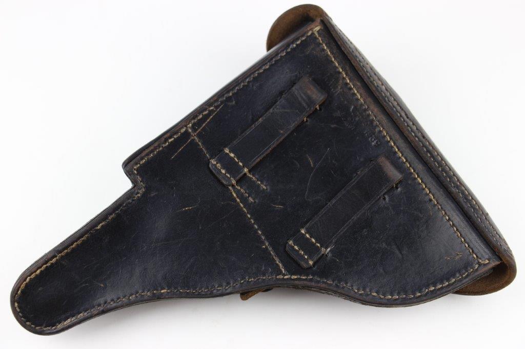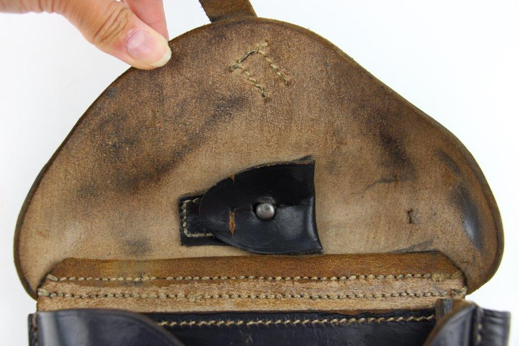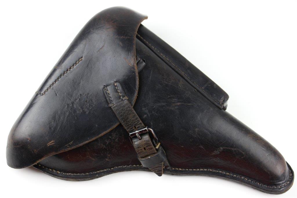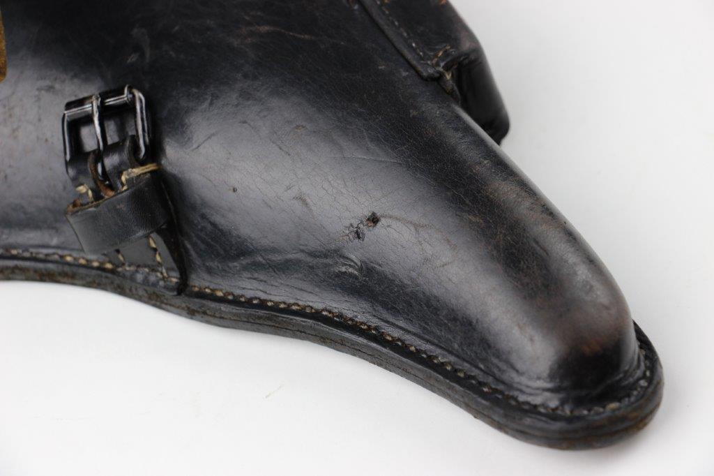 8/12/24 – This is a great condition 1939 dated Luger holster with a fairly uncommon maker code, “K.W.K.”. Research finds there’s not a definitive answer as to who manufactured these holsters, but general consensus is these were by Auwärter und Bubeck due to the waffen code, WaA107 that’s found paired with these KWK marked holsters. The holster features black leather that has normal pliability and light use wear. There’s a few small pin-prick or chew / scuffs on the front leather near the closure strap, but this doesn’t go deep into the leather. Very clean interior leather and all original stitching throughout that’s excellent condition. The back leather is maker code stamped K.W.K., waffen eagle WaA107 military proof stamped, and 1939 date stamped. Light use wear and a great example overall.