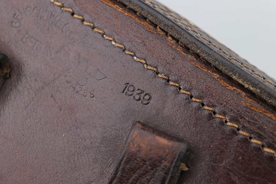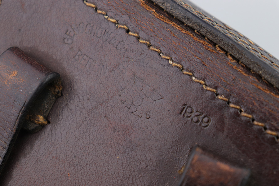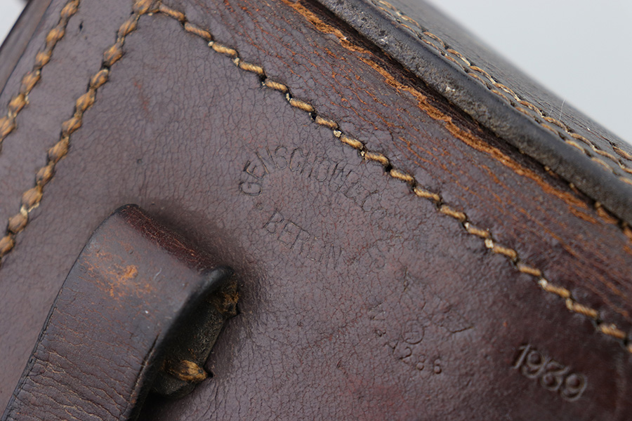 2/6/23 – This is an original 1939 dated Luger holster from WW2. The holster is maker stamped, dated, and waffen proofed on the back leather. The chocolate brown leather has normal wear with surface wrinkling and surface cracking throughout the front leather, closure strap, and top lid of the leather. The interior and back leather is fairly clean and in great shape. The leather is pliable as well. The lift strap is missing, as shown but this doesn’t really affect functionality. The holster stitching is all original but there are a few loose stitches on the back belt loops (both loops). The belt loops are still securely fastened to the holster however.