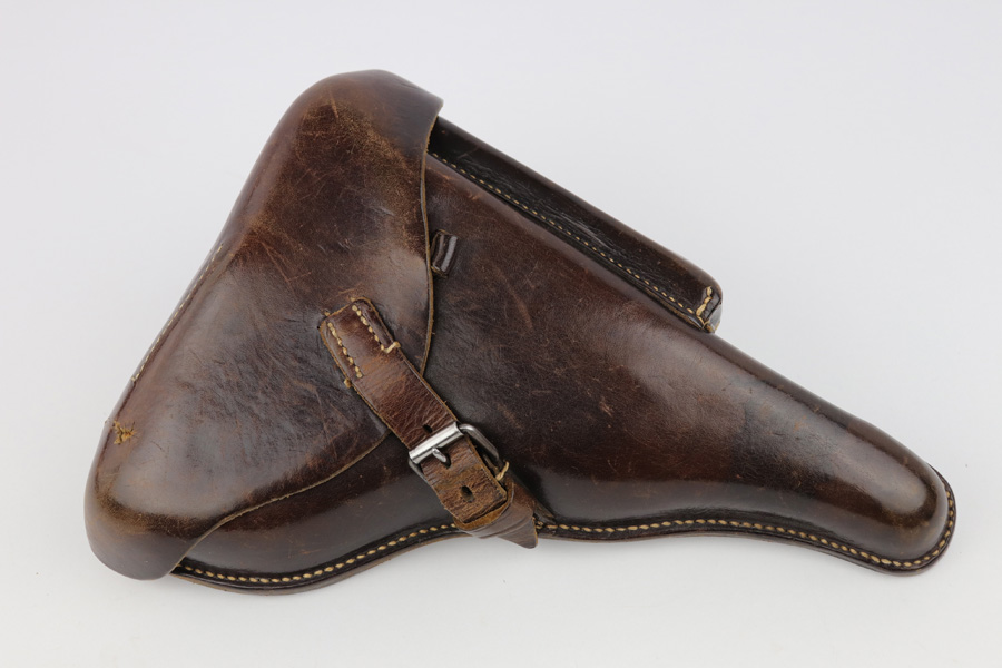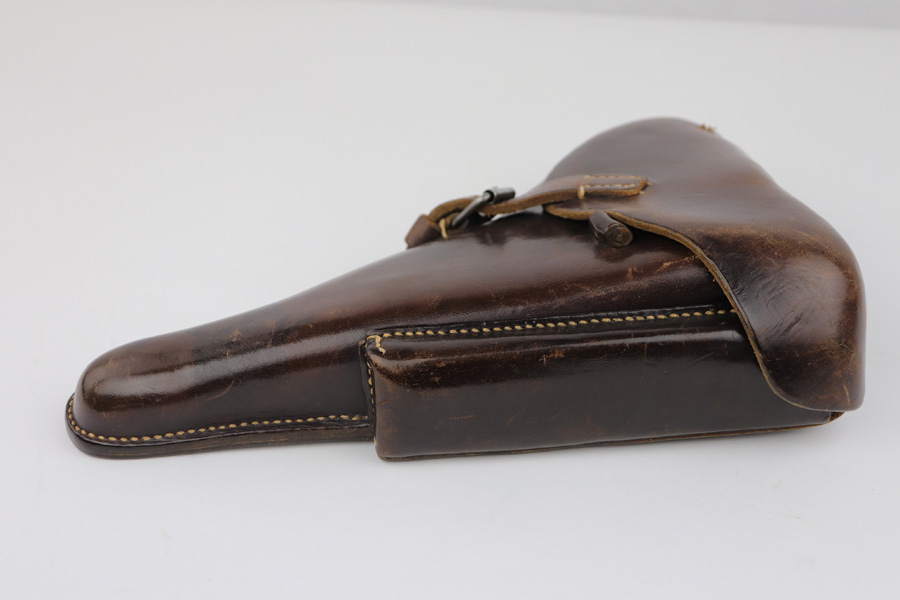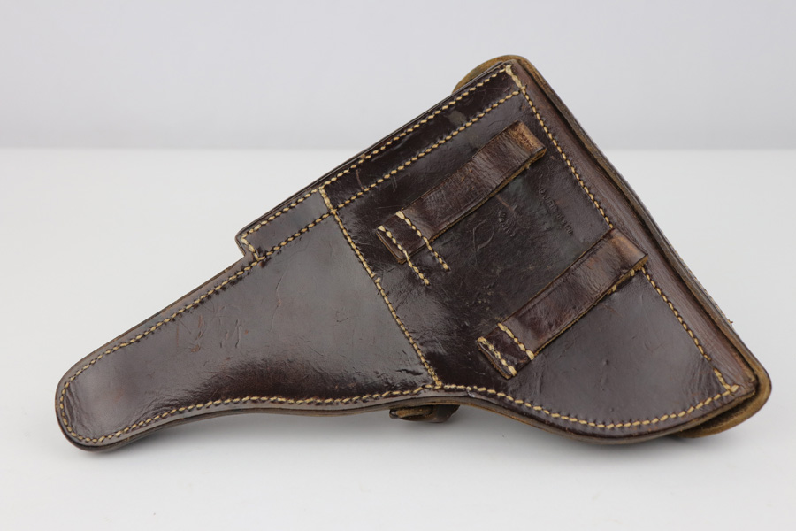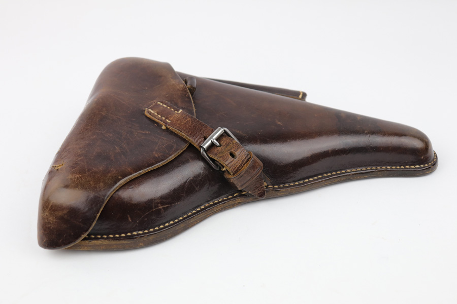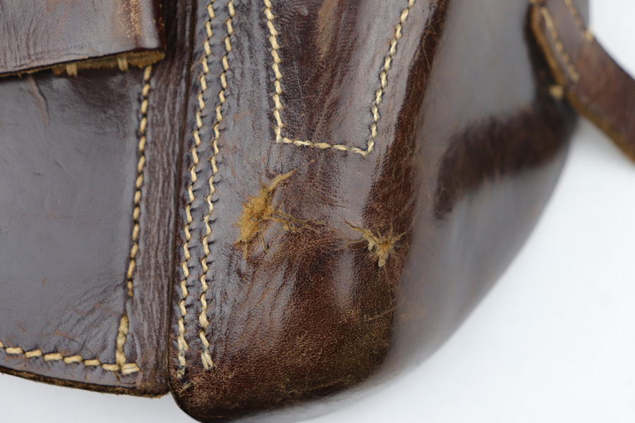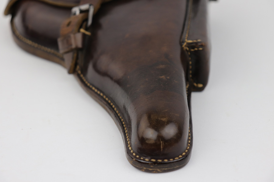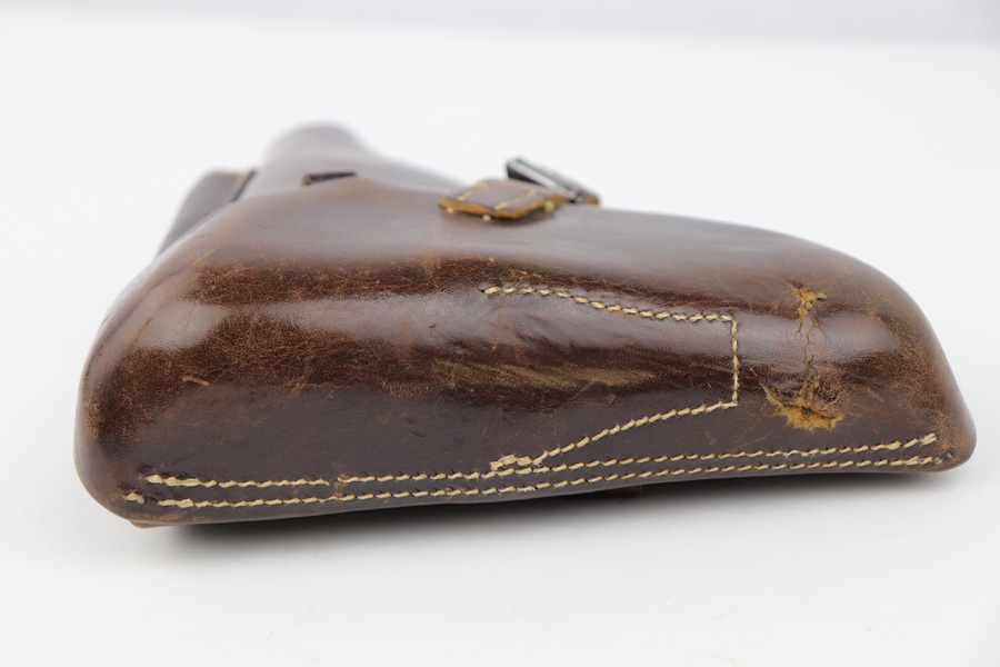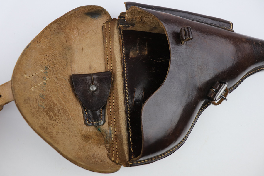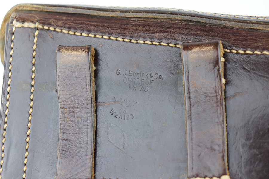 8/6/19 – This is an original 1939 dated Luger holster from WW2. The back of the holster is dated, waffen eagle military proof stamped, and maker stamped “G.J. Ensink & Co.”. The holster has very nice, strong leather, and all original stitching in tact. We would rate this as “excellent” but there is one small flaw – the hole in the lid. It appears to be a bullet hole that traveled through the lid of this holster, leaving two small holes that you can’t even fit a pinky through. Some minor exterior scuffing as well. Overall a very nice, clean holster.