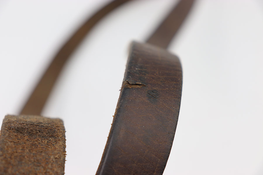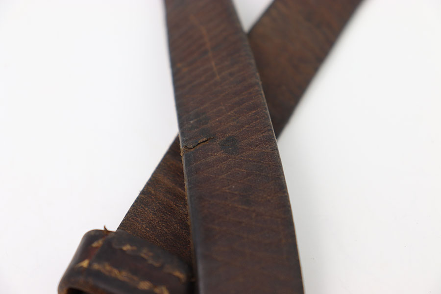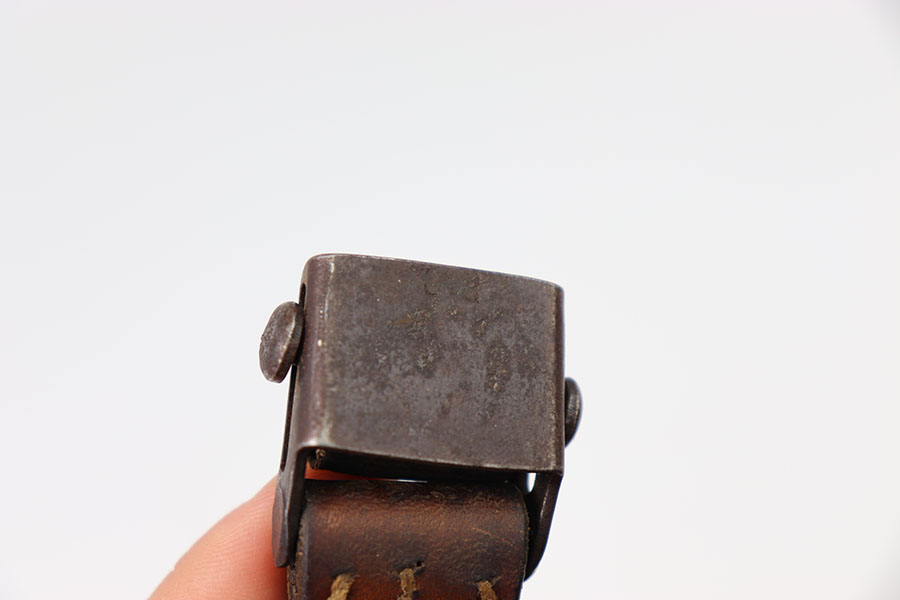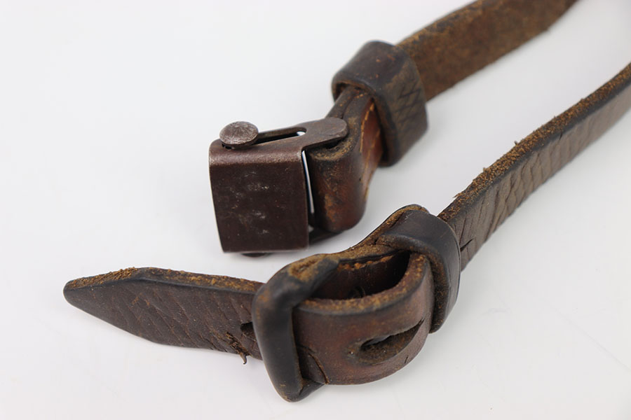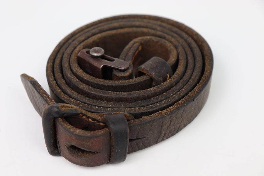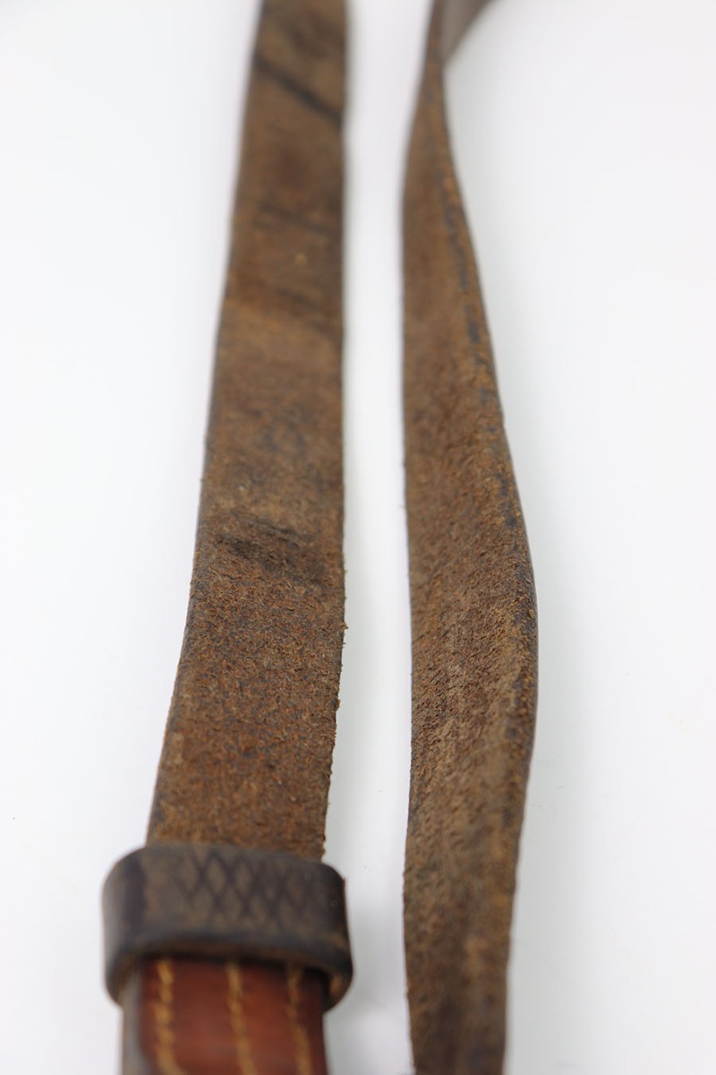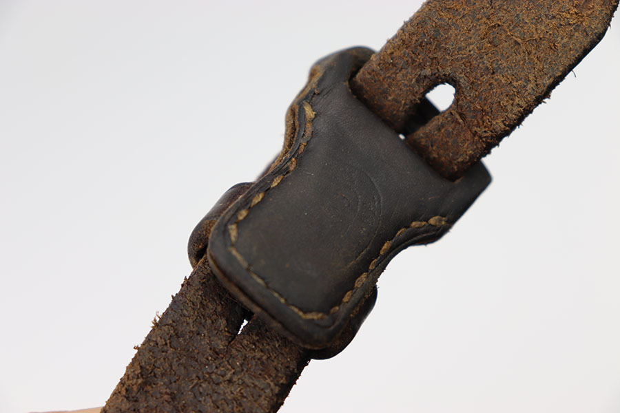 2/2/24 – This is an original leather sling for a K98 rifle. The sling comes with an original keeper that’s maker stamped and dated “1939”. Only half of the stamp is legible so I cannot make out the maker. The buckle is maker stamped “D&C” for “Dransfeld & Co, Menden/Sauerland.” The leather has normal surface wear but the original herringbone pattern is 50% remaining throughout. Sling has some minor surface crack as seen in the photos, but nothing that affects its durability. Overall in great+ condition.