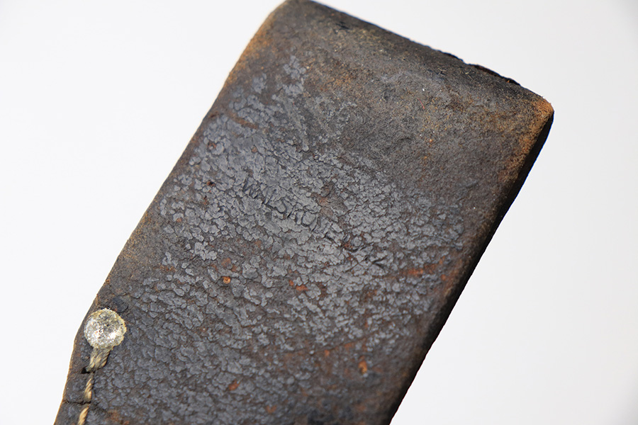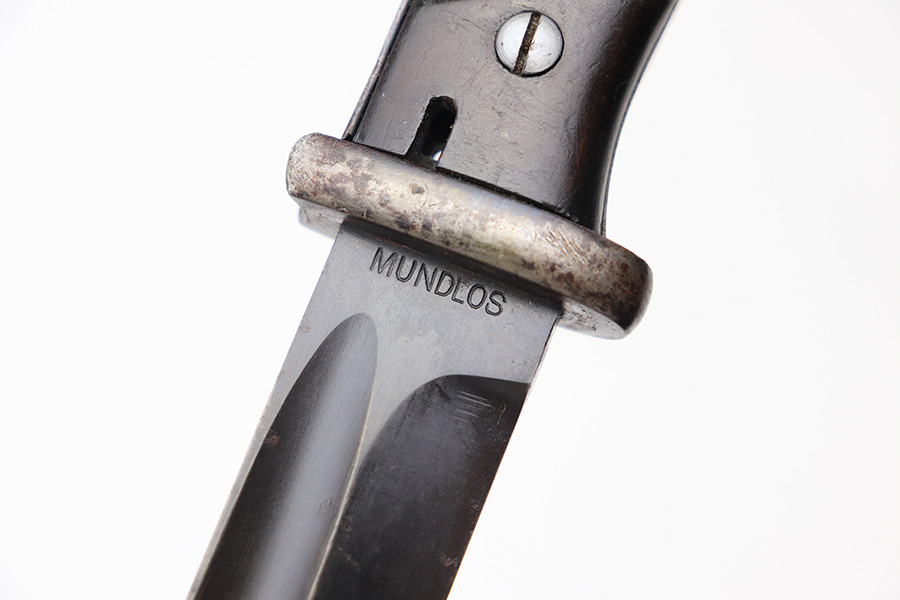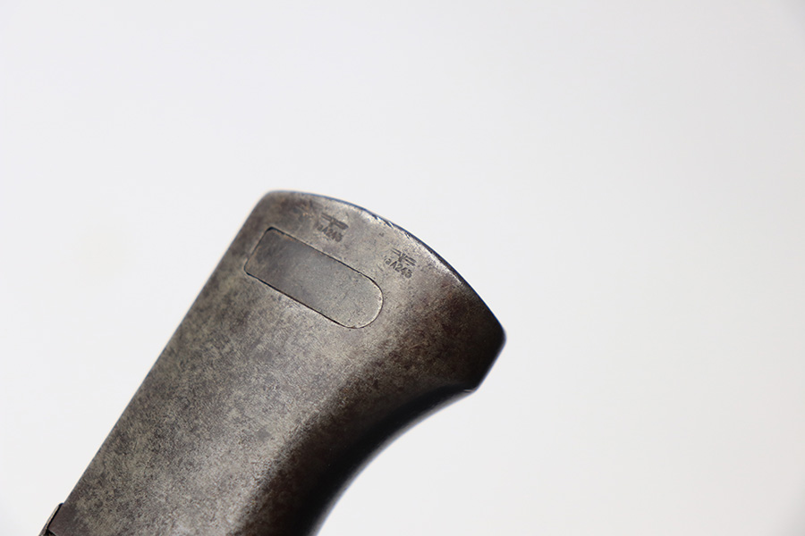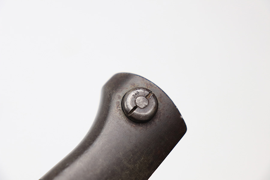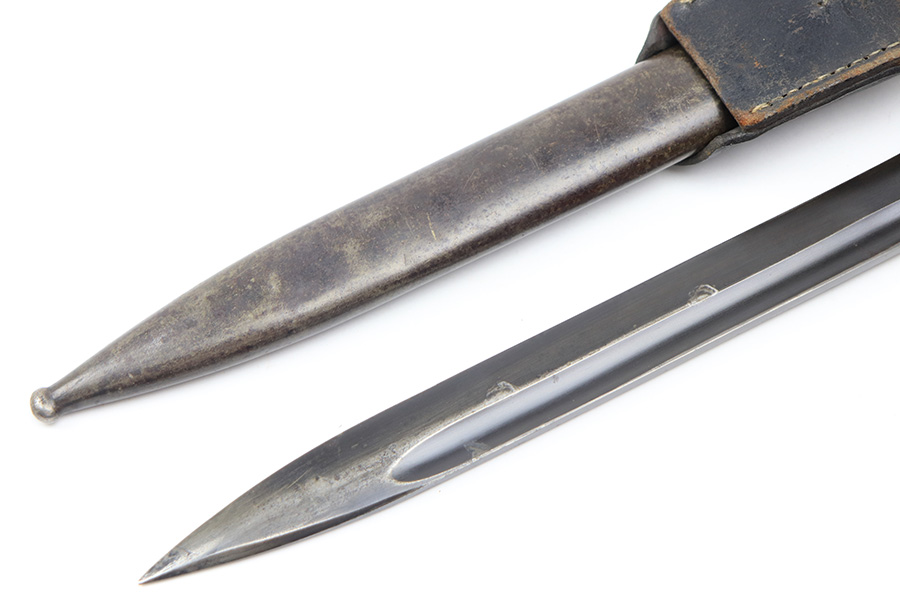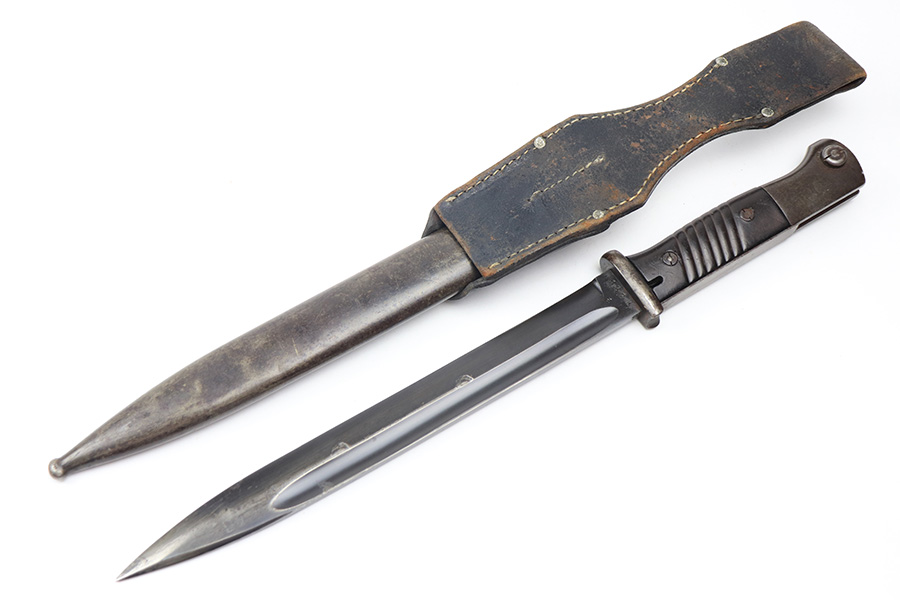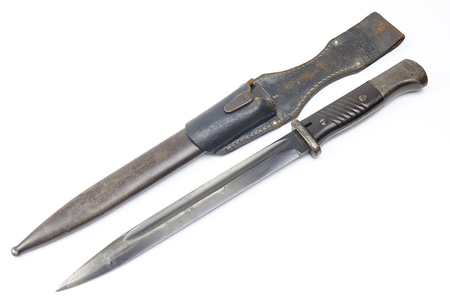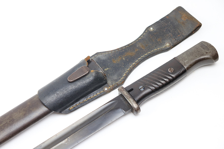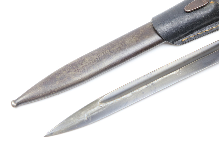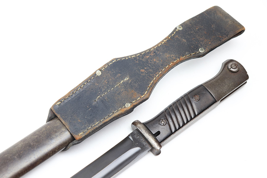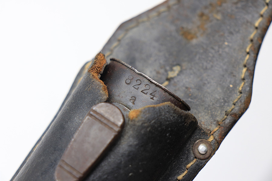 1/14/22 – This is an original 1939 K98 bayonet with a matching numbered scabbard. The bayonet blade is in great shape with some finish loss and mild patina but no rust, pitting, or signs of sharpening. The base of the blade is maker stamped on one side and serial numbered on the other. The metal portion of the handle has surface patina and discoloration throughout as shown. The scabbard has similar dark patina throughout and a few small dings in the metal. The leather frog is broken in the front leather around the scabbard knob, but the rest of the leather and stitching is in good condition.