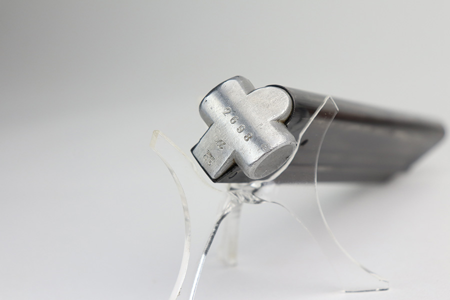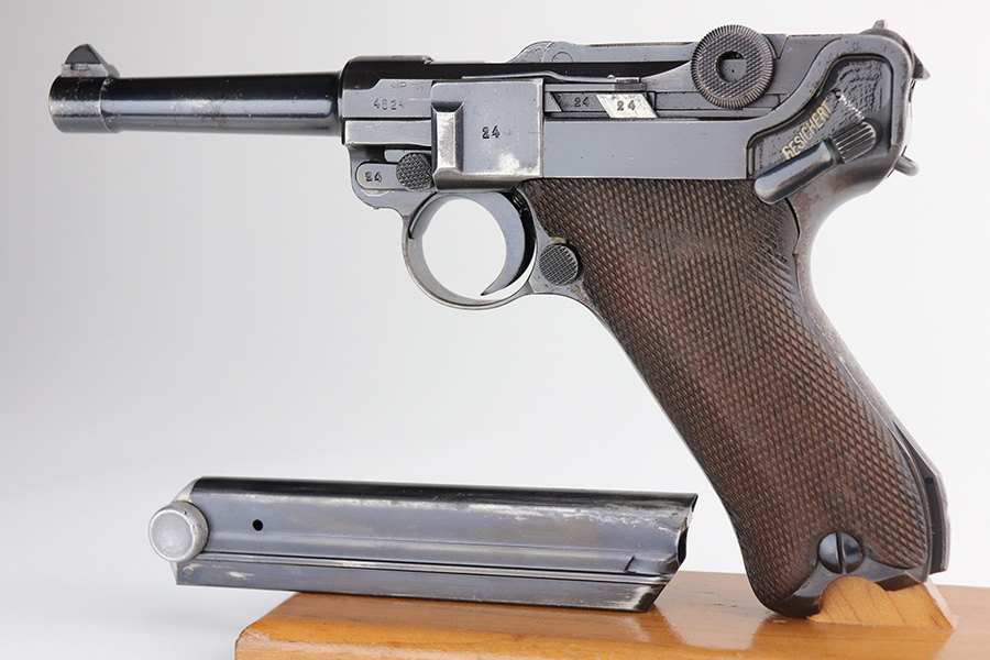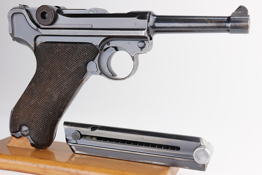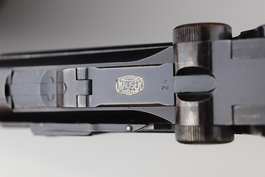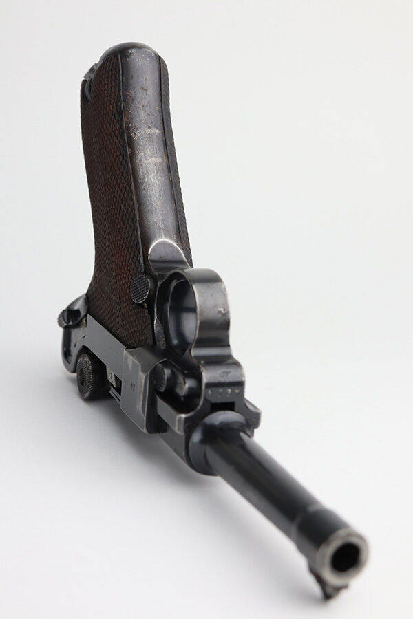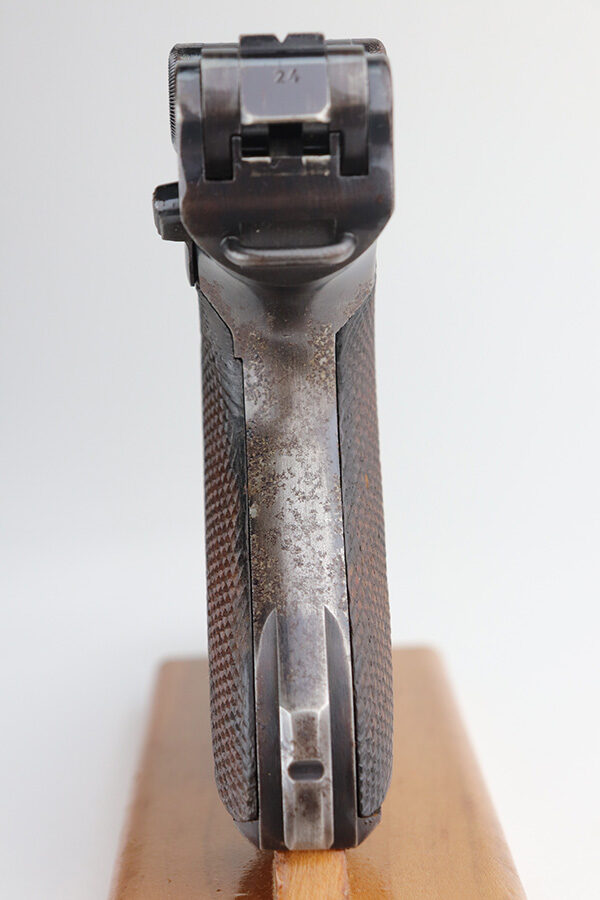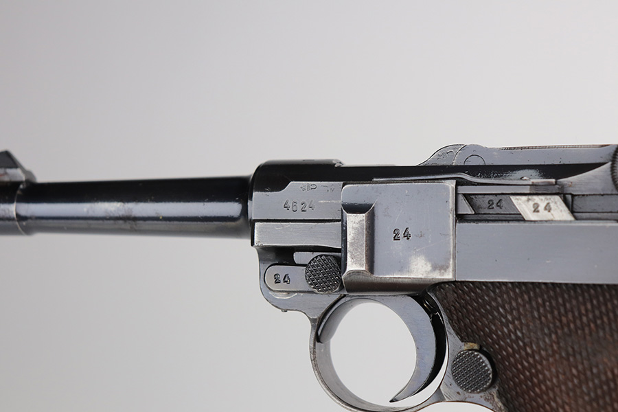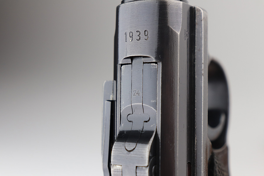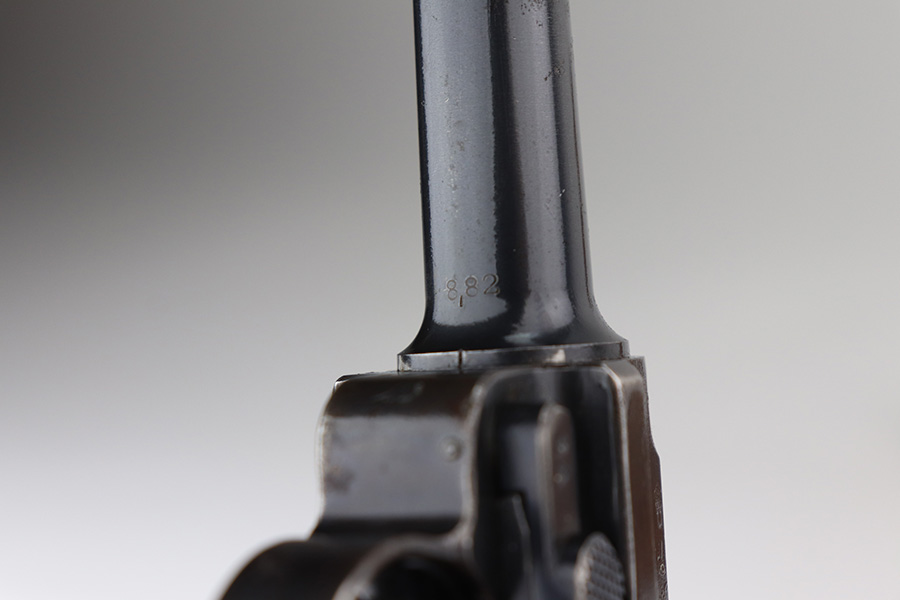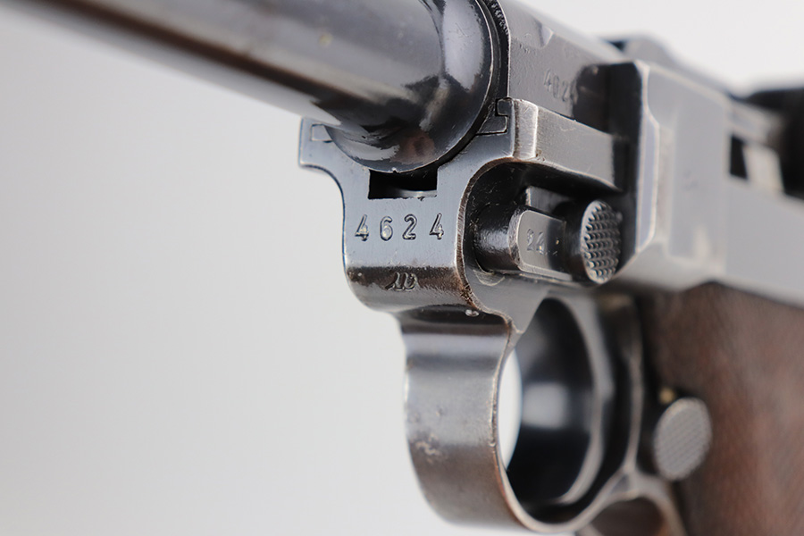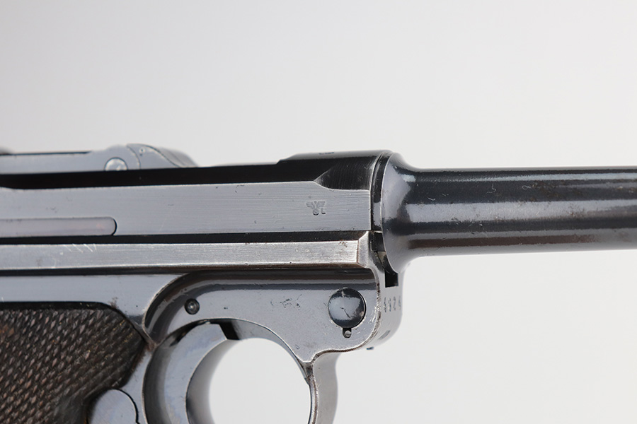 8/16/21 – This is a nice example of a Mauser Banner Luger issued to the Nazi police force in 1939. The gun is all matching, has the proper police “Eagle L” proof, and has an added police sear safety. It has retained roughly 80-85% of its original finish. Most of the finish loss is on the straps, where there is scratchy spotty wear, heavy spotty oxidation, and areas of minor pitting. Spotty wear and tiny dots of oxidation on the side plate and side rails. There are areas of minor wear, spotty oxidation and minor pitting on the barrel and around the muzzle. Comes with nice un-numbered grips (some light bruising here and there) and a mismatched WW2-era magazine. The bore is shiny with strong rifling and minor frosting in the grooves.