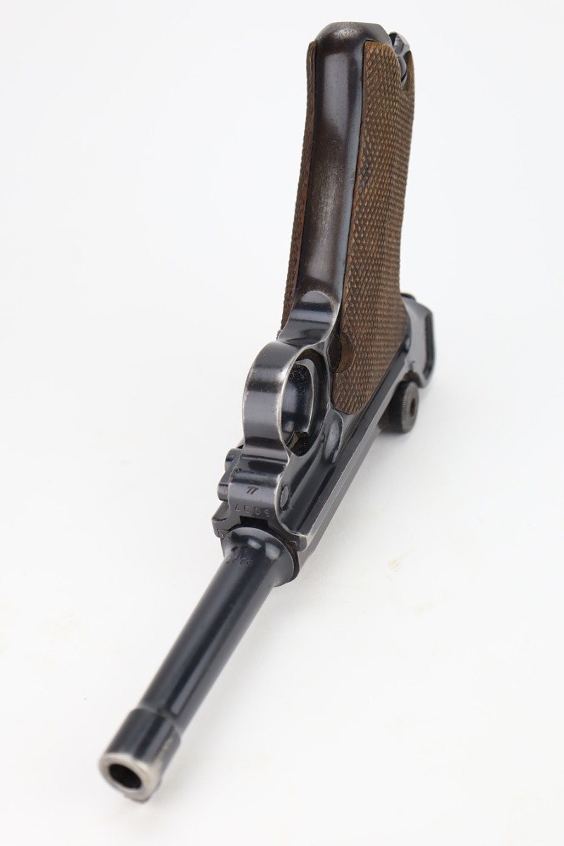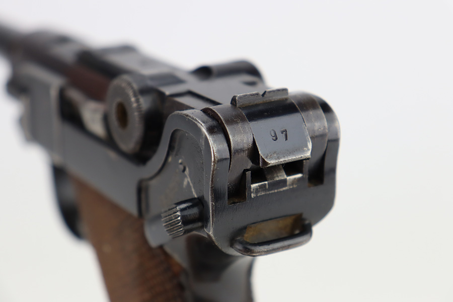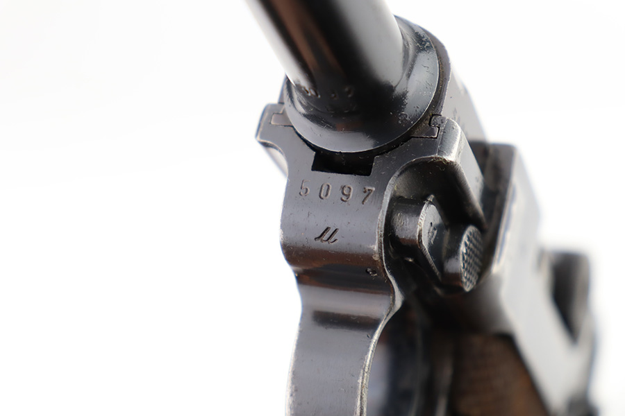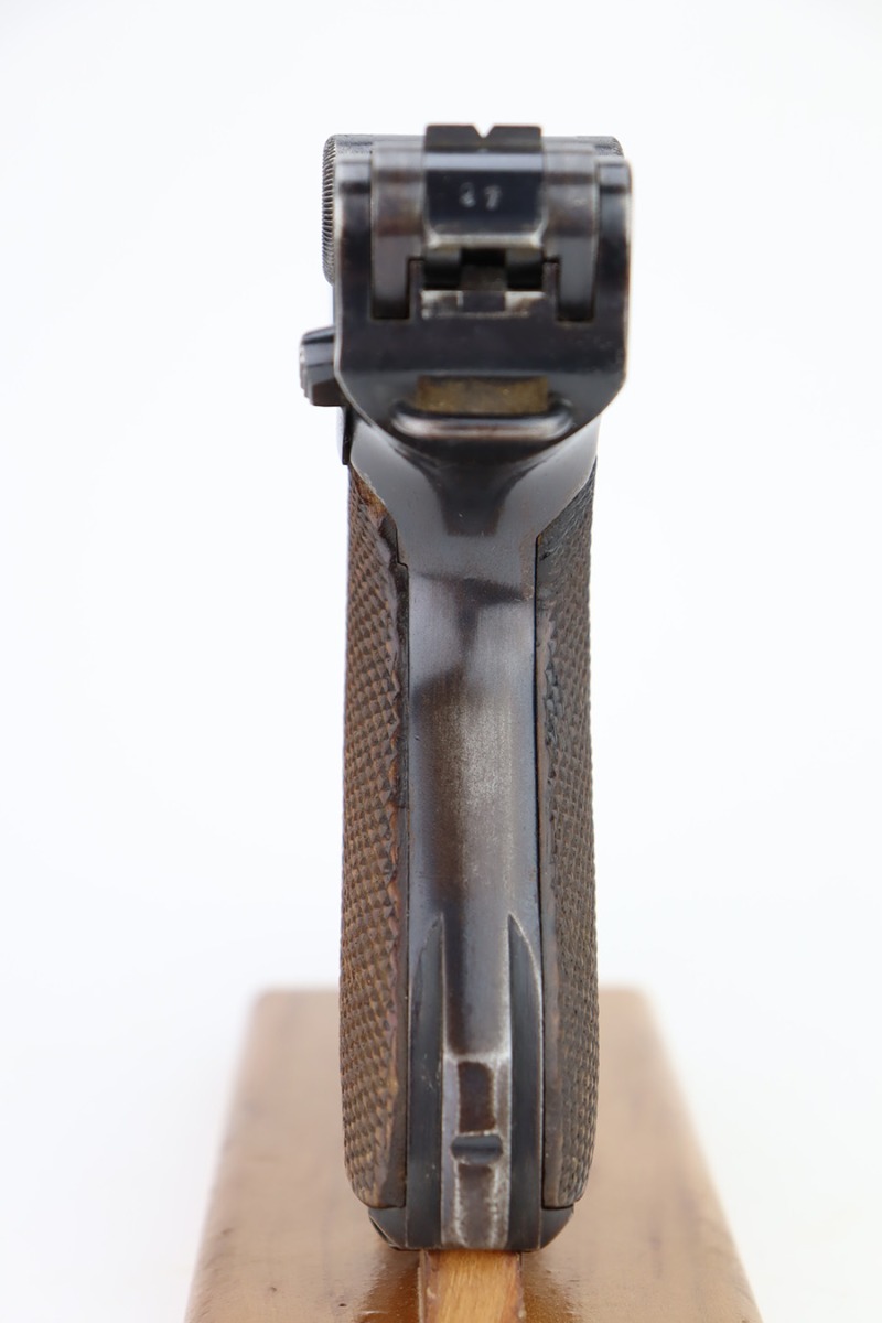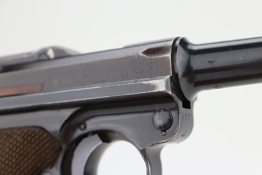 12/1/23 – This is a nice Mauser Luger issued to the German military in 1939. All matching with the proper “Eagle 63” military acceptance proofs. The bluing rates about 90-92% with wear around the muzzle and on the side plate. Very minor thinning and light brown patina on the grip straps. Fitted with un-numbered wood grips – tiny chip in the corner of the left panel. Comes with a mismatched police “Star K” marked magazine. The bore has good rifling, but there is frosting in the grooves.