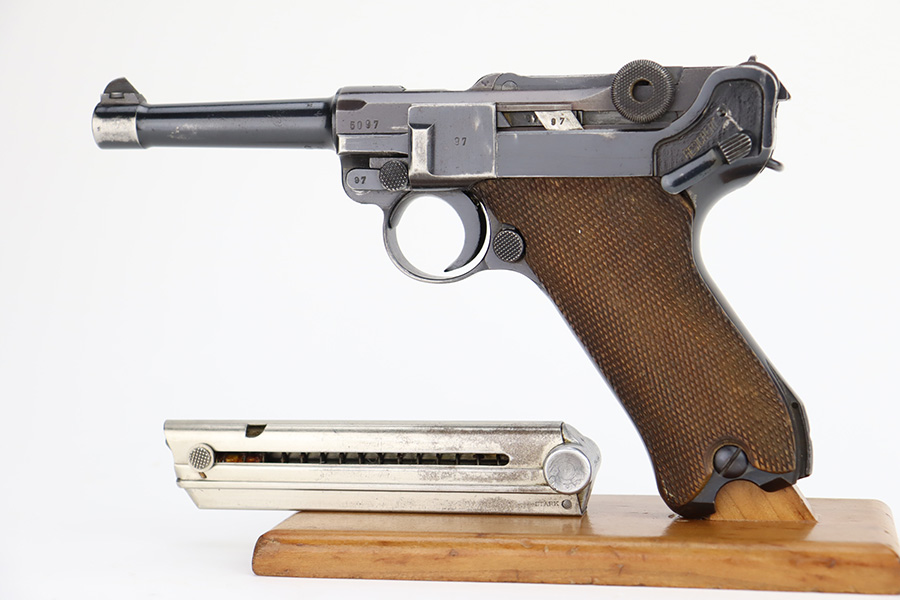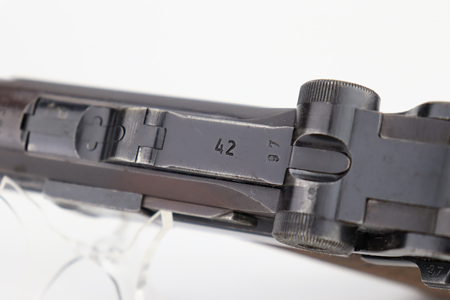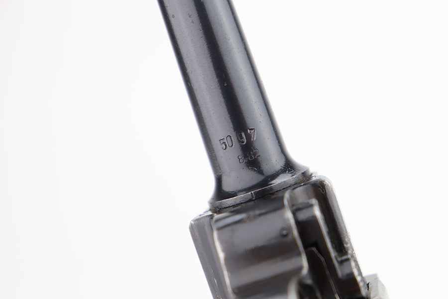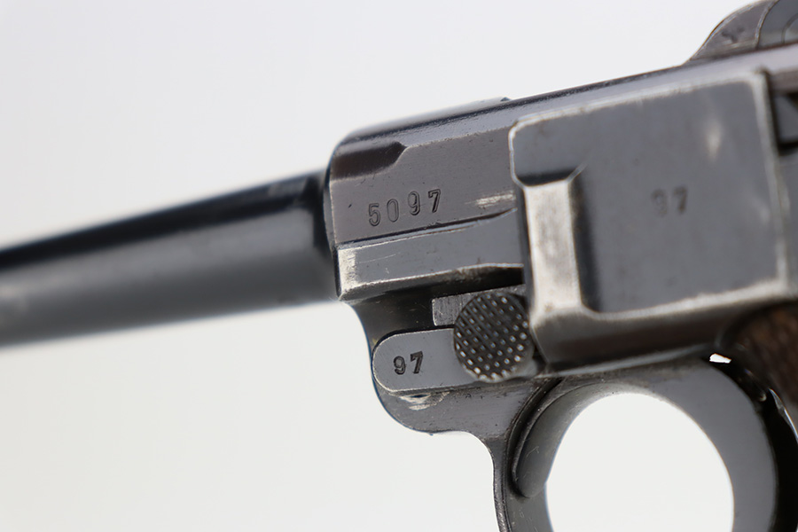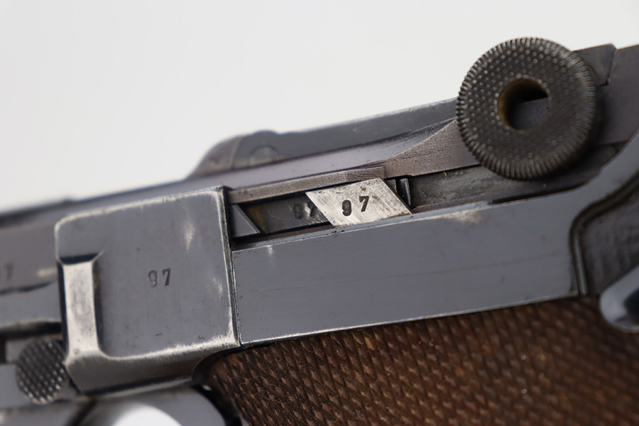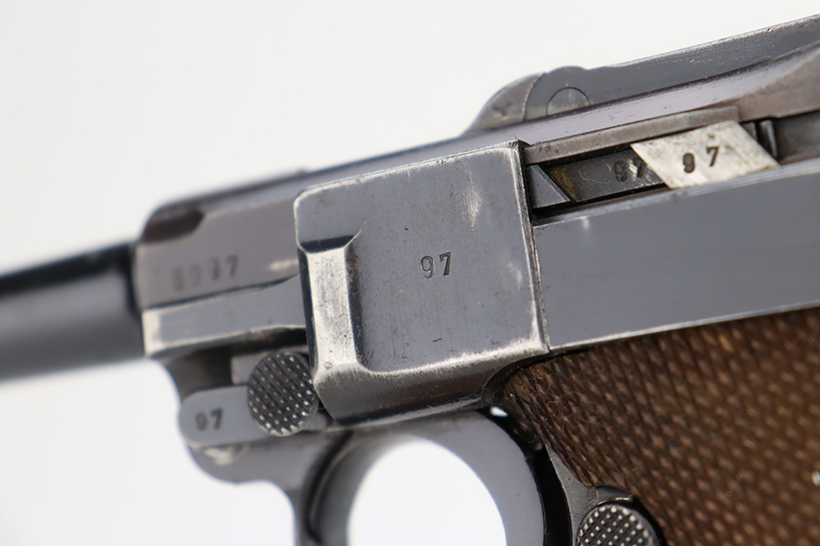 12/1/23 – This is a nice Mauser Luger issued to the German military in 1939. All matching with the proper “Eagle 63” military acceptance proofs. The bluing rates about 90-92% with wear around the muzzle and on the side plate. Very minor thinning and light brown patina on the grip straps. Fitted with un-numbered wood grips – tiny chip in the corner of the left panel. Comes with a mismatched police “Star K” marked magazine. The bore has good rifling, but there is frosting in the grooves.