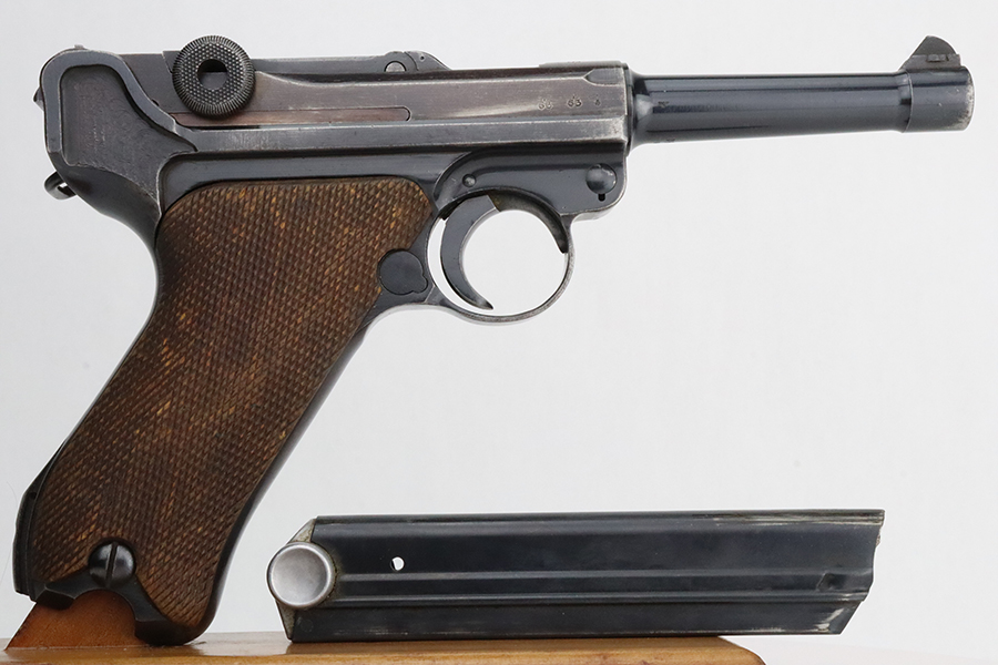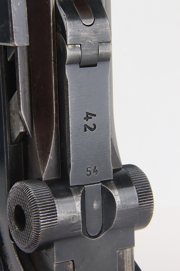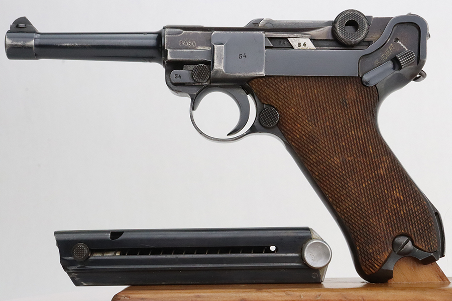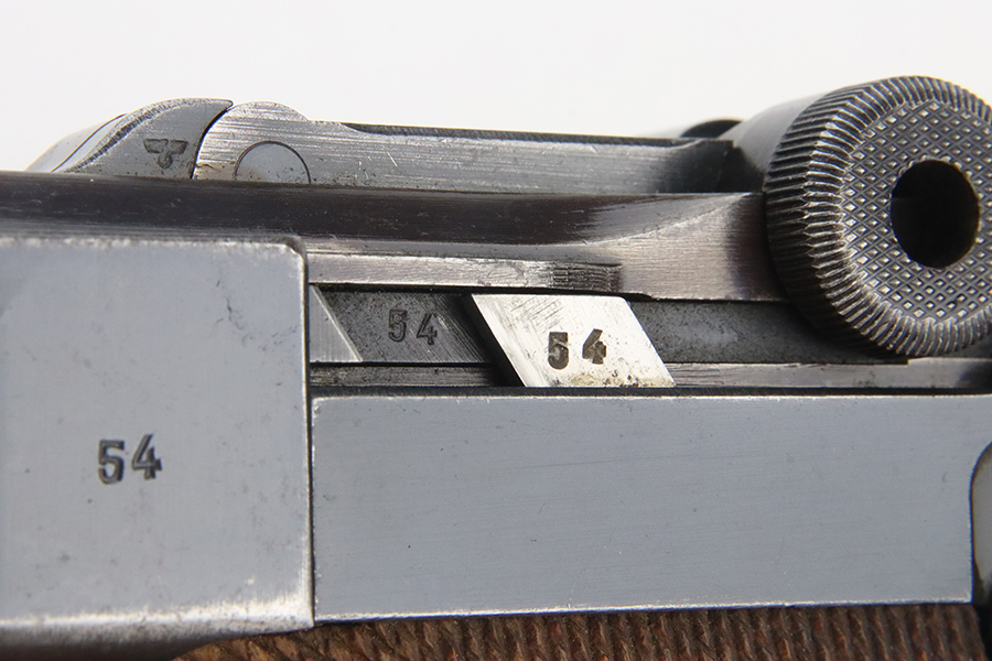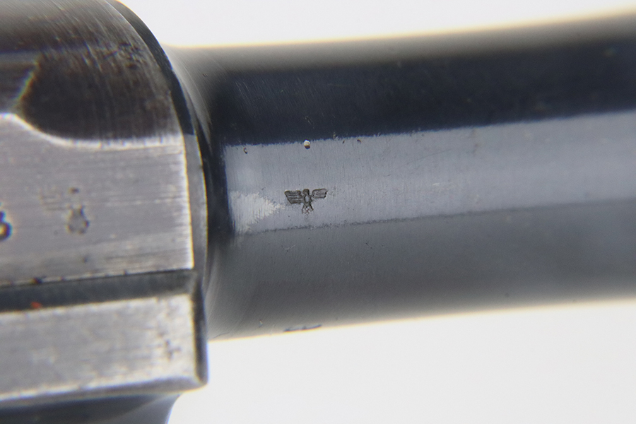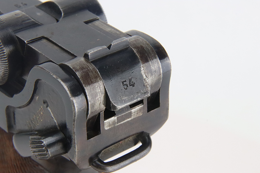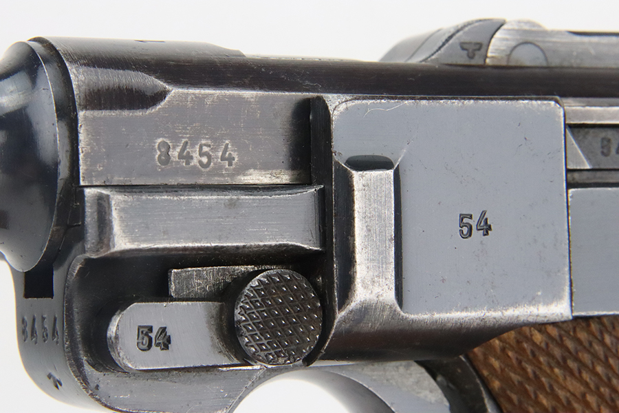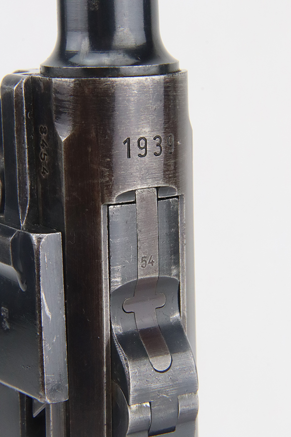 2/29/24 – This is a nice example of a Mauser Luger issued to the Nazi military in 1939. All matching with the proper “Eagle 63” military acceptance proofs. Its original finish rates roughly 85%. There is general high edge wear, some light scratchy wear around the chamber, and some thinning and spotty oxidation on the grip straps. Fitted with un-numbered wood grips and comes with a mismatched “Eagle 63” magazine. The bore has good rifling with very light pin-pricking throughout.