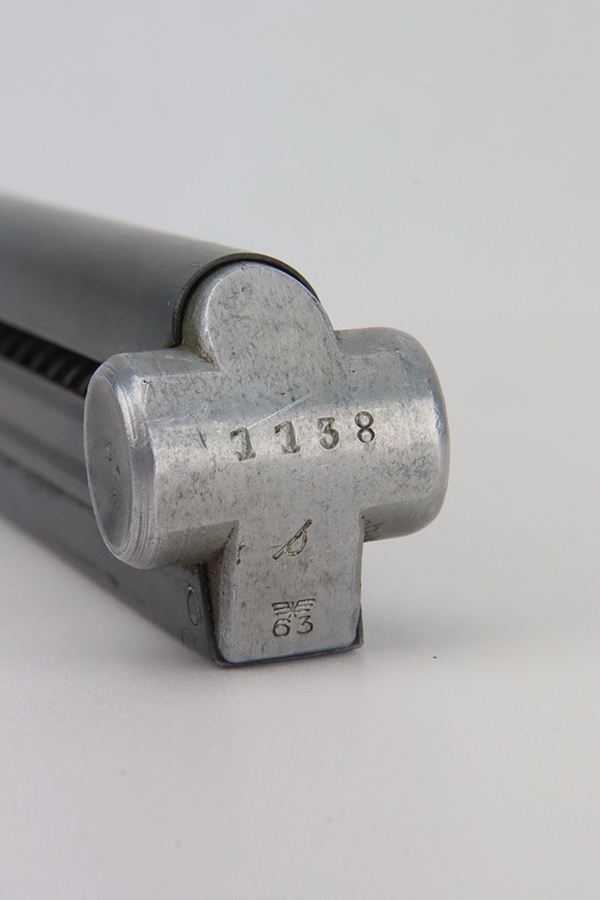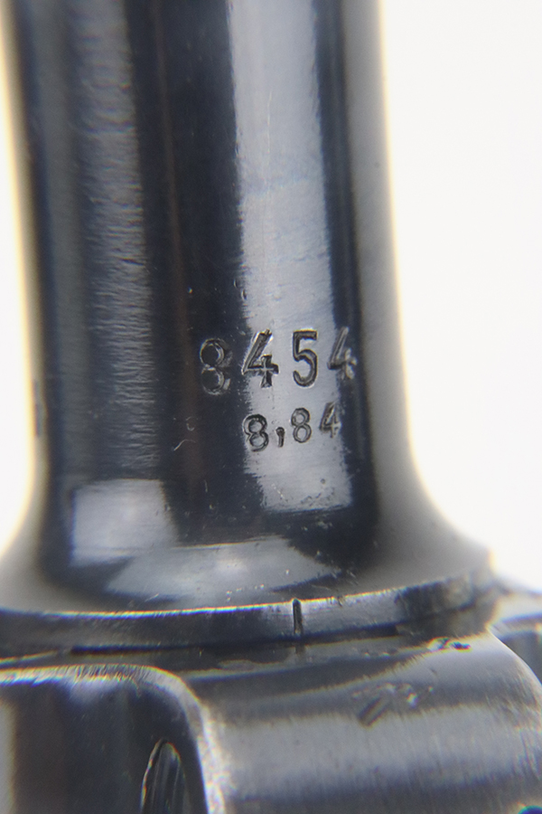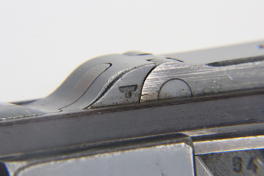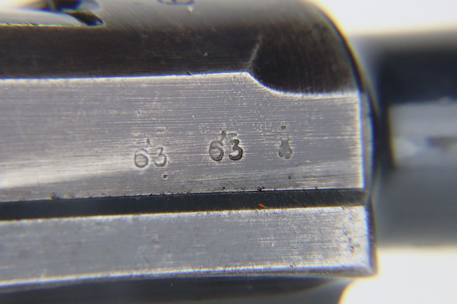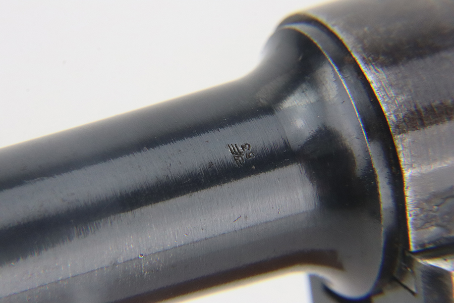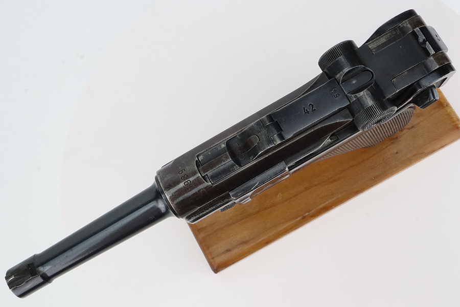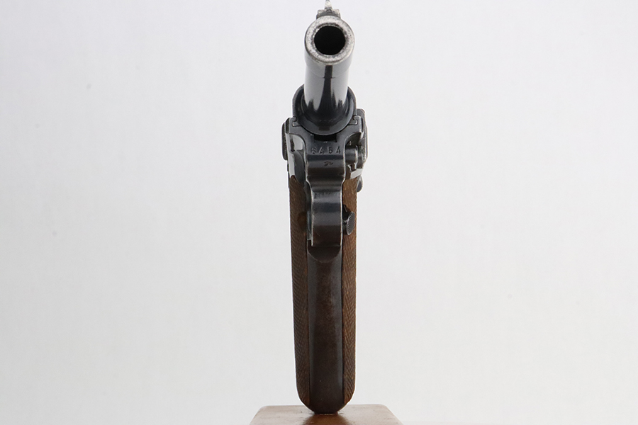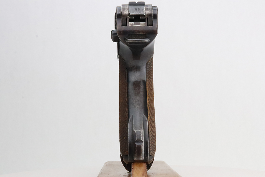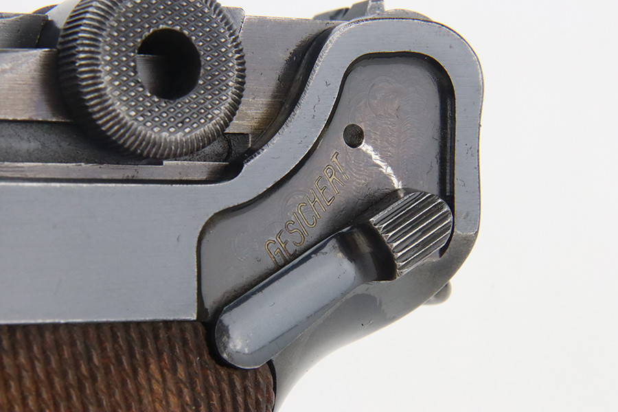2/29/24 – This is a nice example of a Mauser Luger issued to the Nazi military in 1939. All matching with the proper “Eagle 63” military acceptance proofs. Its original finish rates roughly 85%. There is general high edge wear, some light scratchy wear around the chamber, and some thinning and spotty oxidation on the grip straps. Fitted with un-numbered wood grips and comes with a mismatched “Eagle 63” magazine. The bore has good rifling with very light pin-pricking throughout.