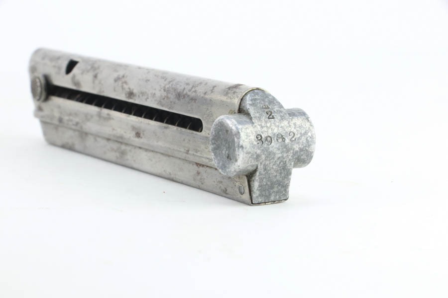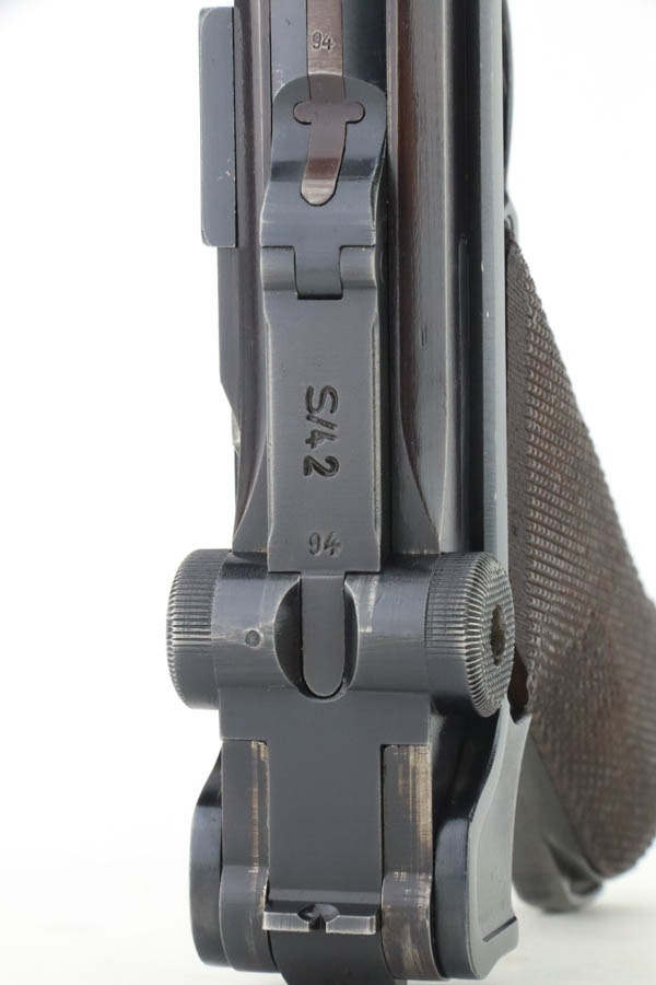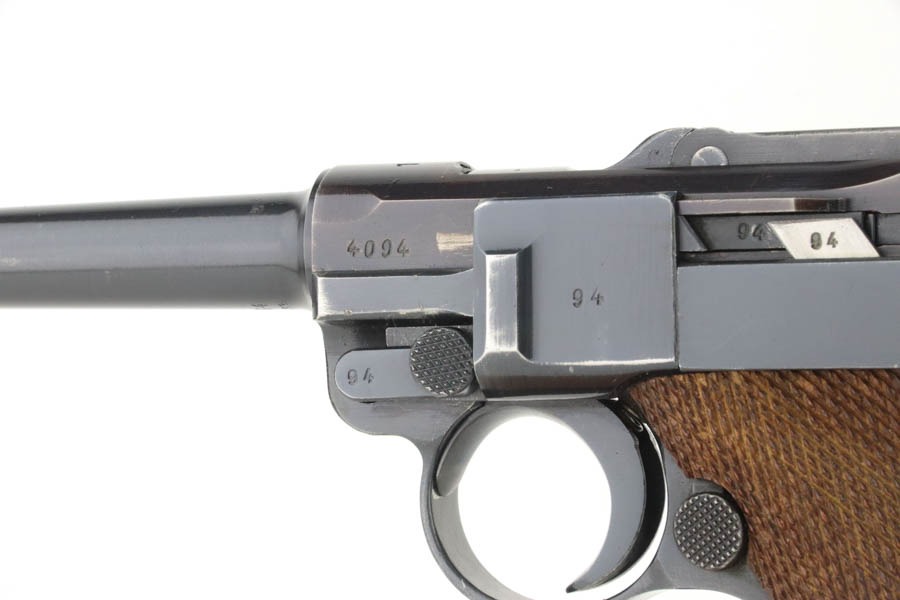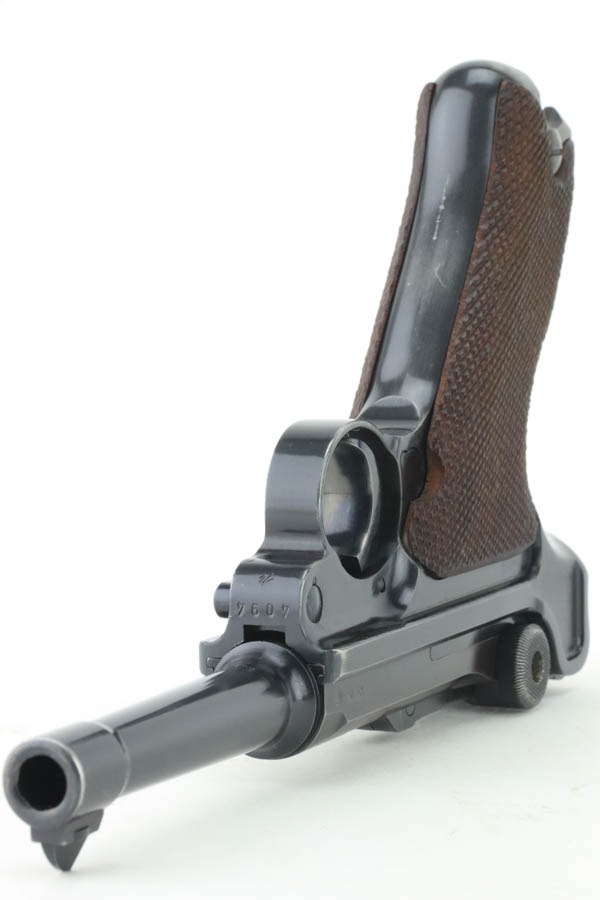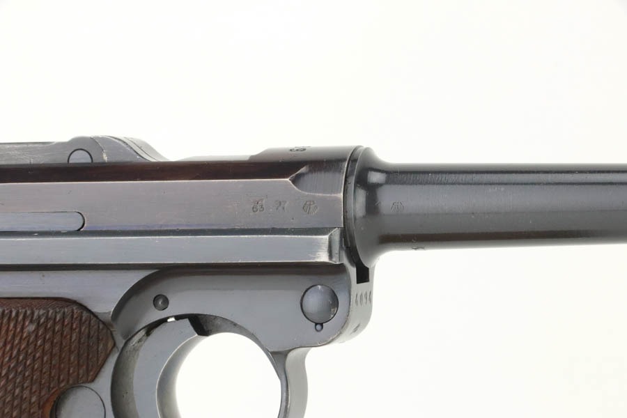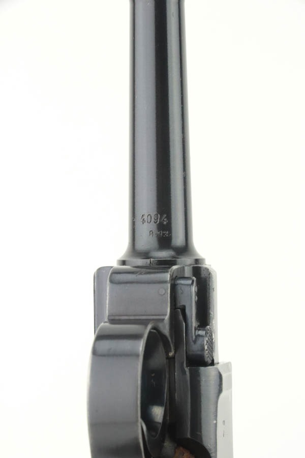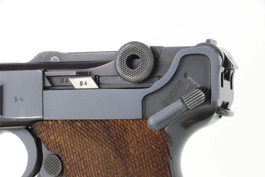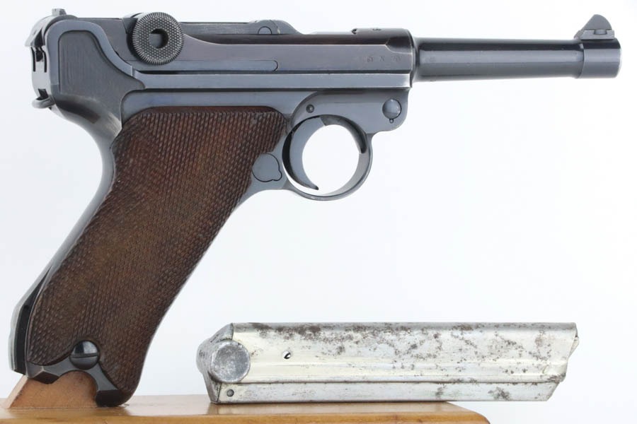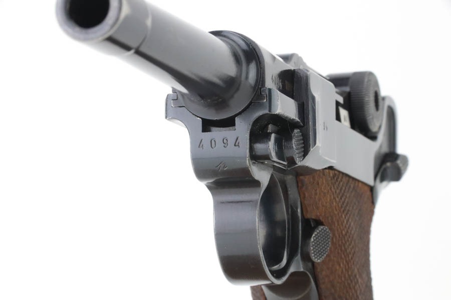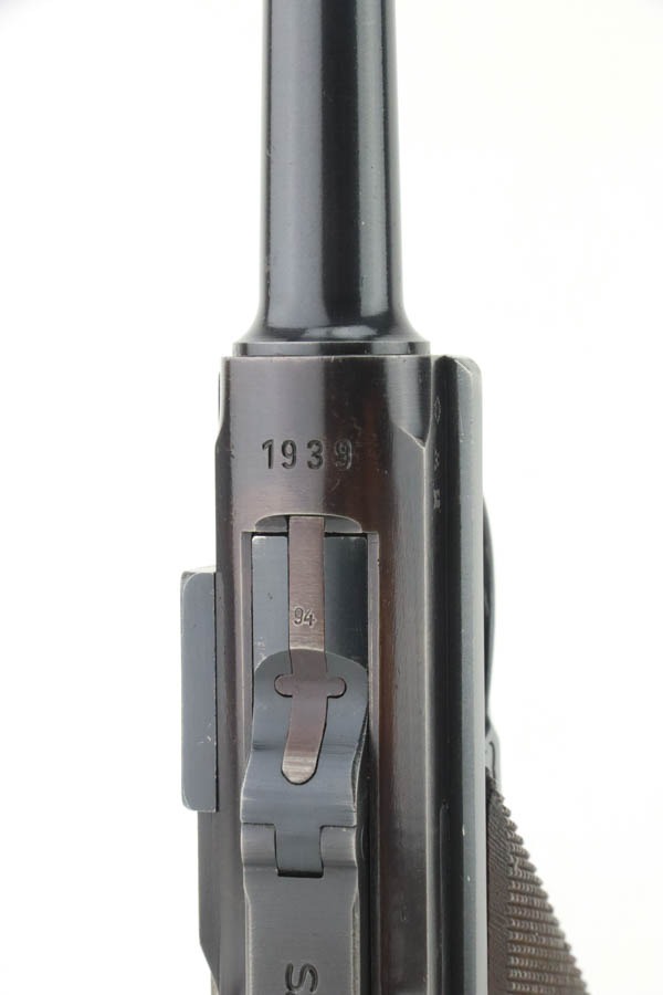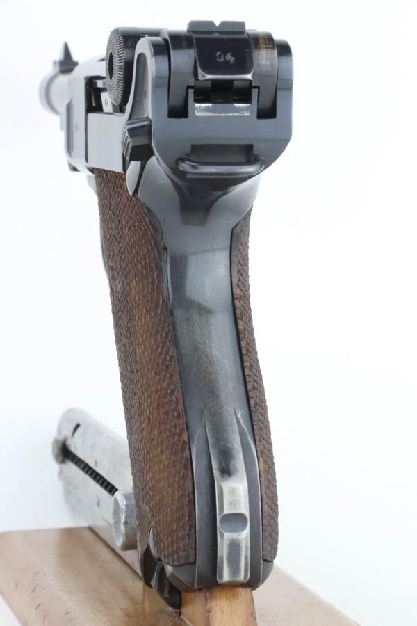 10/1/24 – This is a very nice example of a Mauser Luger issued to the Nazi military in 1939. All matching with the proper “Eagle 63” military acceptance proofs. It has retained about 90% of its original bluing. There is minor general high edge wear, but most of the finish loss is on the back strap. Fitted with excellent un-numbered wood grips. Comes with a mismatched Simpson magazine (the magazine fits pretty tight). Near-mint bore.