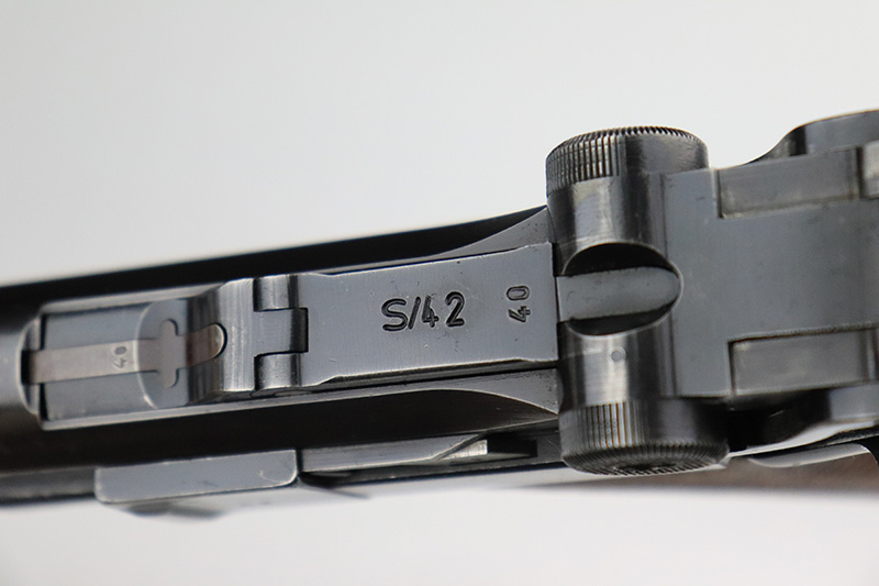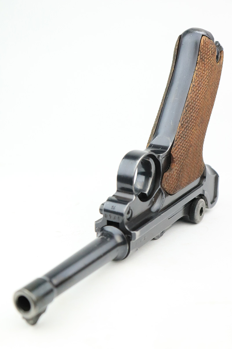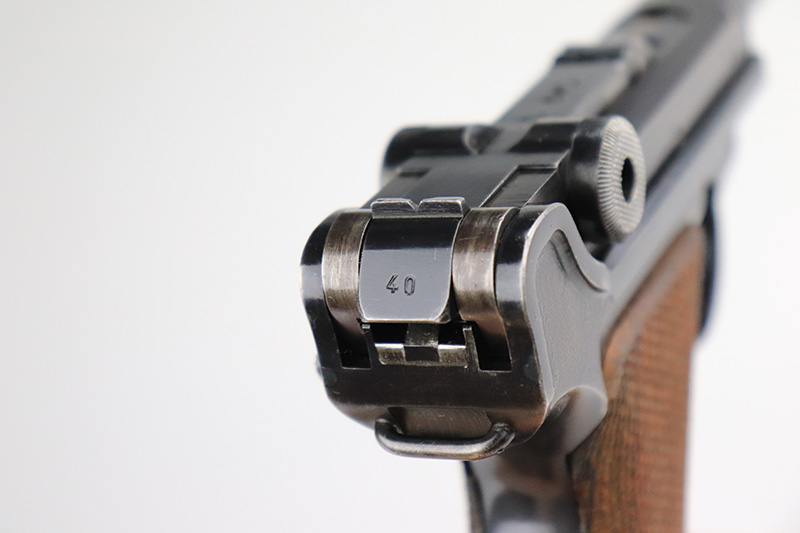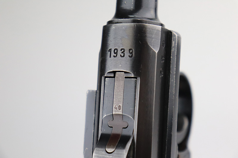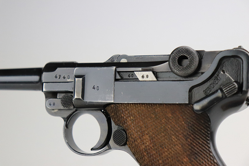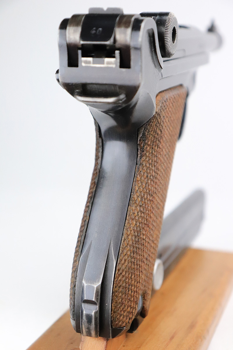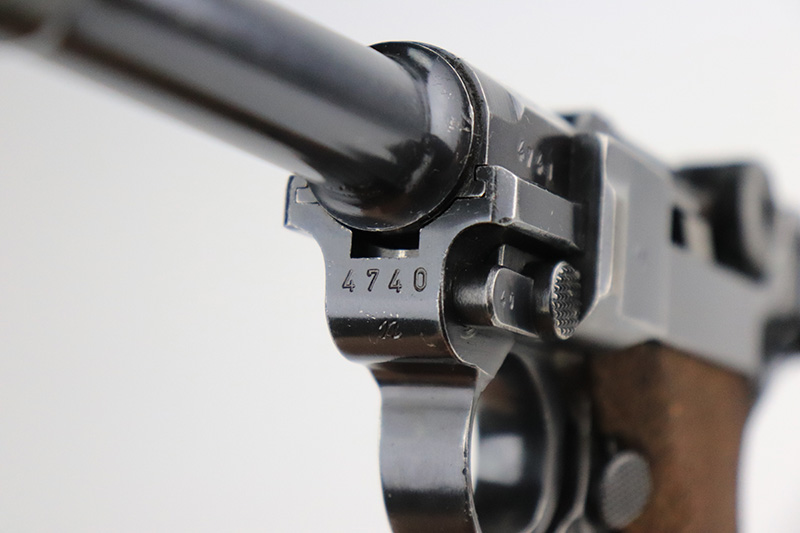9/22/22 – This is a matching and original Nazi Mauser Luger from 1939. All matching numbered parts on the metal, with a period original but mismatched magazine. The grips are unnumbered and E/135 marked. The bluing is original and rates in the low 90s, with wear on muzzle, sideplate, stock lug and bottom of front strap. Bore is shiny with strong rifling but a little frost throughout. The grips are sharply checkered with a little handling wear on both panels.