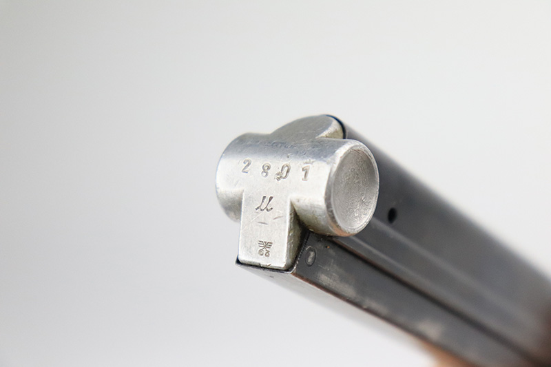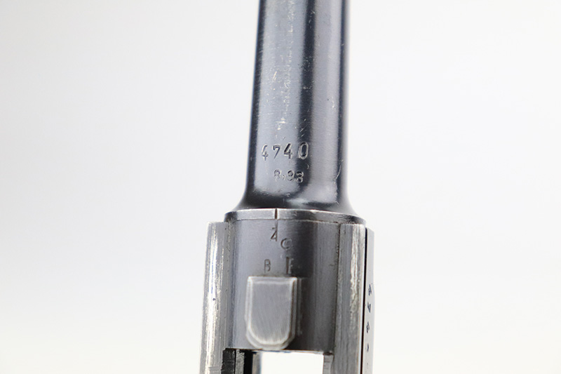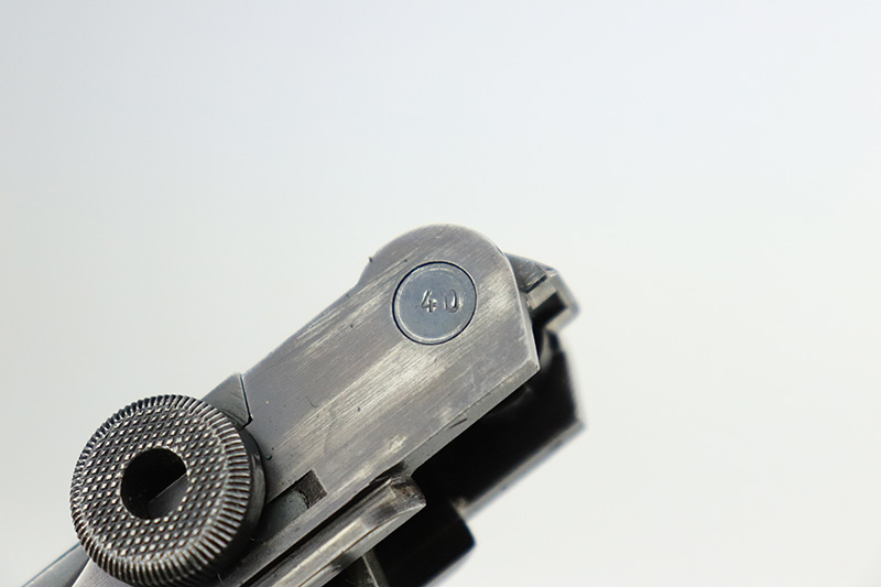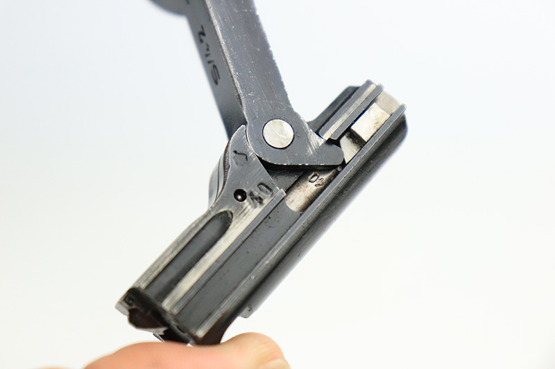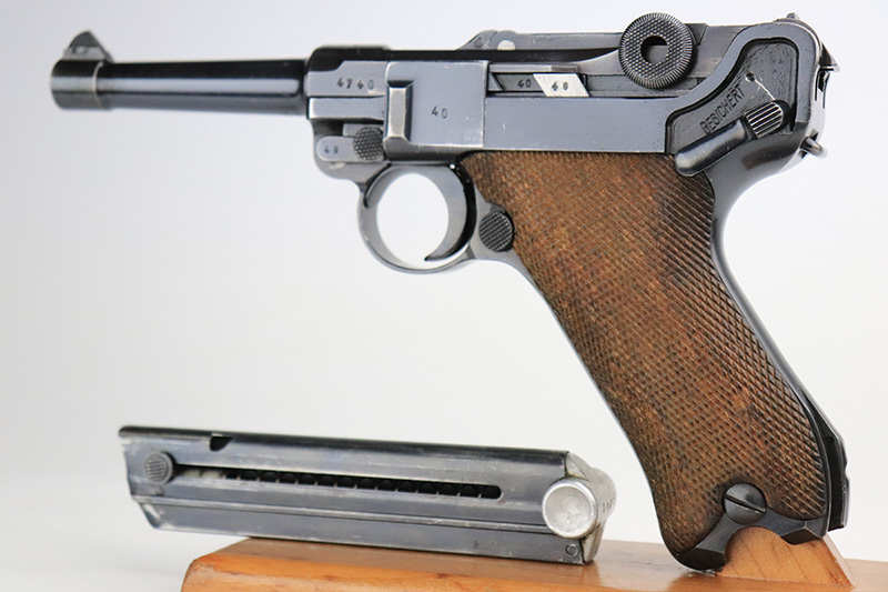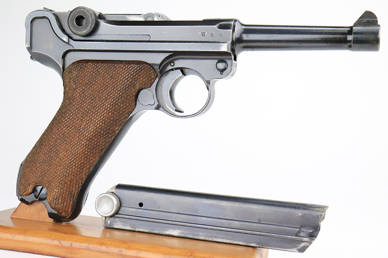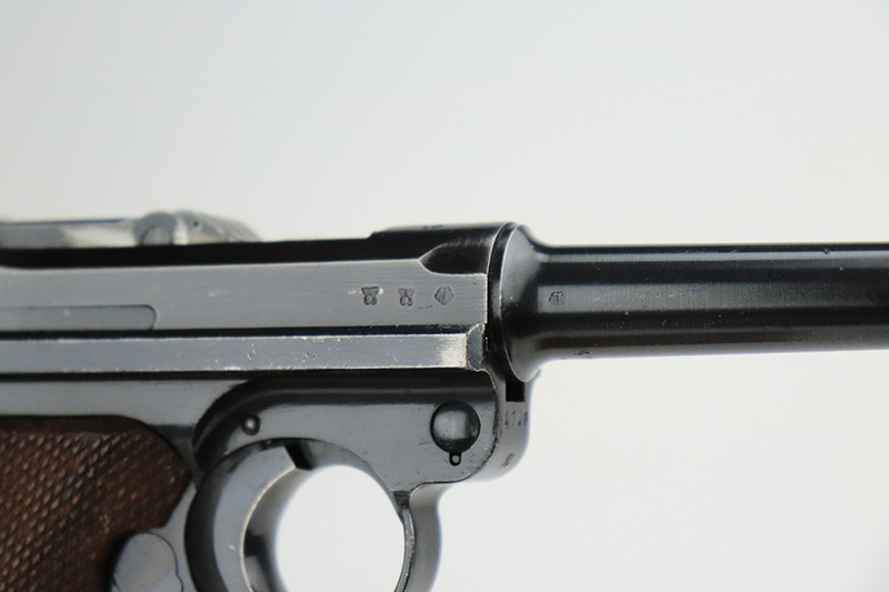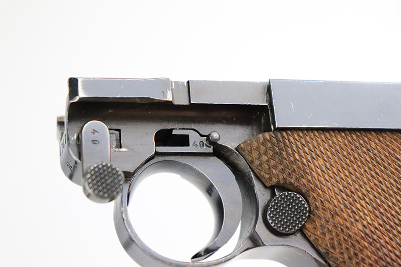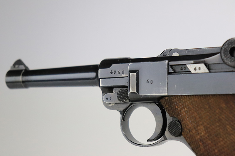 9/22/22 – This is a matching and original Nazi Mauser Luger from 1939. All matching numbered parts on the metal, with a period original but mismatched magazine. The grips are unnumbered and E/135 marked. The bluing is original and rates in the low 90s, with wear on muzzle, sideplate, stock lug and bottom of front strap. Bore is shiny with strong rifling but a little frost throughout. The grips are sharply checkered with a little handling wear on both panels.