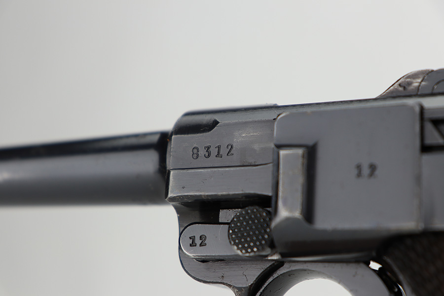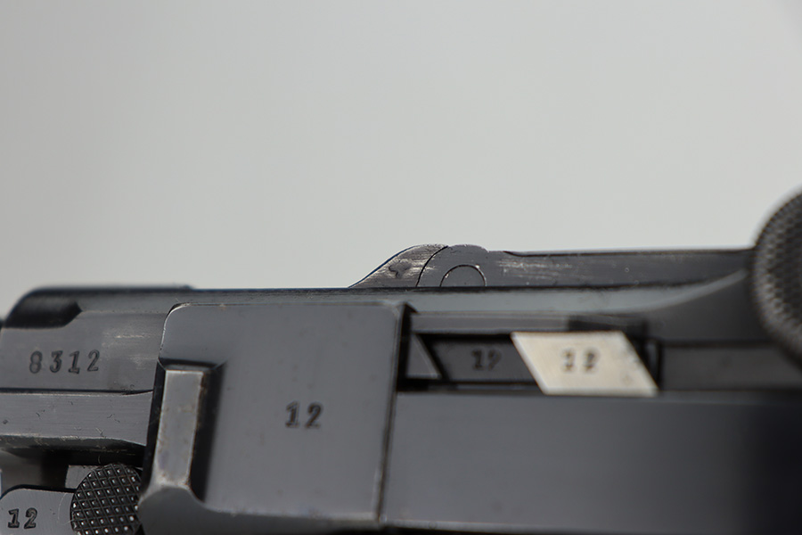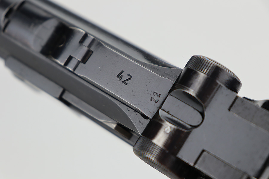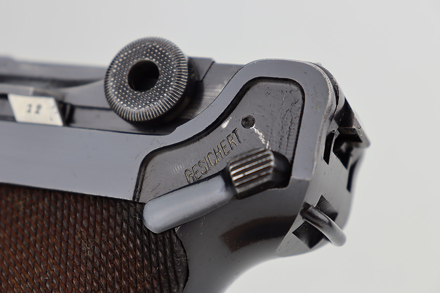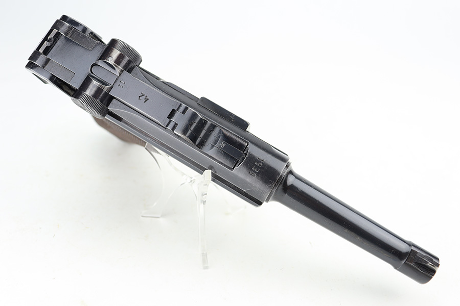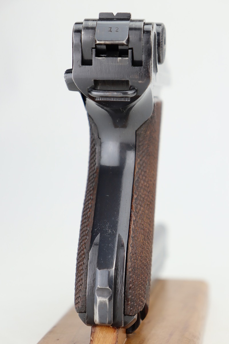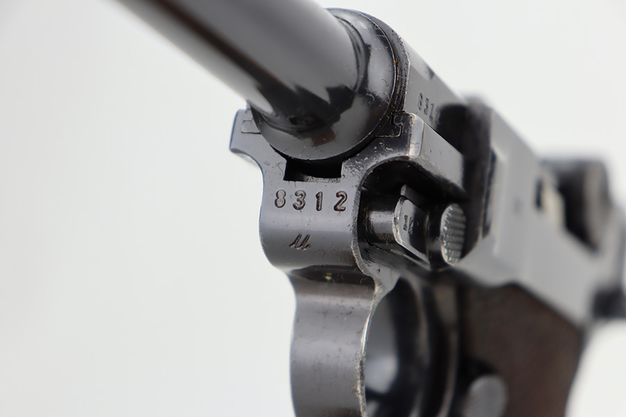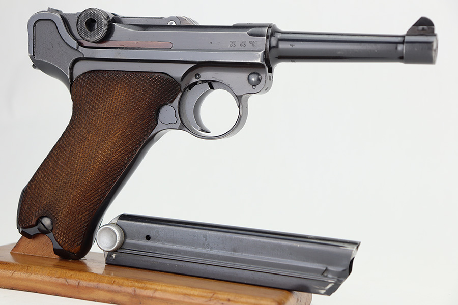 12/26/23 – This is an excellent Mauser Luger issued to the German military in 1939. All matching with the proper “Eagle 63” military acceptance proofs. The original finish rates about 96% with wear around the muzzle and on the left side of the barrel. Some tiny pin-pricking on the side plate. Fitted with excellent un-numbered wood grips. Comes with an original matching-numbered magazine. The bore is mostly shiny with strong rifling, but there is some light freckling in the grooves.