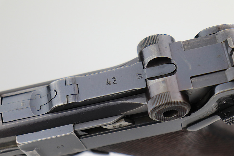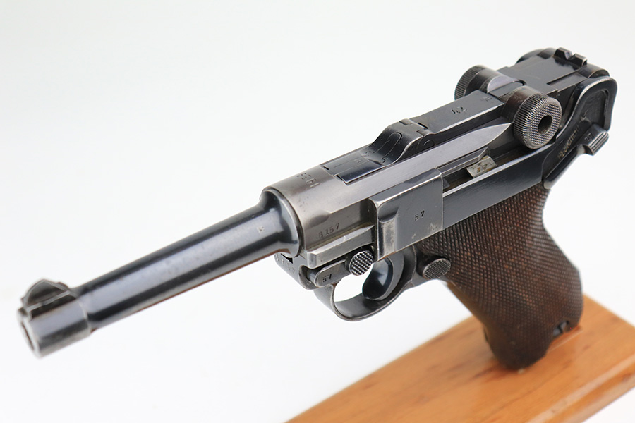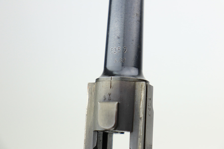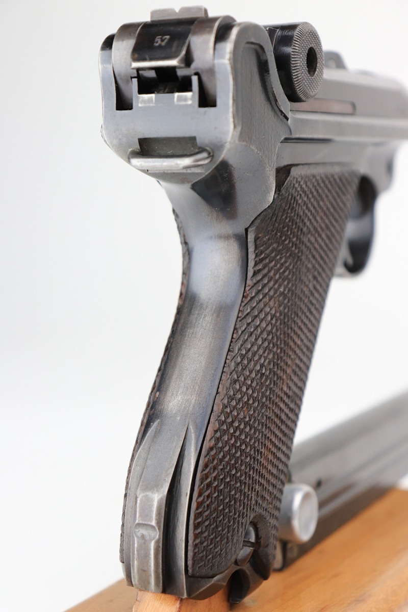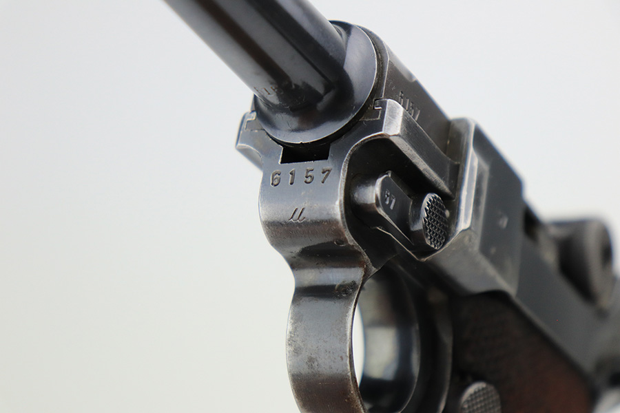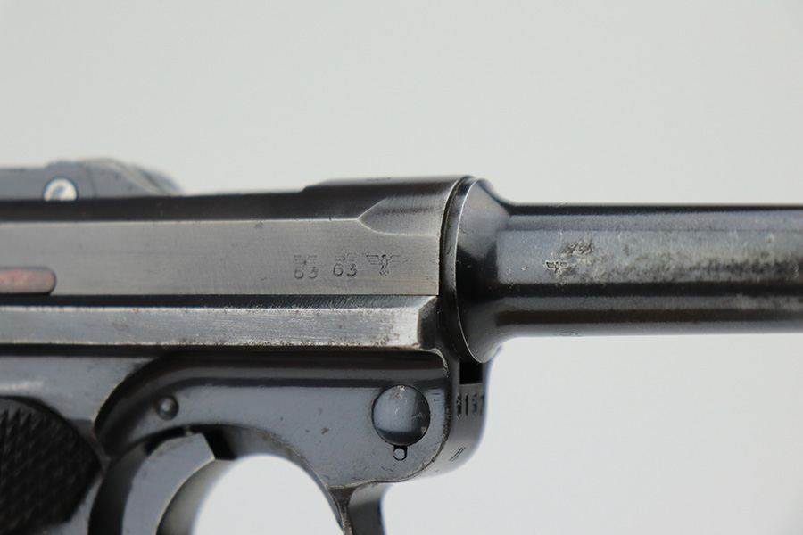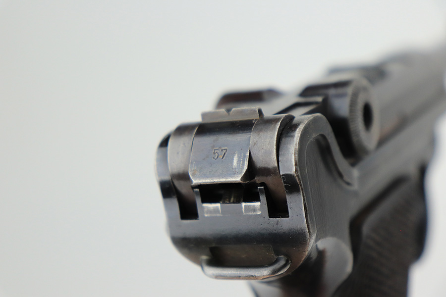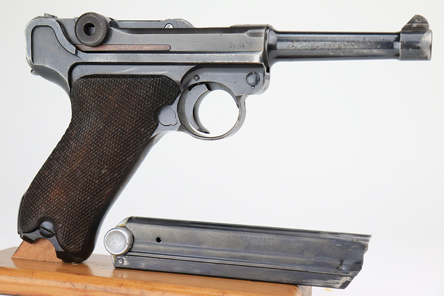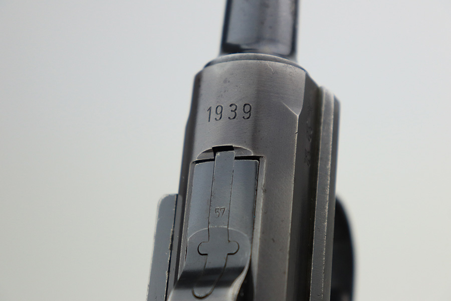 5/4/22 – This is a nice example of a Mauser Luger issued to the Nazi military in 1939. The gun is all matching and has the proper “Eagle Stick 63” Nazi military acceptance proofs. It also comes with one original matching-numbered magazine. It has retained somewhere between 85-90% of its original bluing. There is wear around the muzzle, on the high edges, and on the side plate. Spotty wear along the barrel and minor thinning on the grip straps and on the top of the receiver. A few tiny dots of oxidation on the top of the receiver as well. Comes with excellent un-numbered wood grips – small chip in the top corner of the left panel. The bore has good rifling, but there are small spots of minor oxidation throughout.