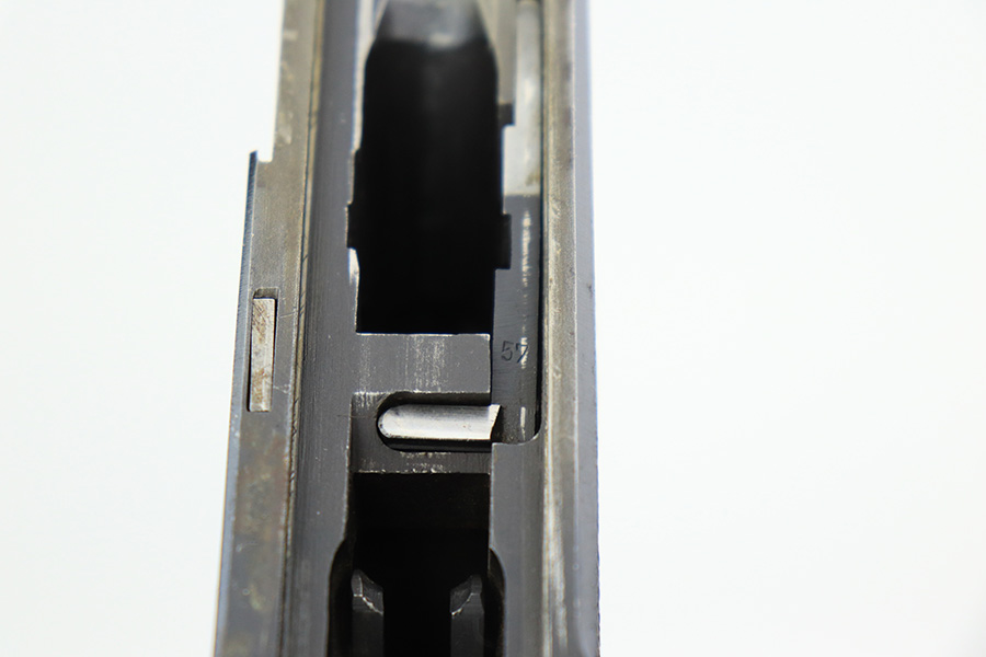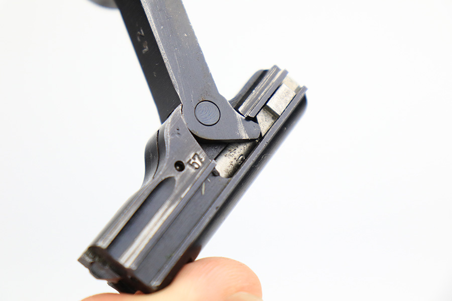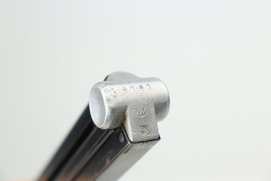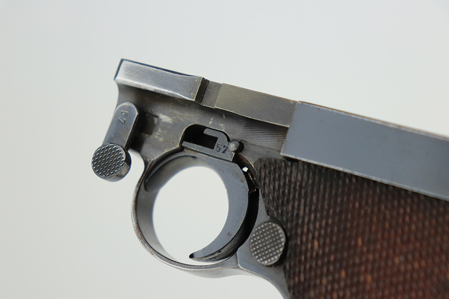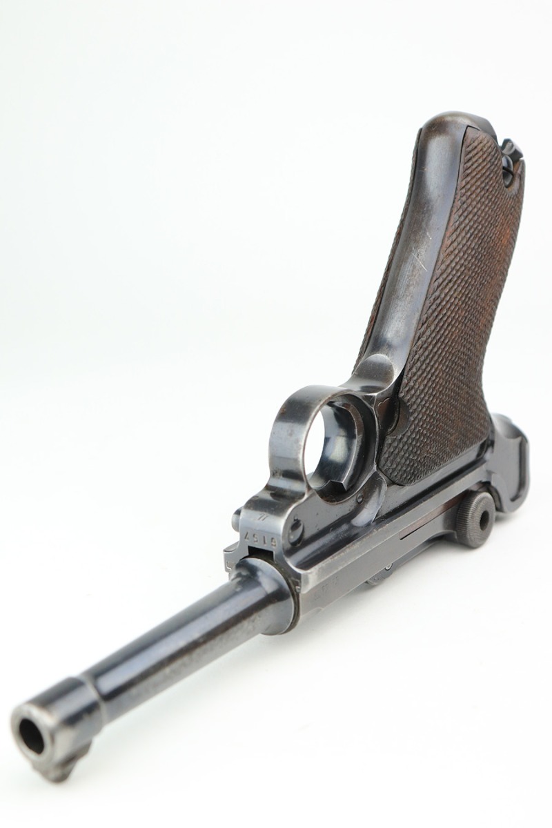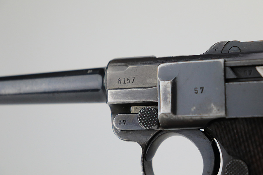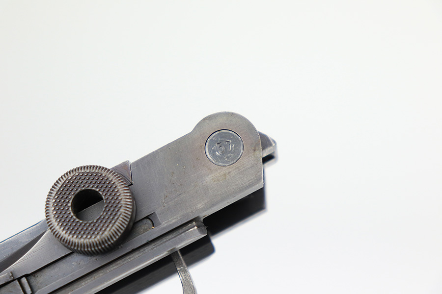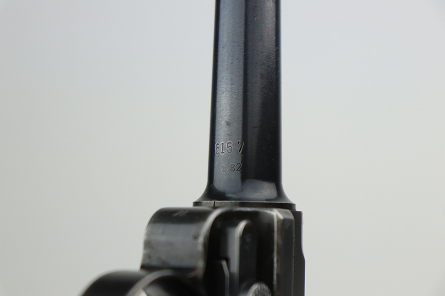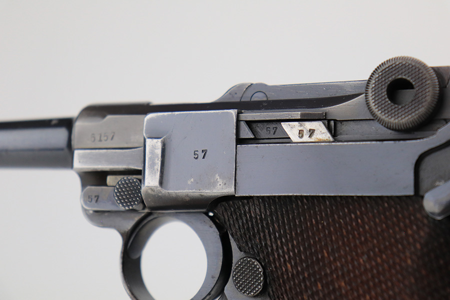 5/4/22 – This is a nice example of a Mauser Luger issued to the Nazi military in 1939. The gun is all matching and has the proper “Eagle Stick 63” Nazi military acceptance proofs. It also comes with one original matching-numbered magazine. It has retained somewhere between 85-90% of its original bluing. There is wear around the muzzle, on the high edges, and on the side plate. Spotty wear along the barrel and minor thinning on the grip straps and on the top of the receiver. A few tiny dots of oxidation on the top of the receiver as well. Comes with excellent un-numbered wood grips – small chip in the top corner of the left panel. The bore has good rifling, but there are small spots of minor oxidation throughout.