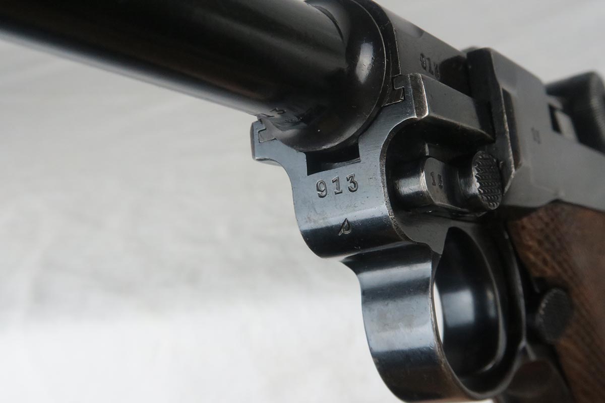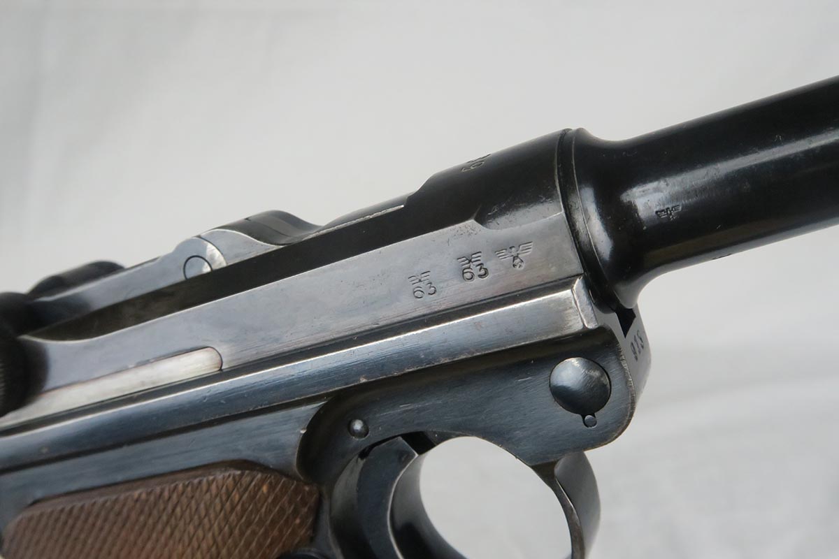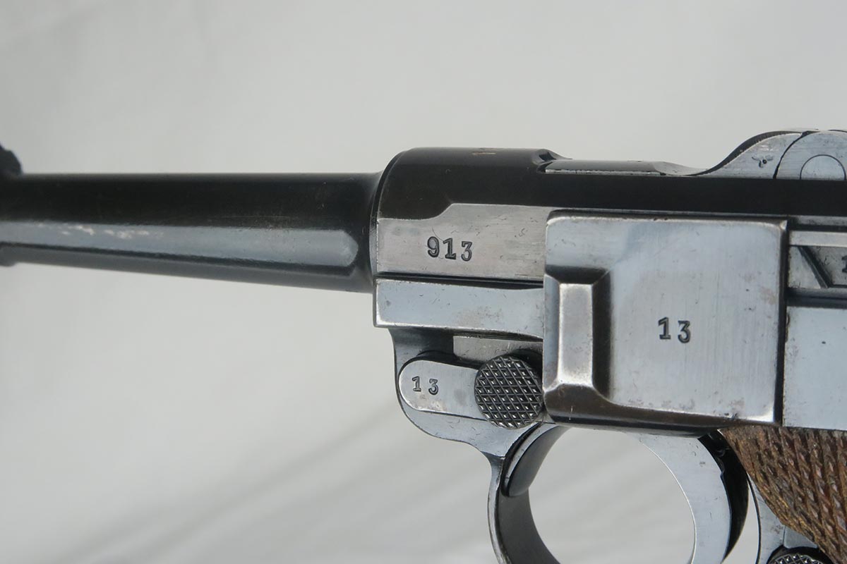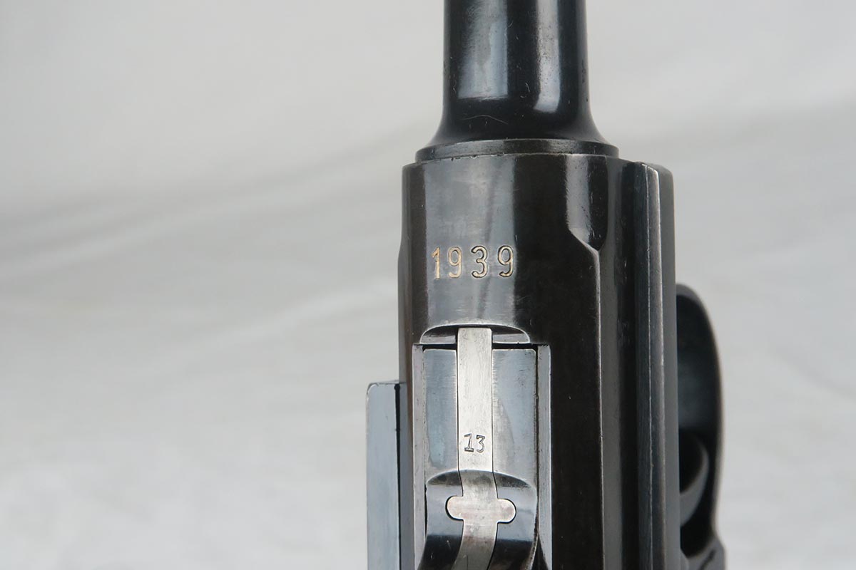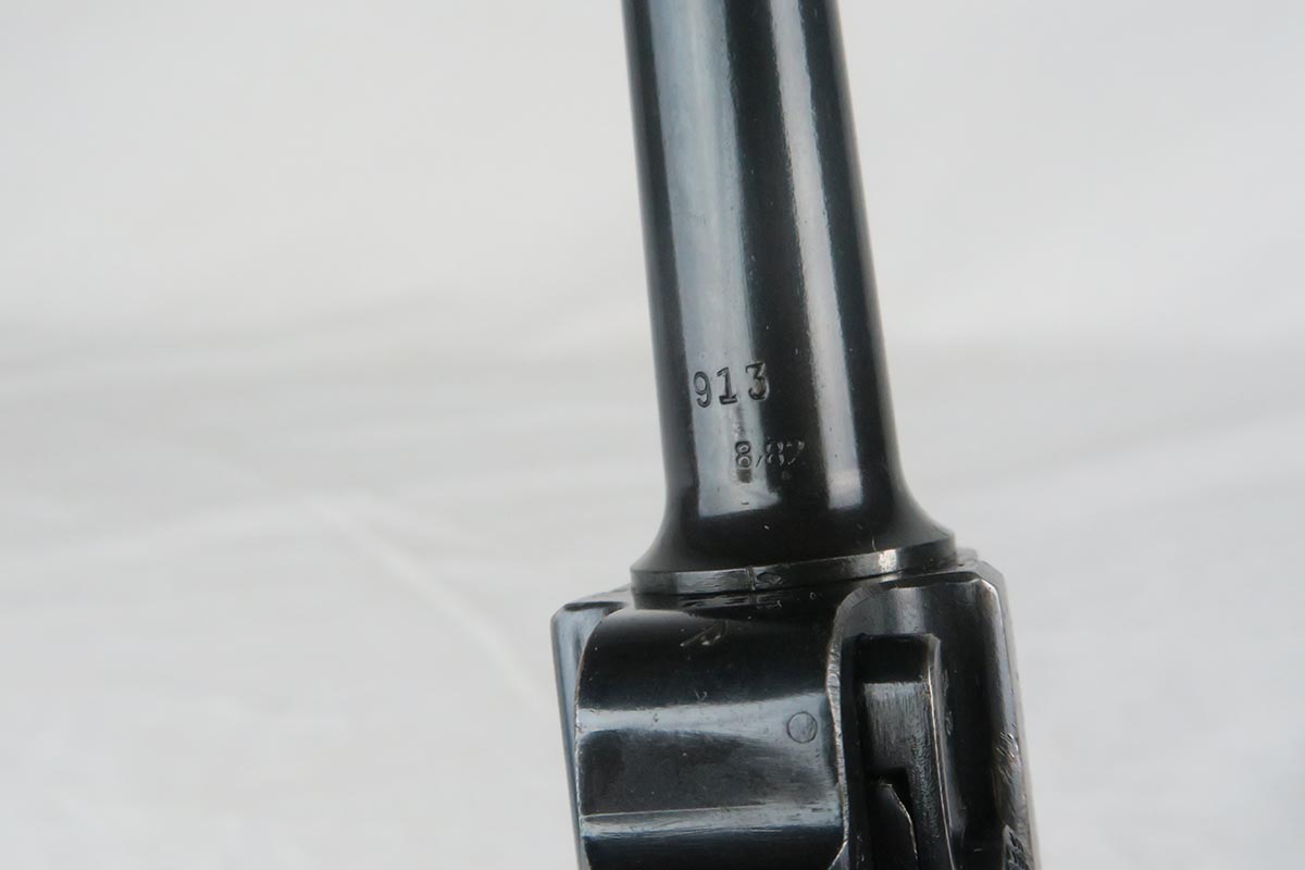 11/16/17 – The 1939 Luger was a bit unique as they made both the 42 code and S/42 codes. About 80k were made with the 42 Code. This gun is in the S suffix and has a 3 digit serial. The finish is all original and I would rate at about 92%. The only odd thing on the finish is that the ejector (on top) is unfinished but numbered to the gun. The grips are not numbered but appear to be original to the gun. All small parts have matching numbers. It comes with 2 matching mags, BUT the mags have been re-numbered. The S suffix and the eagle/63 look original, however you can see a “shadow” of a previous number on each magazine. It is mostly removed and then 913 stamped over the previous spot. Can’t say for sure when this was done. Certainly the Germans recycled magazines and could have been done by Mauser. However, it also could have been done more recently in order to boost the price. We are NOT pricing this luger as a two match mag gun. The luger also comes with a very nice 1939 dated holster. Only issue is a small hole in the front – most likely an adornment pin was removed at some point. Correct Eagle 63 tool in the pouch. Strong bore with minor frosting.
