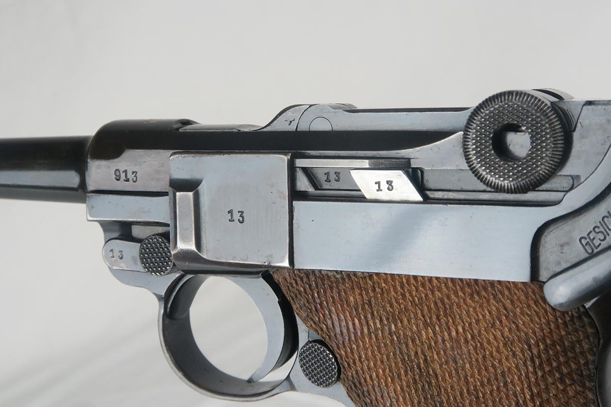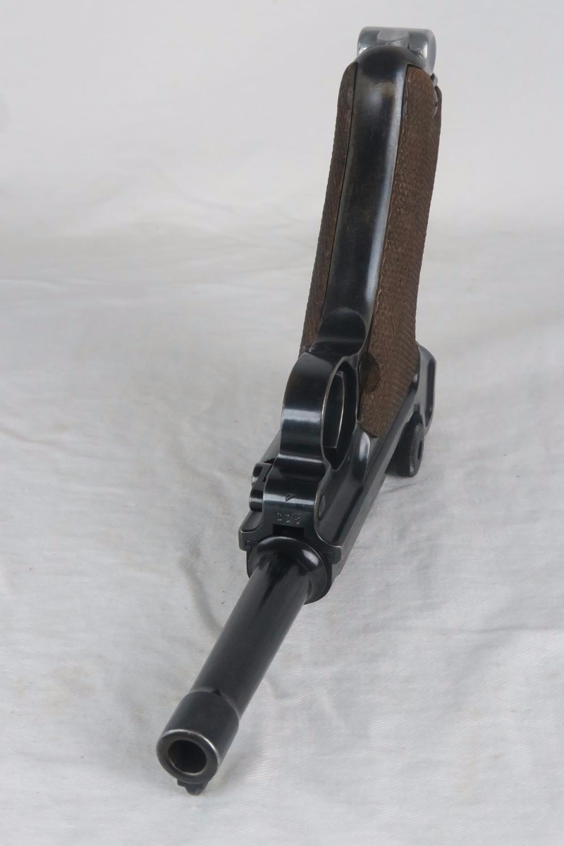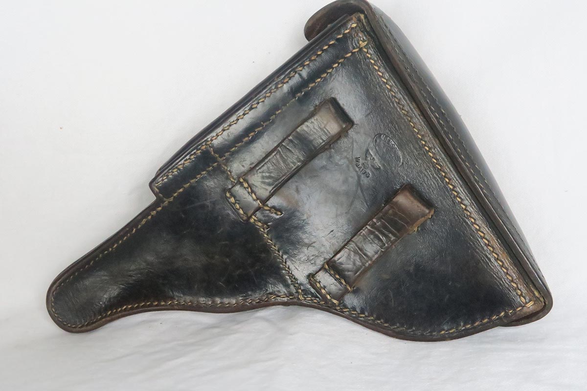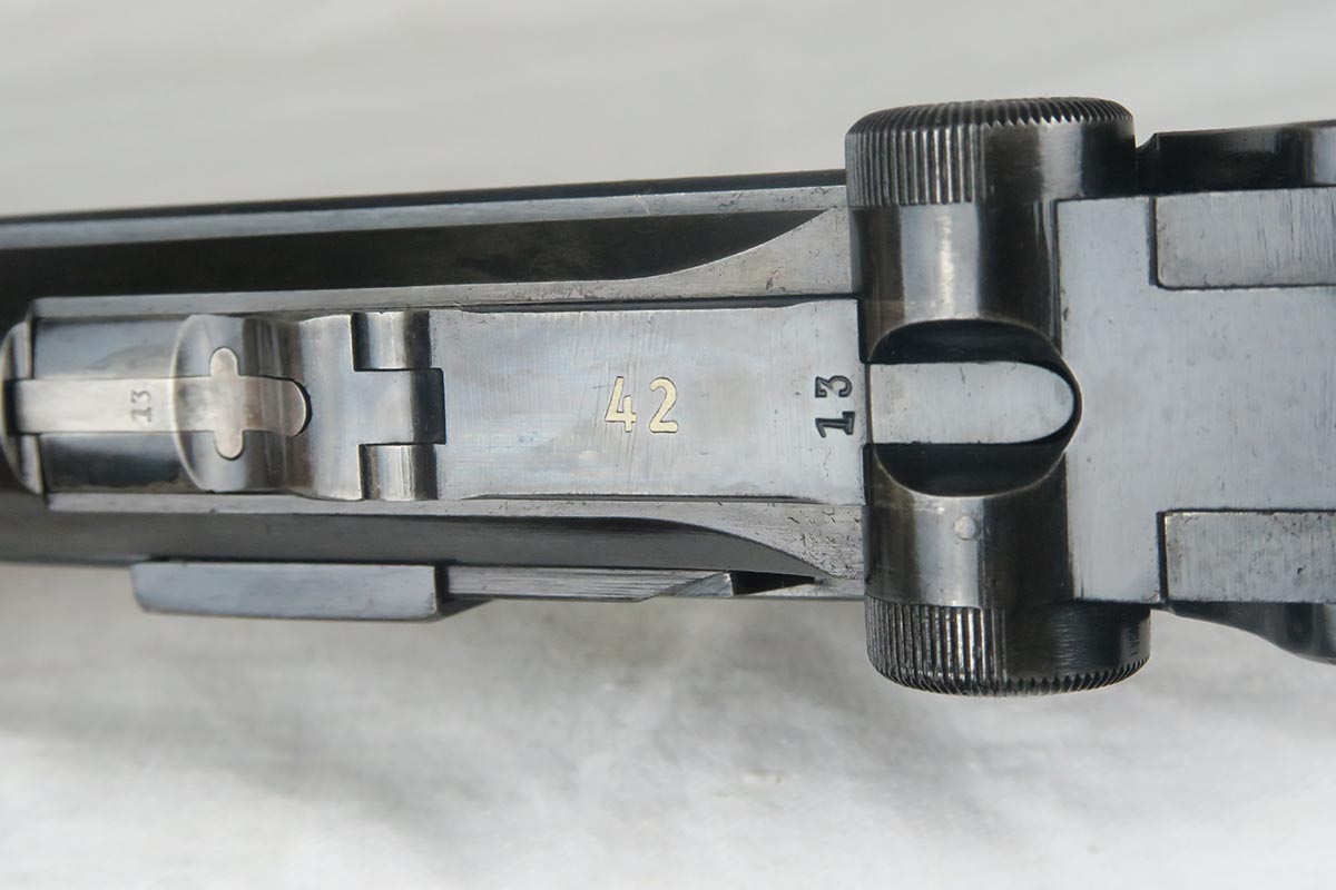 11/16/17 – The 1939 Luger was a bit unique as they made both the 42 code and S/42 codes. About 80k were made with the 42 Code. This gun is in the S suffix and has a 3 digit serial. The finish is all original and I would rate at about 92%. The only odd thing on the finish is that the ejector (on top) is unfinished but numbered to the gun. The grips are not numbered but appear to be original to the gun. All small parts have matching numbers. It comes with 2 matching mags, BUT the mags have been re-numbered. The S suffix and the eagle/63 look original, however you can see a “shadow” of a previous number on each magazine. It is mostly removed and then 913 stamped over the previous spot. Can’t say for sure when this was done. Certainly the Germans recycled magazines and could have been done by Mauser. However, it also could have been done more recently in order to boost the price. We are NOT pricing this luger as a two match mag gun. The luger also comes with a very nice 1939 dated holster. Only issue is a small hole in the front – most likely an adornment pin was removed at some point. Correct Eagle 63 tool in the pouch. Strong bore with minor frosting.