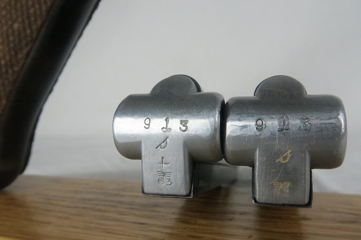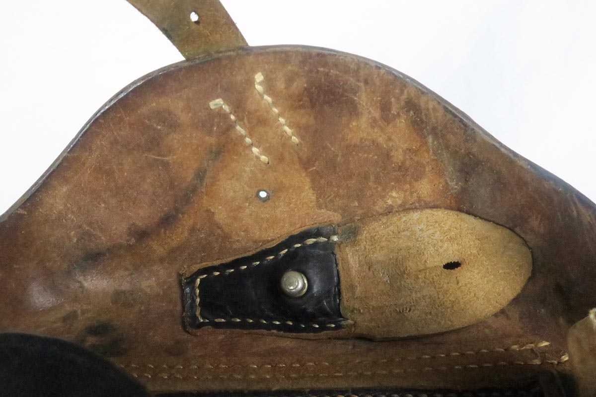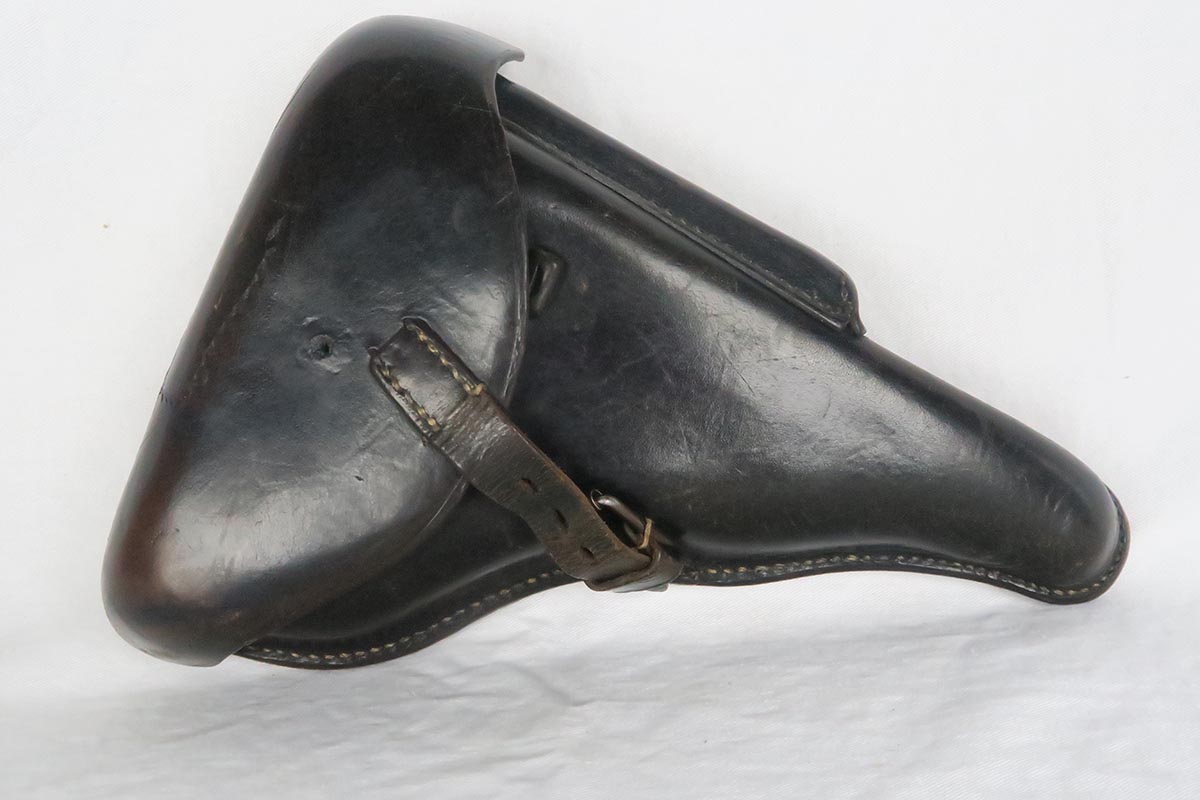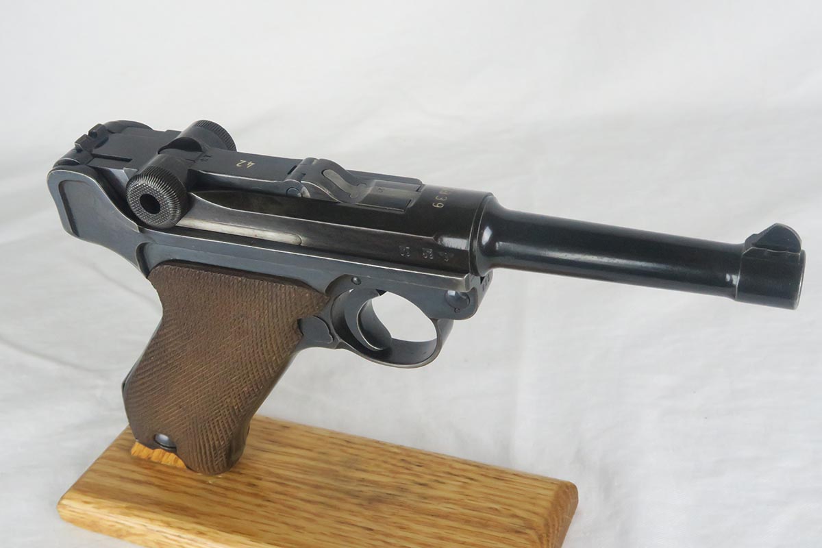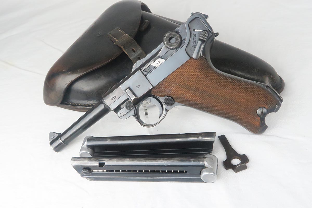 11/16/17 – The 1939 Luger was a bit unique as they made both the 42 code and S/42 codes. About 80k were made with the 42 Code. This gun is in the S suffix and has a 3 digit serial. The finish is all original and I would rate at about 92%. The only odd thing on the finish is that the ejector (on top) is unfinished but numbered to the gun. The grips are not numbered but appear to be original to the gun. All small parts have matching numbers. It comes with 2 matching mags, BUT the mags have been re-numbered. The S suffix and the eagle/63 look original, however you can see a “shadow” of a previous number on each magazine. It is mostly removed and then 913 stamped over the previous spot. Can’t say for sure when this was done. Certainly the Germans recycled magazines and could have been done by Mauser. However, it also could have been done more recently in order to boost the price. We are NOT pricing this luger as a two match mag gun. The luger also comes with a very nice 1939 dated holster. Only issue is a small hole in the front – most likely an adornment pin was removed at some point. Correct Eagle 63 tool in the pouch. Strong bore with minor frosting.
