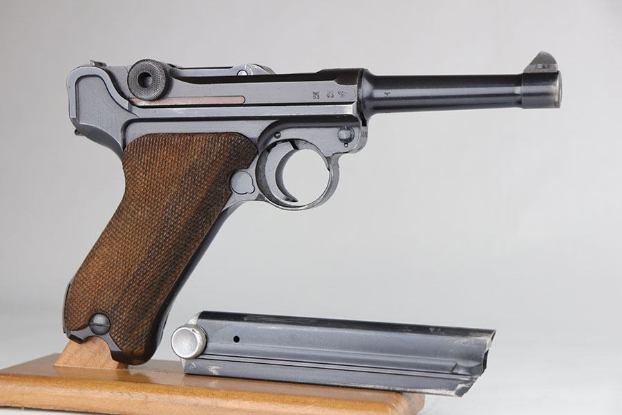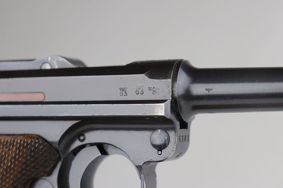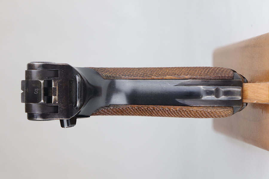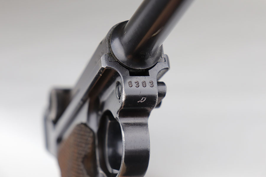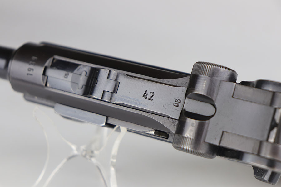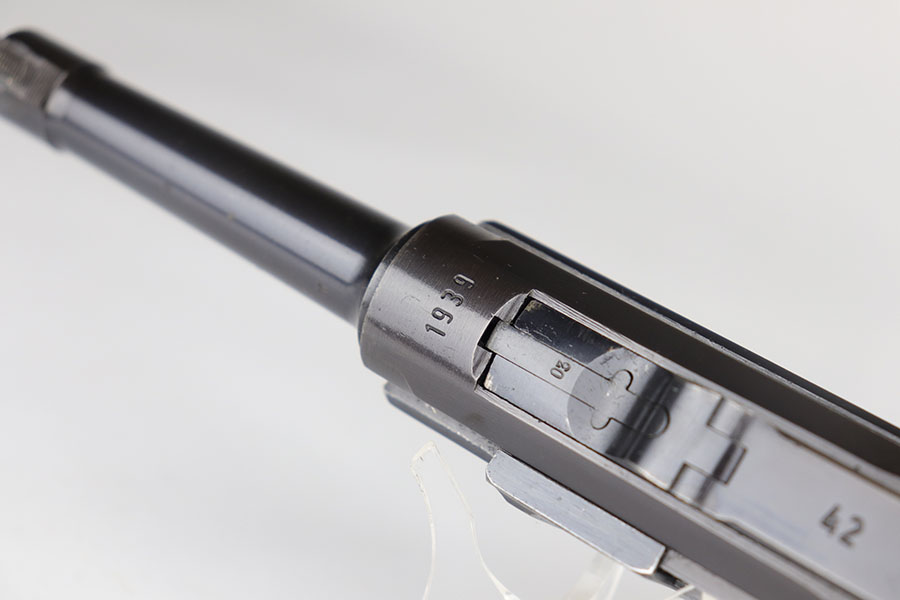 11/25/20 – This is a nice and honest example of a 1939 Mauser Luger with the original matching magazine and grips. The pistol has about 92-93% of the original blue with holster wear on the muzzle, sideplate, and bottom of front strap. There’s also several small, patterned spots of finish loss on the front strap. All matching numbers throughout. The original matching grips are in minty condition. Bore is shiny with strong rifling but just a bit of frost. Pistol comes with a rare ’42’ code takedown tool, and a 1940 dated holster. The holster doesn’t have any major defects but does show some obvious age and handling wear from the last 80 years. It also includes a spare magazine with mismatched serial that is not in the photos.