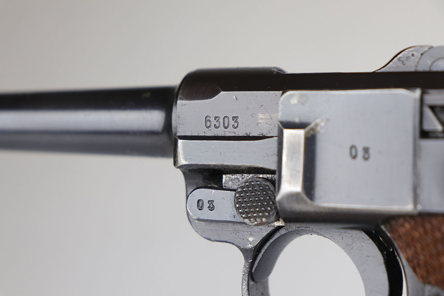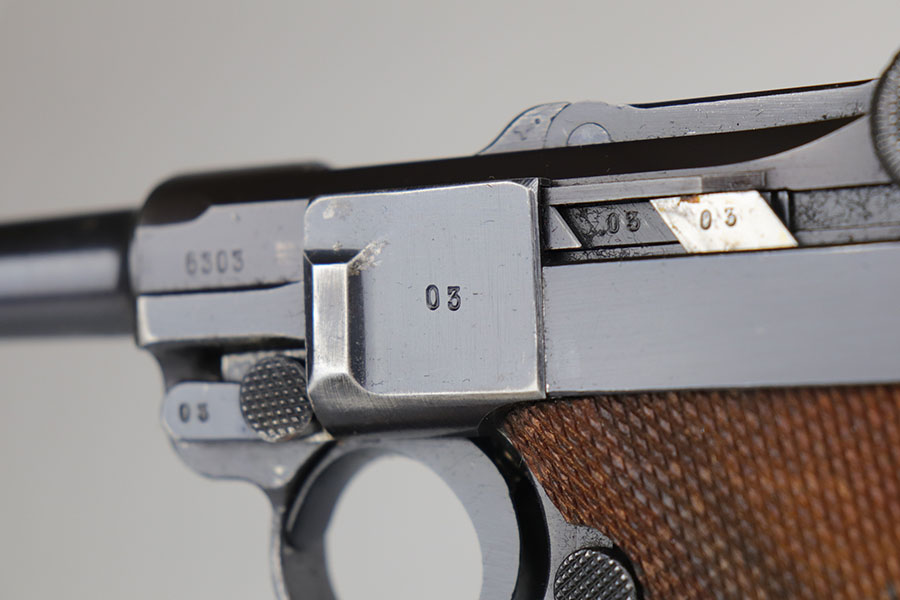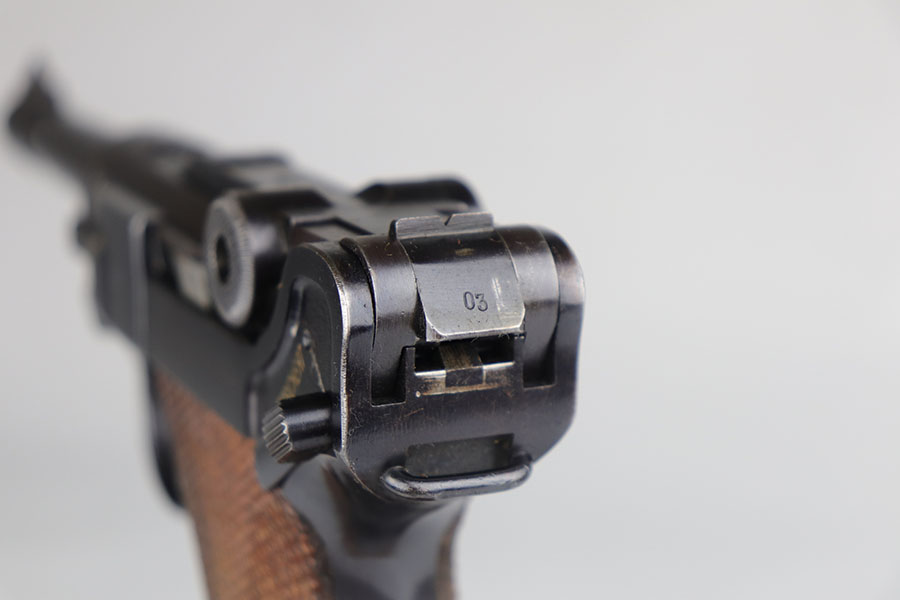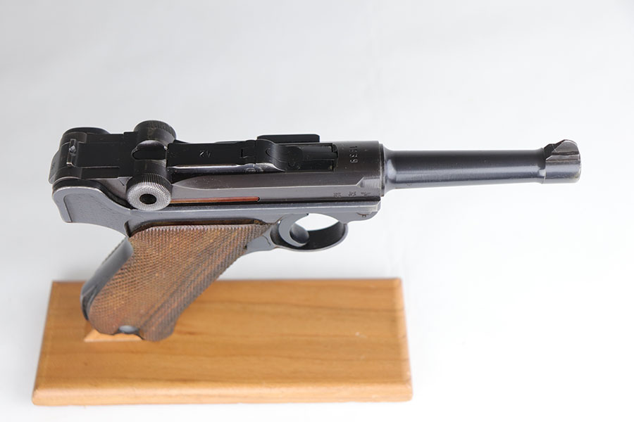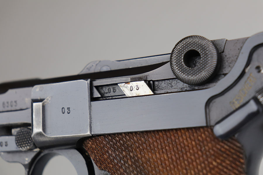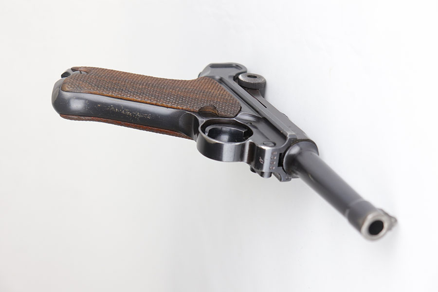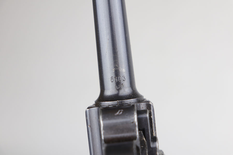 11/25/20 – This is a nice and honest example of a 1939 Mauser Luger with the original matching magazine and grips. The pistol has about 92-93% of the original blue with holster wear on the muzzle, sideplate, and bottom of front strap. There’s also several small, patterned spots of finish loss on the front strap. All matching numbers throughout. The original matching grips are in minty condition. Bore is shiny with strong rifling but just a bit of frost. Pistol comes with a rare ’42’ code takedown tool, and a 1940 dated holster. The holster doesn’t have any major defects but does show some obvious age and handling wear from the last 80 years. It also includes a spare magazine with mismatched serial that is not in the photos.