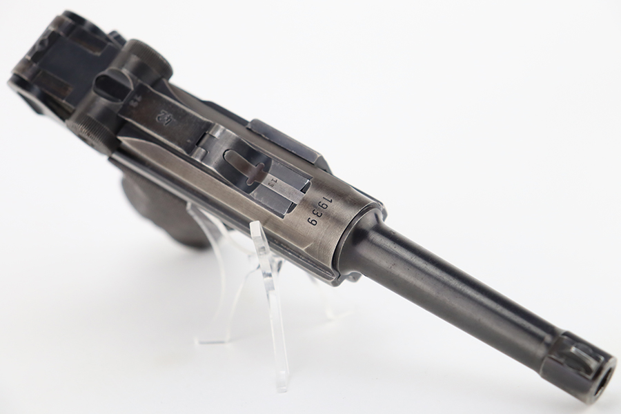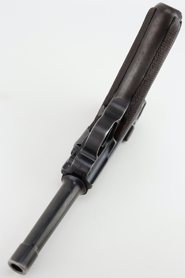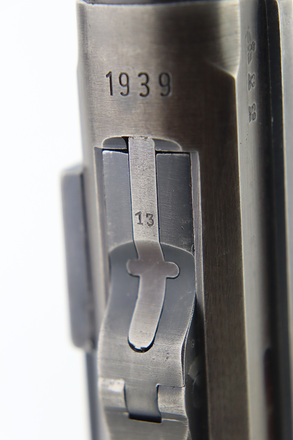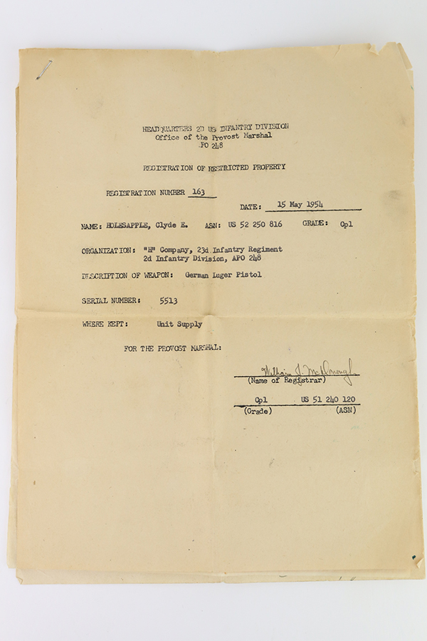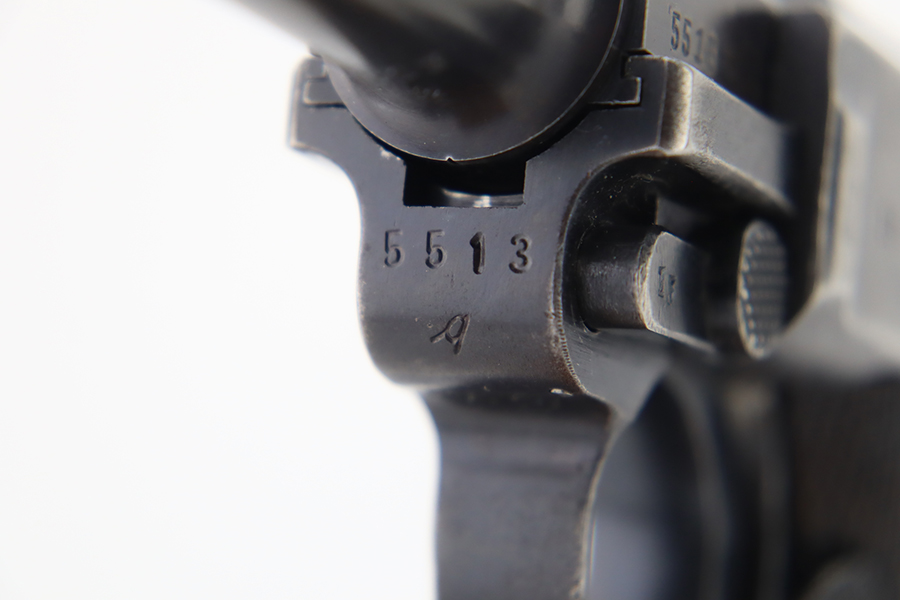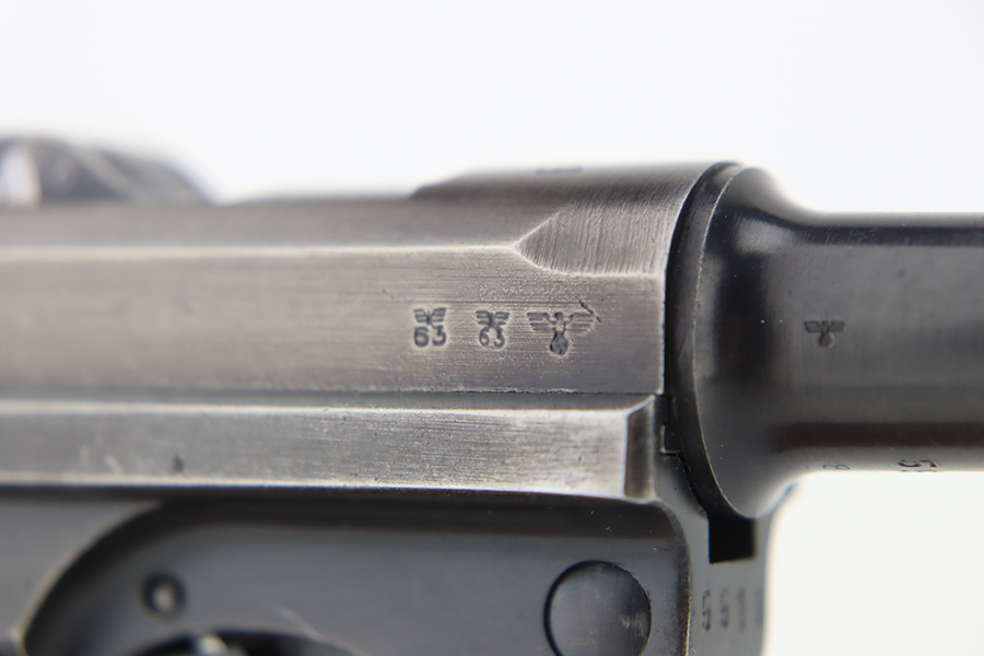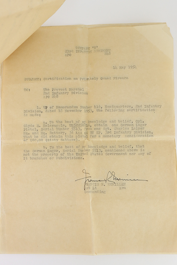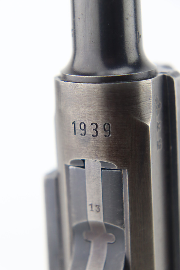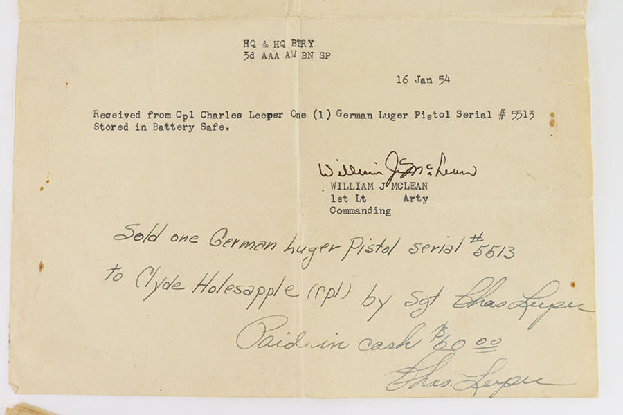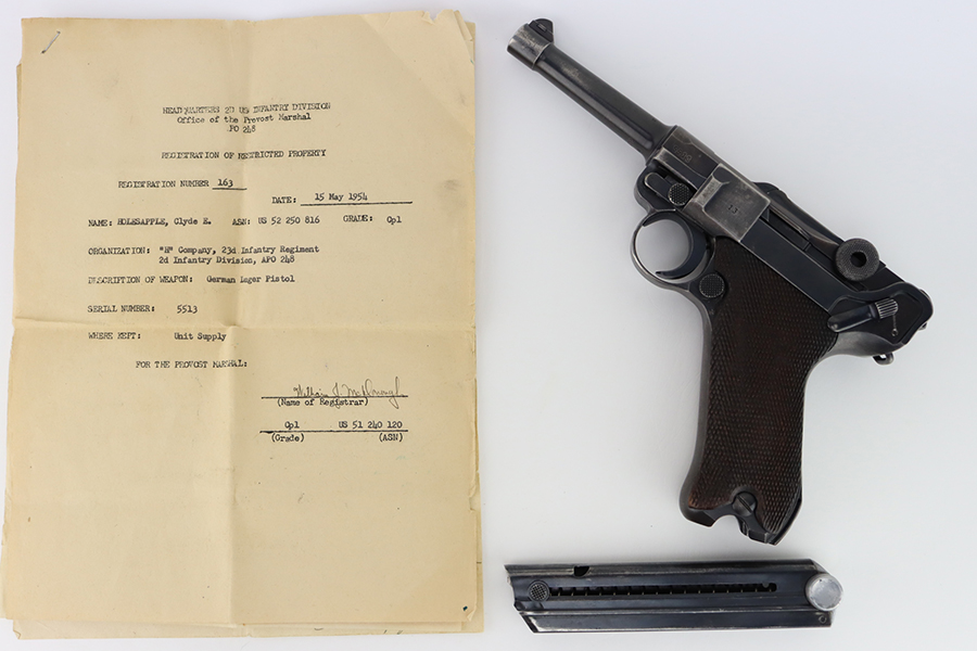 2/8/24 – This is a Mauser Luger issued to the Nazi military in 1939. It is all matching and has the proper “Eagle 63” military acceptance proofs. It has retained roughly 70% of its finish, with thinning along both grip straps. A couple areas of wear and pin pricking on the side plate and one the left side of the muzzle. Some minor finish loss along the barrel, and some general high edge wear. A bit of thinning along the toggle and where the receiver meets the barrel. Comes with several official U.S military documents showing the provenance of this gun, which establish that Corporal Clyde E. Holesapple legally purchased this from Sergeant Charles Leiper on May 14th, 1954. Comes with one correct but mismatched “Eagle 63” marked aluminum magazine.