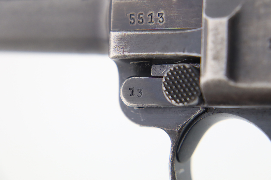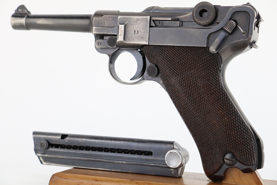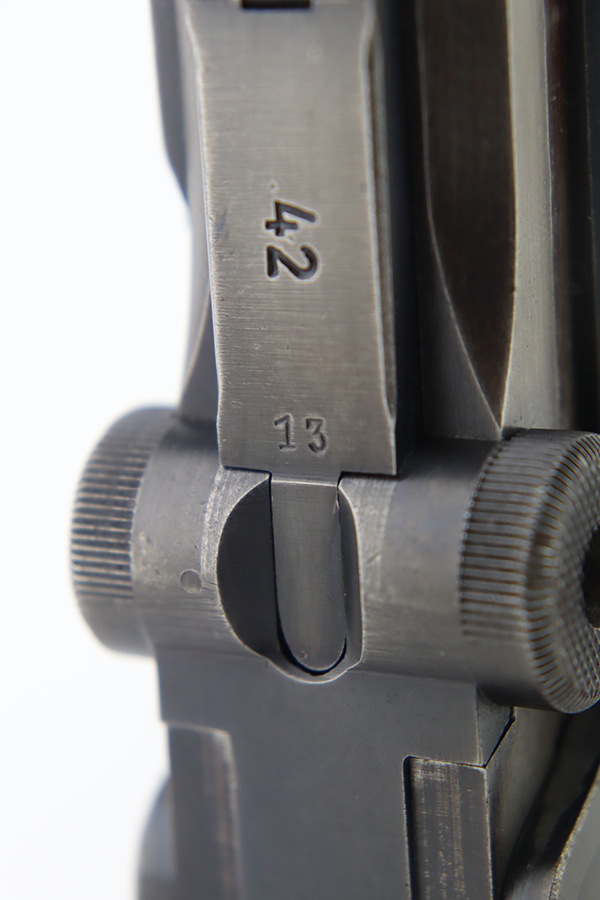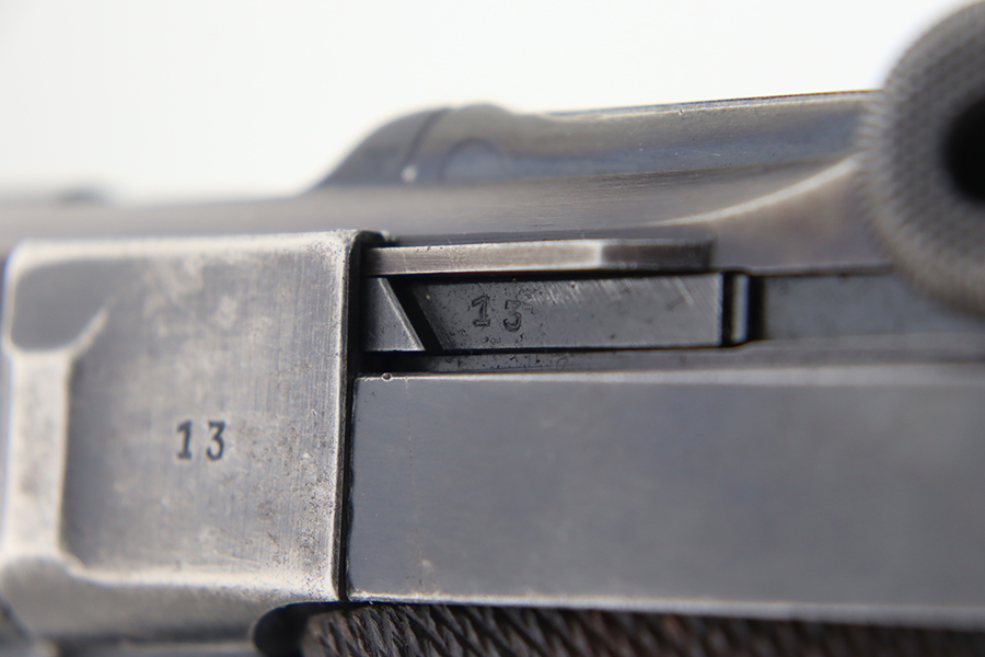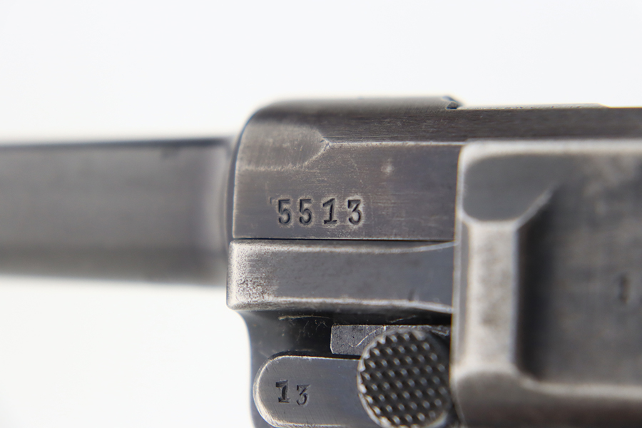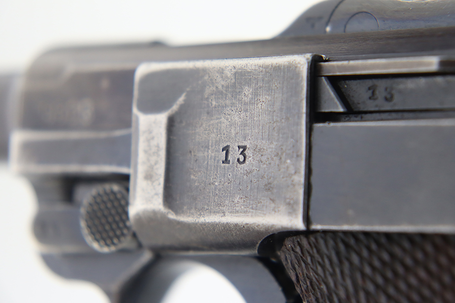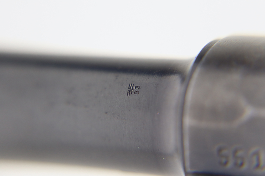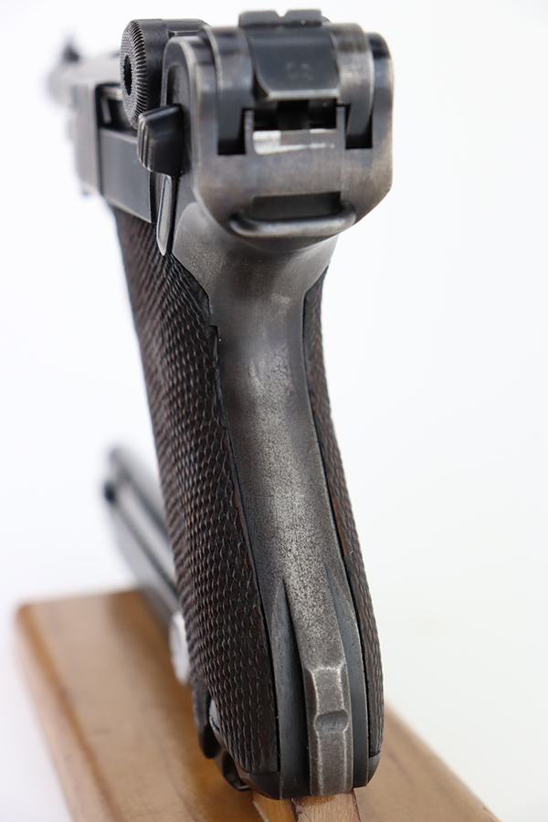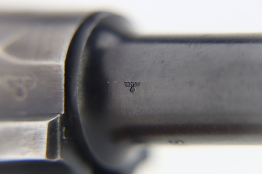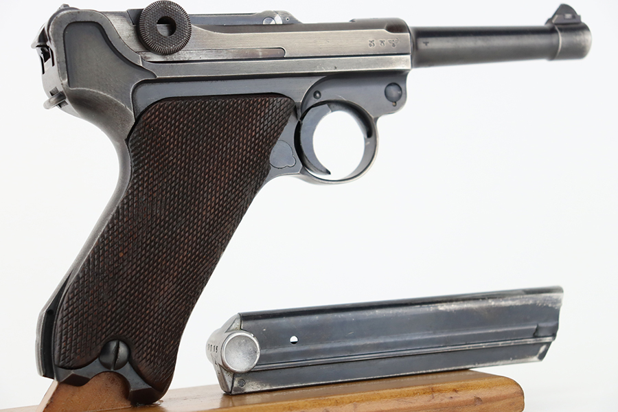 2/8/24 – This is a Mauser Luger issued to the Nazi military in 1939. It is all matching and has the proper “Eagle 63” military acceptance proofs. It has retained roughly 70% of its finish, with thinning along both grip straps. A couple areas of wear and pin pricking on the side plate and one the left side of the muzzle. Some minor finish loss along the barrel, and some general high edge wear. A bit of thinning along the toggle and where the receiver meets the barrel. Comes with several official U.S military documents showing the provenance of this gun, which establish that Corporal Clyde E. Holesapple legally purchased this from Sergeant Charles Leiper on May 14th, 1954. Comes with one correct but mismatched “Eagle 63” marked aluminum magazine.