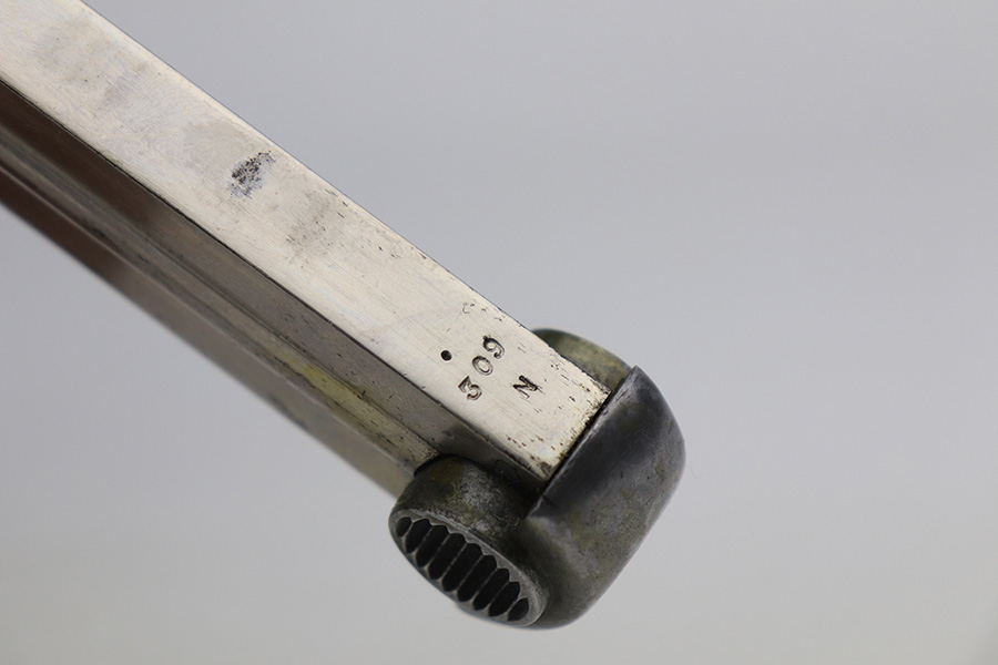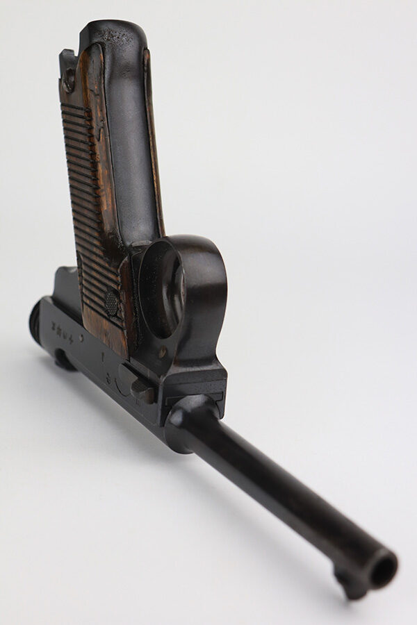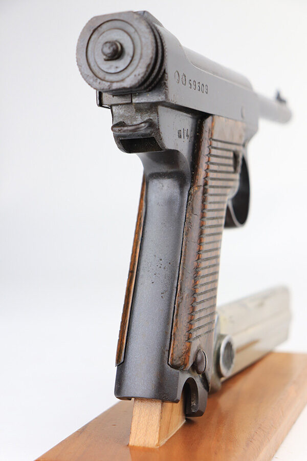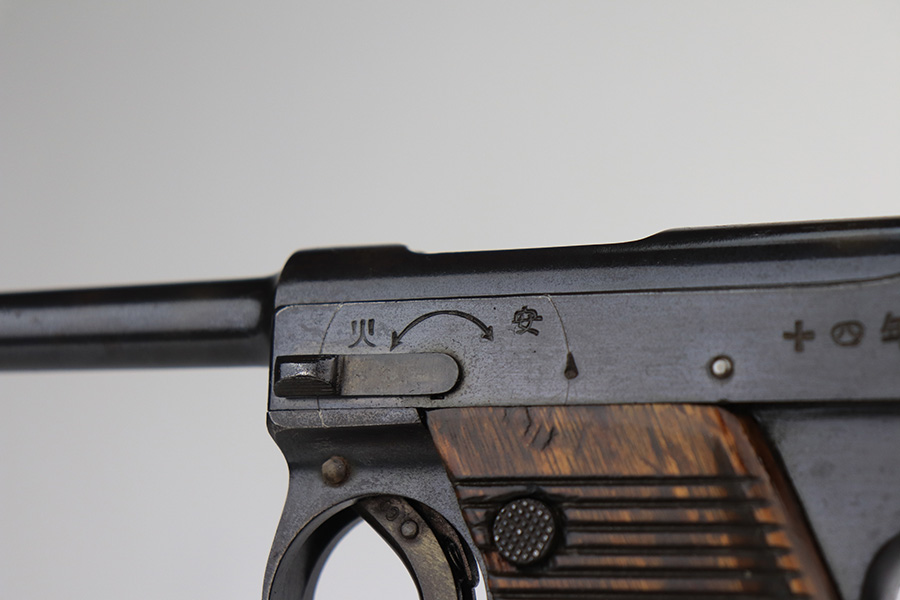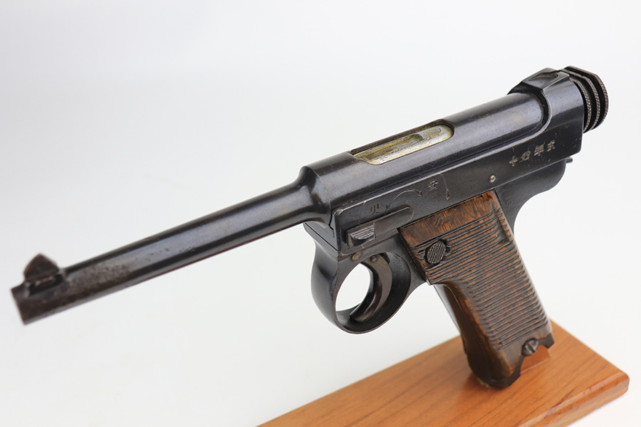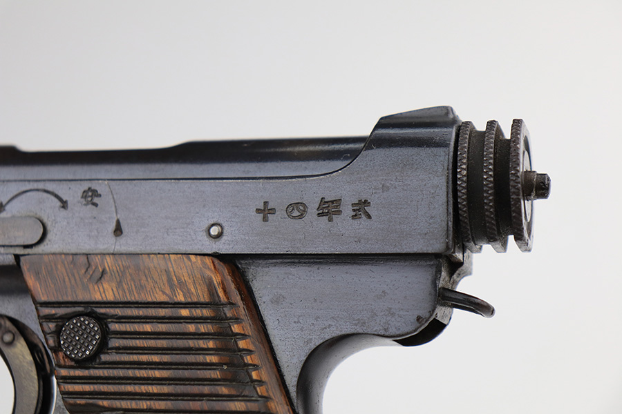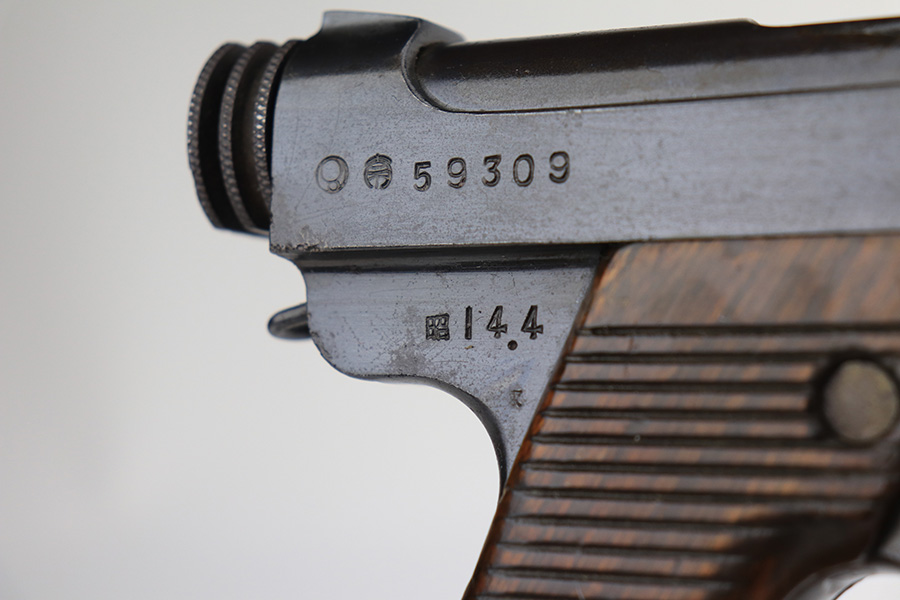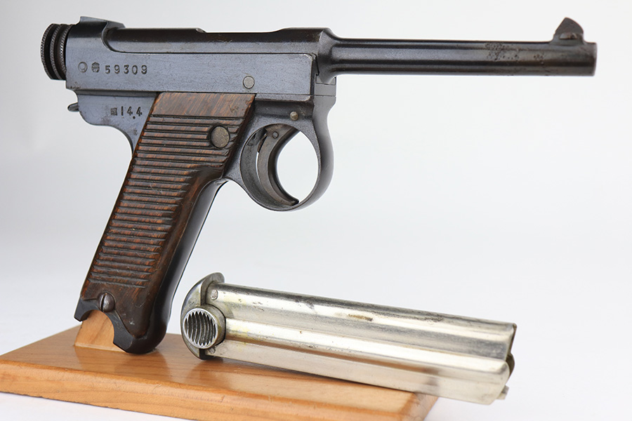 1/13/22 – This is an excellent example of a Nambu Type 14 issued to the Japanese military in April of 1939. The gun is all matching and comes with one original matching-numbered magazine. We believe the gun was re-blued a long time ago. In any case, the gun has retained about 97% of its finish. There are a few areas of discoloration along the top of the slide and on the barrel. While there is very little actual finish loss, there are tiny dots of oxidation throughout and areas of pitting around the muzzle and on both grip straps. Comes with period-correct wood grips that have been finished with a lacquer. There is one linear dent on the left grip panel. The bore is shiny and has good rifling.